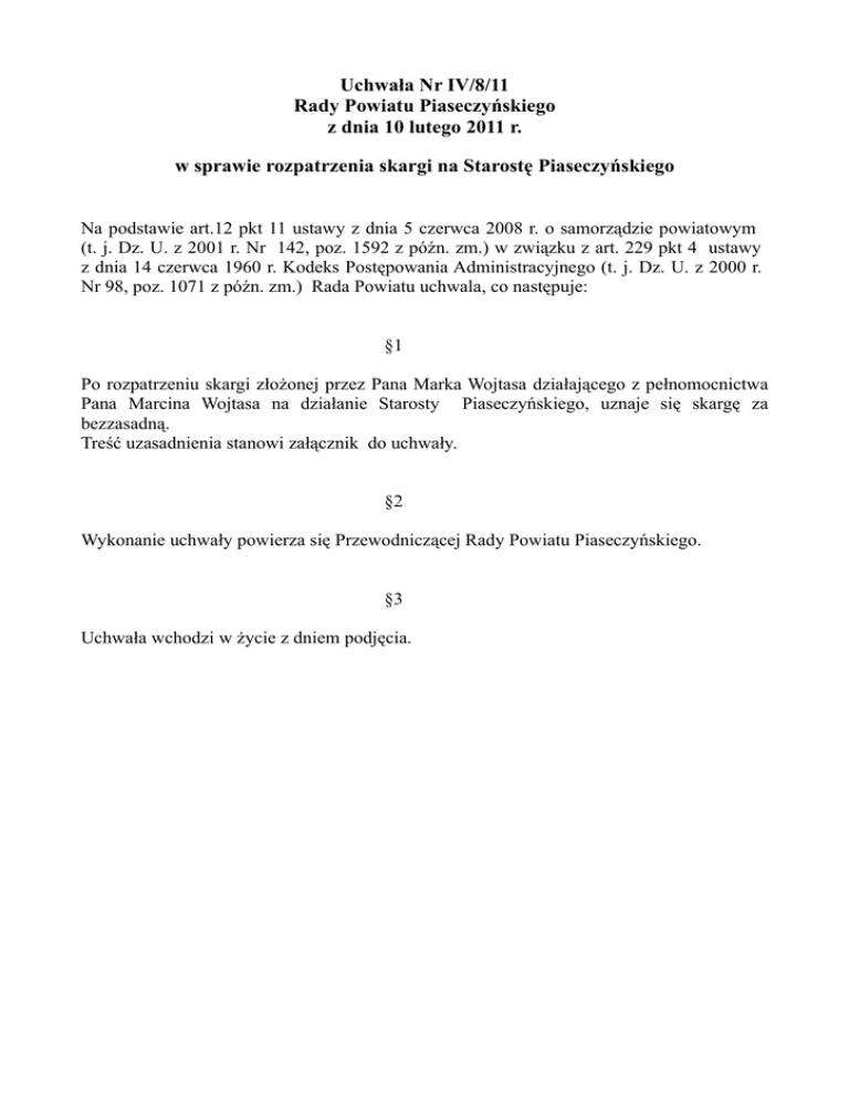 Uchwała Nr IV/8/11 Rady Powiatu Piaseczyńskiego z dnia 10 lutego 2011 r. w sprawie rozpatrzenia skargi na Starostę Piaseczyńskiego Na podstawie art.12 pkt 11 ustawy z dnia 5 czerwca 2008 r. o samorządzie powiatowym (t. j. Dz. U. z 2001 r. Nr 142, poz. 1592 z późn. zm.) w związku z art. 229 pkt 4 ustawy z dnia 14 czerwca 1960 r. Kodeks Postępowania Administracyjnego (t. j. Dz. U. z 2000 r. Nr 98, poz. 1071 z późn. zm.) Rada Powiatu uchwala, co następuje: §1 Po rozpatrzeniu skargi złożonej przez Pana Marka Wojtasa działającego z pełnomocnictwa Pana Marcina Wojtasa na działanie Starosty Piaseczyńskiego, uznaje się skargę za bezzasadną. Treść uzasadnienia stanowi załącznik do uchwały. §2 Wykonanie uchwały powierza się Przewodniczącej Rady Powiatu Piaseczyńskiego. §3 Uchwała wchodzi w życie z dniem podjęcia. Załącznik do uchwały nr IV /8/11 z dnia 10 lutego 2011 r. Uzasadnienie do uchwały w sprawie rozpatrzenia skargi na Starostę Piaseczyńskiego W dniu 24 listopada 2010 r. Pan Marek Wojtas działający z pełnomocnictwa Pana Marcina Wojtasa złożył do Rady Powiatu Piaseczyńskiego „zażalenie” ( w rozumieniu przepisu prawa skargę) na „nierozpatrzenie merytoryczne sprawy przez Starostę Piaseczyńskiego”. Treść skargi z uwagi na jej objętość jest do wglądu w Biurze Rady i Zarządu Powiatu. Pan M. Wojtas wniósł do Starosty Piaseczyńskiego w dniu 18 maja 2010 r. skargę na bezczynność oraz nierozpoznanie jego sprawy przez Powiatowego Rzecznika Konsumentów w Piasecznie oraz w dniu 2 września 2010 r. kolejną skargę do Starosty na niepodjęcie przez Rzecznika czynności prawnych i sądowych w jego sprawie z jednoczesnym wnioskiem o odwołanie Rzecznika W odpowiedzi na przedmiotowe skargi na Rzecznika Starosta Piaseczyński pismem z dnia 18 czerwca 2010 r., znak OOK.0551-10/10 oraz pismem z dnia 29 września 2010 r., znak jak w poprzednim piśmie stwierdził, iż po dokonaniu analizy czynności Rzecznika nie dopatrzył się uchybień w sposobie rozpatrzenia sprawy konsumenckiej i tym samym uznał skargi za bezzasadne. Za niezasadny Starosta uznał także wniosek Skarżącego o odwołanie Rzecznika. W związku ze stanowiskiem Starosty Piaseczyńskiego Skarżący złożył skargę do Rady Powiatu Piaseczyńskiego na Starostę. Po dokonaniu analizy czynności Starosty Piaseczyńskiego w tej sprawie oraz udzieleniu szczegółowych wyjaśnień przez Powiatowego Rzecznika Konsumentów należy uznać zarzuty podniesione przez Skarżącego za bezzasadne. Z wyjaśnień uzyskanych od Rzecznika Konsumentów wynika, iż w dniu 25 stycznia 2010 r. Pan Marcin Wojtas wystąpił z wnioskiem o wszczęcie postępowania przeciwko Firmie: ULTIMO PORTFOLIO INVESTMENT S. A. z Wrocławia w związku z windykacją należności z tytułu zaciągniętego kredytu przez Konsumenta na zakup samochodu. Pan Wojtas zarzucił firmie naruszenie treści Ugody zawartej pomiędzy nim a Polskim Towarzystwem Finansowym S.A. Zdaniem Konsumenta Spółka złamała postanowienie § 5 Ugody o brzmieniu „Zmiana treści niniejszej Ugody dla swojej ważności wymaga formy pisemnego aneksu”. Działając w imieniu i na rzecz Konsumenta na podstawie art. 42 ust. 1 pkt 3 ustawy z dnia 16 lutego 2007 r. o ochronie konkurencji i konsumentów (Dz. U. Nr 50, poz. 331 ze zmianami) Rzecznik wystąpił do Spółki pismem znak:RKO.6341-53/10 z dnia 15 lutego 2010 r., z prośbą o zajęcie stanowiska w przedmiotowej sprawie. W odpowiedzi Przedsiębiorca pismem: L. dz. DOK/1597/10/3 z dnia 22 lutego 2010r. poinformował, iż cesja wierzytelności z tytułu kredytu samochodowego nie stanowi naruszenia zapisu Ugody dotyczącego obowiązku dokonania zmian jej postanowień wyłącznie w formie pisemnej . Firma poinformowała, że Konsument był poinformowany o przelewie wierzytelności oraz zaniechał wpłat na poczet zadłużenia, zatem zgodnie z Ugodą cała pozostała niezapłacona kwota wierzytelności stała się natychmiast wymagalna (§ 3 Ugody). W dniu 4 marca 2010 r. Rzecznik poinformował Konsumenta o stanowisku Firmy ULTIMO, a także poinformował go czym jest cesja wierzytelności oraz, że może ona nastąpić bez zgody dłużnika a jeżeli wierzytelność jest stwierdzona pisemnie jej przelew powinien być także stwierdzony formą pisemną. Rzecznik poinformował także Konsumenta, że cesjonariusz nie ma uprawnień komorniczych oraz egzekucyjnych, a jego możliwości są takie same jak pierwotnego wierzyciela. W zakończeniu pisma Rzecznik poprosił o kontakt w przypadku jeśli Konsument uważa, że wniesiona przez niego sprawa w dalszym ciągu wymaga zainteresowania Rzecznika. Pismem z dnia 11 marca 2010 r., (data wpływu do Urzędu 15 marca 2010r.) Pan Wojtas ponownie wystąpił do Rzecznika o udzielenie odpowiedzi w formie stanowiska, podtrzymując swoje dotychczasowe stanowisko w sprawie. Ponadto zarzucił Spółce uniemożliwienie dokonywania wpłat poprzez zmianę konta. W dniu 8 kwietnia 2010 r. Rzecznik ponownie wystąpił do Przedsiębiorcy w przedmiotowej sprawie. W odpowiedzi pismem z dnia 21 kwietnia 2010 r. L. dz. DOK/3454/10/03 Spółka poinformowała, iż Pan Wojtas zaniechał spłaty kredytu dnia 13 kwietnia 2005 r., zaś w okresie od lipca 2005 r. do marca 2006 r. podjął spłatę zadłużenia, dokonując wpłat ośmiu rat. Wpłaty zostały dokonane na rzecz banku, który przekazał kwoty Firmie ULTIMO. Spółka powtórzyła, że Konsument został poinformowany o przelewie wierzytelności pisemnie przez cesjonariusza, jak i cedenta oraz o zmianie numeru konta. Trudno zatem uznać, aby przedsiębiorca uniemożliwił dokonywanie wpłat. Jako fakt potwierdzający skuteczność doręczenia świadczy napisanie przez Konsumenta do wierzyciela pisma z dnia 14 listopada 2005 r.. Po przeanalizowaniu sprawy Rzecznik Konsumentów pismem z dnia 10 maja 2010 r. zajął stanowisko w niniejszej sprawie informując Konsumenta o cesji oraz zasadach jej dokonywania. Rzecznik p