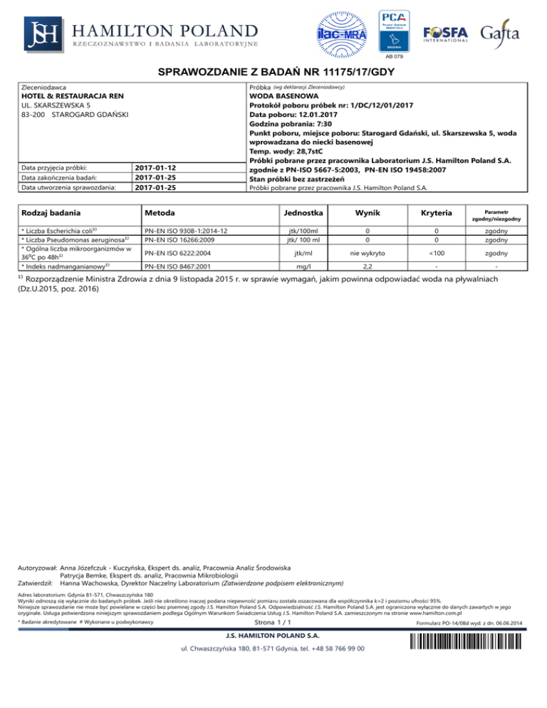 SPRAWOZDANIE Z BADAŃ NR 11175/17/GDY (wgwymagań, deklaracji Zleceniodawcy) ¹⁾Zleceniodawca Rozporządzenie Ministra Zdrowia z dnia 9 listopada 2015 r. w Próbka sprawie jakim powinna odpowiadać woda na pływalniach HOTEL & RESTAURACJA REN WODA BASENOWA (Dz.U.2015, poz. 2016) UL. SKARSZEWSKA 5 83-200 STAROGARD GDAŃSKI Data przyjęcia próbki: Data zakończenia badań: Data utworzenia sprawozdania: Protokół poboru próbek nr: 1/DC/12/01/2017 Data poboru: 12.01.2017 Godzina pobrania: 7:30 Punkt poboru, miejsce poboru: Starogard Gdański, ul. Skarszewska 5, woda wprowadzana do niecki basenowej Temp. wody: 28,7stC Próbki pobrane przez pracownika Laboratorium J.S. Hamilton Poland S.A. zgodnie z PN-ISO 5667-5:2003, PN-EN ISO 19458:2007 Stan próbki bez zastrzeżeń 2017-01-12 2017-01-25 2017-01-25 Próbki pobrane przez pracownika J.S. Hamilton Poland S.A. Rodzaj badania Metoda Jednostka Wynik Kryteria Parametr zgodny/niezgodny * Liczba Escherichia coli¹⁾ * Liczba Pseudomonas aeruginosa¹⁾ * Ogólna liczba mikroorganizmów w 36⁰C po 48h¹⁾ * Indeks nadmanganianowy¹⁾ PN-EN ISO 9308-1:2014-12 PN-EN ISO 16266:2009 jtk/100ml jtk/ 100 ml 0 0 0 0 zgodny zgodny PN-EN ISO 6222:2004 jtk/ml nie wykryto <100 zgodny PN-EN ISO 8467:2001 mg/l 2,2 - - ¹⁾ Rozporządzenie Ministra Zdrowia z dnia 9 listopada 2015 r. w sprawie wymagań, jakim powinna odpowiadać woda na pływalniach (Dz.U.2015, poz. 2016) Autoryzował: Anna Józefczuk - Kuczyńska, Ekspert ds. analiz, Pracownia Analiz Środowiska Patrycja Bemke, Ekspert ds. analiz, Pracownia Mikrobiologii Zatwierdził: Hanna Wachowska, Dyrektor Naczelny Laboratorium (Zatwierdzone podpisem elektronicznym) Adres laboratorium: Gdynia 81-571, Chwaszczyńska 180 Wyniki odnoszą się wyłącznie do badanych próbek. Jeśli nie określono inaczej podana niepewność pomiaru została oszacowana dla współczynnika k=2 i poziomu ufności 95%. Niniejsze sprawozdanie nie może być powielane w części bez pisemnej zgody J.S. Hamilton Poland S.A. Odpowiedzialność J.S. Hamilton Poland S.A. jest ograniczona wyłącznie do danych zawartych w jego oryginale. Usługa potwierdzona niniejszym sprawozdaniem podlega Ogólnym Warunkom Świadczenia Usług J.S. Hamilton Poland S.A. zamieszczonym na stronie www.hamilton.com.pl * Badanie akredytowane # Wykonane u podwykonawcy Strona 1 / 1 J.S. HAMILTON POLAND S.A. ul. Chwaszczyńska 180, 81-571 Gdynia, tel. +48 58 766 99 00 Formularz PO-14/08d wyd. z dn. 06.06.2014