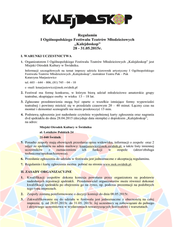 Regulamin I Ogólnopolskiego Festiwalu Teatrów Młodzieżowych „Kalejdoskop” 28 - 31.05.2015r. I. WARUNKI UCZESTNICTWA 1. Organizatorem I Ogólnopolskiego Festiwalu Teatrów Młodzieżowych „Kalejdoskop” jest Miejski Ośrodek Kultury w Świdniku. Informacji szczegółowych na temat imprezy udziela kierownik artystyczny I Ogólnopolskiego Festiwalu Teatrów Młodzieżowych „Kalejdoskop”, instruktor Teatru Puk – Puk Katarzyna Marjasiewicz tel. 603 – 644 – 806, (81) 745 – 04 - 10 e -mail: [email protected] 2. Festiwal ma formę konkursu, w którym biorą udział młodzieżowe amatorskie grupy teatralne, skupiające osoby w wieku 13 – 18 lat. 3. Zgłaszane przedstawienia mogą być oparte o wszelkie istniejące formy wypowiedzi teatralnej i powinny mieścić się w przedziale czasowym 20 – 40 minut. Łączny czas na montaż i demontaż scenografii nie może przekroczyć 15 min. 4. Podstawą zgłoszenia jest nadesłanie czytelnie wypełnionej karty zgłoszenia oraz nagrania dvd spektaklu do dnia 28.04.2015 (decyduje data stempla) z dopiskiem „Kalejdoskop”, na adres: Miejski Ośrodek Kultury w Świdniku al. Lotników Polskich 24 21-040 Świdnik 5. Ponadto zespoły mają obowiązek przesłania opisu widowiska, informacji o zespole oraz 2 zdjęć ze spektaklu na adres mailowy: [email protected], a także listy imiennej uczestników z zaznaczeniem ich funkcji w zespole (aktor/obsługa techniczna/opiekun/kierowca). 6. Przesłanie zgłoszenia do udziału w festiwalu jest jednoznaczne z akceptacją regulaminu. 7. Regulamin i kartę zgłoszenia można pobrać na stronie www.mok.swidnik.pl. II. ZASADY ORGANIZACYJNE 1. Kwalifikacji zespołów dokona komisja powołana przez organizatora na podstawie nadesłanych rejestracji spektakli. Przedstawiciel organizatorów może również dokonać kwalifikacji spektaklu po obejrzeniu go na żywo, np. podczas prezentacji na podobnych tego typu imprezach. 2. Zespoły zostaną poinformowane o decyzji komisji do dnia 08.05.2015r. 3. Zakwalifikowanie się do udziału w festiwalu jest jednoznaczne z obecnością na całej imprezie, tj. od 28.05.2015r. do 31.05. 2015r. Jej uczestnicy są zobowiązani do pełnego i aktywnego uczestnictwa w wydarzeniach towarzyszących festiwalowi i warsztatach. 4. Zespoły przyjeżdżają pod opieką instruktora z obowiązującymi przepisami prawnymi). lub opiekuna grupy (zgodnie 5. Zakwalifikowane zespoły wpłacają akredytację w wysokości 170 zł/os. na konto organizatora: Bank PKO BP 21 1020 3176 0000 5602 0083 3350 do dn. 13.05.2015r. W treści przelewu prosimy wpisać „Akredytacja Kalejdoskop+nazwa teatru+ ilość osób”. 6. Organizator w ramach akredytacji zapewnia 3 noclegi: 28/29.05.2015r., 29/30.05.2015r., 30/31.05.2015r. oraz posiłki obiad i kolację w dn. 28.05.2015r., całodzienne wyżywienie w dn. 29 – 30.05.2015r., śniadanie i obiad w dn. 31.05.2015r. 7. Koszty związane z przyjazdem zespołu oraz przemieszczaniem się od punktu noclegowego do miejsca festiwalu ponosi instytucja zgłaszająca. 8. Zespoły zakwalifikowane do dnia 11.05.2015r. zobowiązane są potwierdzić swoją obecność na festiwalu. W przypadku rezygnacji, do udziału w imprezie zostanie zaproszony teatr z listy rezerwowej. 9. W momencie wycofania się z udziału w festiwalu po wpłaceniu akredytacji i zgłoszeniu tego faktu organizatorowi, środki wpłacone z tego tytułu zostają zwrócone zespołowi, chyba, że fakt ten zaistnieje po dn.18.05.2015r. Wówczas organizator nie zwraca wpłaconej akredytacji. 10. Zakwalifikowane teatry otrzymają szczegółowy program z uwzględnieniem kolejności prezentacji konkursowych, występów zaproszonych gości, warsztatów. 11. Organizator zapewnia nagłośnienie, oświetlenie i obsługę techniczną. Nie zapewnia się natomiast elementów scenograficznych. Prezentacje odbędą się na scenie bez podwyższenia o wymiarach: 11m (szerokość) x 4,7 m (głębokość). 12. Uczestnicy festiwalu bezpłatnie uczestniczą w prezentacjach konkursowych, warsztatach omówieniach spektakli. 13. Organizatorzy zastrzegają sobie prawo do wykorzystywania materiałów zarejestrowanych dowolnymi technikami podczas prezentacji konkursowych i warsztatów oraz spotkań integracyjnych w celach promocji festiwalu. 14. Wszelkie szkody materialne powstałe w czasie trwania spektaklu lub podczas montażu i demontażu dekoracji oraz pobytu w miejscu zakwaterowania, wynikłe z winy występującego zespołu, pokrywane będą przez dany zespół. 15. Organizator zastrzega sobie prawo do własnej interpretacji regulaminu. III. JURY I NAGRODY FESTIWALOWE 1. Prezentowane podczas festiwalu spektakle oceniać będzie jury powołane przez organizatorów, które przyzna nagrody i wyróżnienia. 2. Ogólna pula nagród wynosi 6000 zł. Laureaci otrzymują dyplomy, statuetki, nagrody finansowe i rzeczowe. O ostatecznym podziale nagród decyduje jury. 3. Jury oceniać będzie m.in.: dobór repertuaru, adekwatność formy do przekazywanych treści oraz oryginalność scenicznej wypowiedzi. Dofinansowano ze środków Ministra Kultury i Dziedzictwa Narodowego.