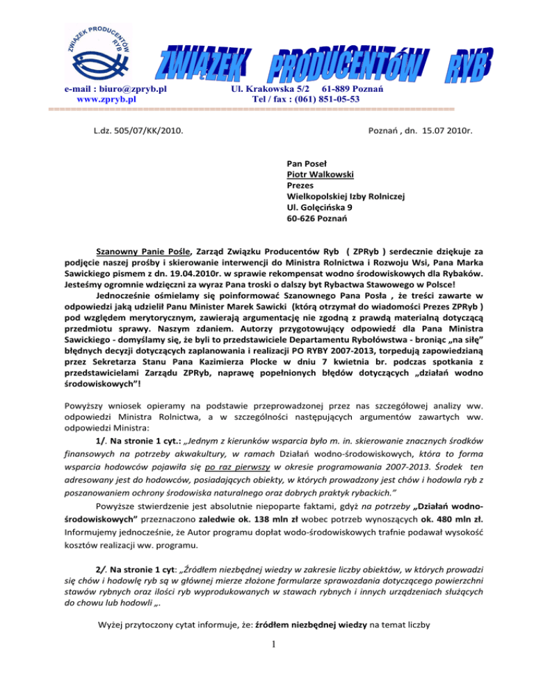 e-mail : [email protected] Ul. Krakowska 5/2 61-889 Poznań www.zpryb.pl Tel / fax : (061) 851-05-53 ========================================================================= L.dz. 505/07/KK/2010. Poznań , dn. 15.07 2010r. Pan Poseł Piotr Walkowski Prezes Wielkopolskiej Izby Rolniczej Ul. Golęcińska 9 60-626 Poznań Szanowny Panie Pośle, Zarząd Związku Producentów Ryb ( ZPRyb ) serdecznie dziękuje za podjęcie naszej prośby i skierowanie interwencji do Ministra Rolnictwa i Rozwoju Wsi, Pana Marka Sawickiego pismem z dn. 19.04.2010r. w sprawie rekompensat wodno środowiskowych dla Rybaków. Jesteśmy ogromnie wdzięczni za wyraz Pana troski o dalszy byt Rybactwa Stawowego w Polsce! Jednocześnie ośmielamy się poinformować Szanownego Pana Posła , że treści zawarte w odpowiedzi jaką udzielił Panu Minister Marek Sawicki (którą otrzymał do wiadomości Prezes ZPRyb ) pod względem merytorycznym, zawierają argumentację nie zgodną z prawdą materialną dotyczącą przedmiotu sprawy. Naszym zdaniem. Autorzy przygotowujący odpowiedź dla Pana Ministra Sawickiego - domyślamy się, że byli to przedstawiciele Departamentu Rybołówstwa - broniąc „na siłę” błędnych decyzji dotyczących zaplanowania i realizacji PO RYBY 2007-2013, torpedują zapowiedzianą przez Sekretarza Stanu Pana Kazimierza Plocke w dniu 7 kwietnia br. podczas spotkania z przedstawicielami Zarządu ZPRyb, naprawę popełnionych błędów dotyczących „działań wodno środowiskowych”! Powyższy wniosek opieramy na podstawie przeprowadzonej przez nas szczegółowej analizy ww. odpowiedzi Ministra Rolnictwa, a w szczególności następujących argumentów zawartych ww. odpowiedzi Ministra: 1/. Na stronie 1 cyt.: „Jednym z kierunków wsparcia było m. in. skierowanie znacznych środków finansowych na potrzeby akwakultury, w ramach Działań wodno-środowiskowych, która to forma wsparcia hodowców pojawiła się po raz pierwszy w okresie programowania 2007-2013. Środek ten adresowany jest do hodowców, posiadających obiekty, w których prowadzony jest chów i hodowla ryb z poszanowaniem ochrony środowiska naturalnego oraz dobrych praktyk rybackich.” Powyższe stwierdzenie jest absolutnie niepoparte faktami, gdyż na potrzeby „Działań wodnośrodowiskowych” przeznaczono zaledwie ok. 138 mln zł wobec potrzeb wynoszących ok. 480 mln zł. Informujemy jednocześnie, że Autor programu dopłat wodo-środowiskowych trafnie podawał wysokość kosztów realizacji ww. programu. 2/. Na stronie 1 cyt: „Źródłem niezbędnej wiedzy w zakresie liczby obiektów, w których prowadzi się chów i hodowlę ryb są w głównej mierze złożone formularze sprawozdania dotyczącego powierzchni stawów rybnych oraz ilości ryb wyprodukowanych w stawach rybnych i innych urządzeniach służących do chowu lub hodowli „. Wyżej przytoczony cytat informuje, że: źródłem niezbędnej wiedzy na temat liczby 1 (i wielkości ) obiektów chowu i hodowli ryb były głównie sprawozdania /RRW-22/. Przyjęcie danych z ww. sprawozdań było bardzo nieodpowiedzialne i stało się przyczyną pozbawienia 70% stawowych gospodarstw rybackich możliwości korzystania z dopłat wodno środowiskowych! Powszechnie znane są bowiem fakty o „bałaganie” sprawozdawczym w zakresie sprawozdań RRW-22 – nie z winy rybaków /!/ -,które dokumentowane były m.in. przez „Komunikaty Rybackie” - kwartalnik IRŚ oraz merytorycznie opisany stan w tym zakresie w piśmie ZPRyb przesłanym do Ministra Marka Sawickiego –patrz załącznik nr 1. Podchodząc odpowiedzialnie do uzyskania wiedzy na temat ilości (i wielkości) obiektów chowu i hodowli ryb należało sięgnąć głównie do : a. Narodowej Strategii Rybołówstwa -głównego dokumentu dotyczącego rybołówstwa. W dokumencie tym podaje się, że w Polsce jest ok. 70 tys. ha stawów, z czego użytkuje się ok. 50 tys. ha! b. Powszechnego spisu rolnego z 2005r. c. Danych Głównego Geodety Kraju d. Danych ANR z września 2009r, które wskazują, że w jej zasobach było 46.960ha stawów z czego: - sprzedano -14.700ha - wydzierżawiono -24.200ha - w zarządzie jest - 6.300ha - użytkowane nieodpłatnie - 1760 ha d. Publikacji ZPRyb i PTRyb . e. Informacji Autora Programu dopłat wodno środowiskowych - który z dużą dokładnością ocenił i wyliczył koszty realizacji tego Programu. Jak widać z przytoczonych powyżej przykładów, źródeł do uzyskania niezbędnej wiedzy w zakresie liczby obiektów chowu i hodowli ryb było i jest dużo. Tym bardziej niezrozumiałe jest dlaczego nie skorzystano z ww. źródeł danych i nie poddano w wątpliwość sprawozdań RRW 22 - jak wyżej wykazano, nierzetelnego źródła danych! Nieuporządkowana sytuacja w zakresie prawidłowej ewidencji geodezyjnej gospodarki chowu i hodowli ryb, dotyczy w dużej części obiektów dzierżawionych z ANR, które stanowią aż 30,5 tys ha stawów tj. ok. 70% obiektów stawowych będących w zasobach ANR, a Rybacy jedynie dzierżawią te stawy. Za brak aktualizacji w zapisach ewidencji gruntów, odpowiedzialni są właściciele gruntów – w tym właśnie ANR , urzędy gmin i geodezji , a nie rybacy dzierżawcy w stosunku do których próbuje się zastosować zasadę: -„ Kowal zawinił Cygana powiesili” ! Szczególnie podkreślamy, że rozdysponowując środki finansowe, należało uwzględnić wyliczenia Autora programu wodno środowiskowego , który podał , iż na realizację działań wodno środowiskowych potrzebnych będzie ok. 500 mln zł – a jak powszechnie wiadomo na środek powyższy przeznaczono tylko ok. 138 mln zł. Dlaczego zbagatelizowano powyższe opracowanie i wyliczenia finansowe? 3/. Bałamutne są wyjaśnienia , strona 3 cyt. : ”Istotnym jest także fakt, iż bardzo trudno będzie osiągnąć kompromis społeczny związany ze zgoda przedstawicieli poszczególnych podsektorów sektora rybackiego na uszczuplenie wysokości środków finansowych przeznaczonyc
