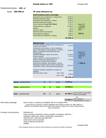 Powierzcznia domu Koszt 150 m2 180 400 zł Koszty domu nr 106 wrzesień 2016 W cenę wliczone są : Koszt budowy stanu surowego Konstrukcje ścian zewnętrznych z izolacją 20cm Drewniana elewacja- półbal Konstrukcje ścian działowych z izolacją Izolowane konstrukcje stropów 18 16 6 13 Więźba dachowa z podbiciami 22 660 zł Ściany kolankowe [ wys 140-170cm] Kolumny Lukarna w dachu Malowanie elewacji zewnętrznej Ślepe podłogi na poddaszu Konstrukcje ścian działowych z izolacją Wykończenia Drewniane podłogi z izolacją 12cm, przewidziane są w salonie, holu i sypialni. Wykończenia ścian parteru: w holu, wiatrołapie i garażu deski płaskie lub płyta gipsowa. W salonie półbal, w pozostałych pomieszczeniach folia paroizolacyjna. Ocieplenie poddasza- wełna min gr 20cm Schody, parapety Sufity na parterze: w salonie drewniane. W łazience i kuchni folia paroizolacyjna, w pozostałych pomieszczeniach gipsowe Wykończenia poddasza: płyta gipsowa i drewno. Najczęściej wszystkie pionowe ściany wykańczane są drewnem. Sufity i ściany skośne płytą gipsową. Drewniane podłogi w sypialniach i korytarzu na poddaszu Drewniane okna i drzwi okna- 10szt drzwi- 10szt 920 390 820 310 zł zł zł zł 4 730 zł 770 zł 1 760 zł 1 540 zł 2 090 zł 5 940 zł Koszt 1m2 w zakresie opisanym obok 633 zł 94 930 zł 8 140 zł 19 360 zł 15 400 zł 2 310 zł 6 270 zł 20 570 zł Koszt 1m2 w zakresie opisanym obok 1 203 zł 4 840 zł 8 580 zł 85 470 zł Garaż - powierzchnia: 20 m2 koszt 9 570 zł Taras - powierzchnia: 58 m2 koszt 16 060 zł Dach - powierzchnia: 290 m2 koszt 18 700 zł pokryty czarną papą dach wykonany z płyty OSB 24 090 zł lub dach wykonany z blachodachówki z rynnami W/w koszty zawierają : Koszt montażu i transportu do odległości 100 km od siedziby firmy [ jeżeli mamy do czynienia z większą odległością koszt budowy wzrasta o ok. 6000- 8000 zł w zależności od ustalonego zakresu prac jakie mamy wykonać. Głównie są to koszty zakwaterowania ekipy montażowej ] W koszty nie są wliczone: PODATEK VAT Prace murarskie [ fundament, kominy, posadzki w łazienkach, płytki itp. ] Instalacje [ elektryczna, wodno- kanalizacyjna, ogrzewanie ] Szpachlowanie i malowanie płyt gipsowych Lakierowanie drewna wewnątrz Tynki na elewacji zewnętrznej Projekt Treść niniejszej wyceny nie stanowi oferty handlowej w rozumieniu Kodeksu Cywilnego. wrzesień 2016