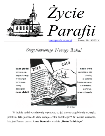 Życie Parafii www.parafia.brozec.pl Brożec Nr 190/2013 W łacinie nadal wyraźnie się wyczuwa, co już dawno zagubiło się w języku polskim. Kto jeszcze do daty dodaje „roku Pańskiego”? W łacinie wiadomo, kto jest Panem czasu: Anno Domini – właśnie „Roku Pańskiego”. PORZĄDEK NABOŻEŃSTW 30 XII 2013r. – 5 I 2014r. PONIEDZIAŁEK 30 XII 8.00 - Za + Annę Miczka w 30. dzień. WTOREK 31 XII św. Sylwestra 8.00 - W kaplicy: W pew. int. 16.30 - Uroczyste Nieszpory – zakończenie roku Pańskiego. ŚRODA 1I Świętej Bożej Rodzicielki Maryi 8.30 - Za zmarłych i poległych parafian z Kromołowa i Czernowa (od DFK). 10.30 - Do Dzieciątka Jezus w int. parafian z Brożca. 15.00 - Nabożeństwo o pokój na świecie. 15.30 - Za ++ Annę Miczka i Stefanię Czernek – z różańca. CZWARTEK 2I I czwartek 8.00 - Do Bożego Dzieciątka o świętość kapłanów. PIĄTEK 3I Najświętszego Imienia Jezus (I piątek) 7.15 - Wystawienie i różaniec. 8.00 - Do Dzieciątka Jezus z podz. za łaski z pr. o Boże błog. z ok. 18r. ur. Danieli Giza. 17.30 - Do Serca Pana Jezusa w int. rodzin oraz Wspólnoty Modlitewnej św. Michała. SOBOTA 4I 8.00 - Za + ks. Feliksa Sappoka. 17.30 - Za + Elżbietę Tomala, rodz. Martę i Herberta Brzank, Annę, Jana i Józefa Froehlich oraz d. w czyś. NIEDZIELA 5I II po Narodzeniu Pańskim - Adoracja 8.30 - W j. niem.: Do Dzieciątka Jezus w int. parafian z Kromołowa i Czernowa. 10.00 - Godzinki. 10.30 - Do Dzieciątka Jezus z podz. za wszelkie łaski z pr. o dalsze błog. w rodzinie z ok. 25r. ślubu Ireny i Waldemara Suchanek oraz 18r. ur. Pauliny. 1. We wtorek św. Sylwestra – uroczyste zakończenie roku Pańskiego 2013 o godz. 16.30. 2. W środę (1.01): Uroczystość Świętej Bożej Rodzicielki Maryi, Światowy Dzień Modlitw i Pokój na Świecie. 3. W tym tygodniu I czwartek oraz I piątek miesiąca. 4. W niedzielę (5.01) dzień Adoracji: 11.30 – adoracja wspólna 12.00 – różaniec z Brożca i III Zakon 13.00 – różaniec z Kromołowa i Żużeli 14.00 – dzieci: błogosławieństwo wody. 15.00 – młodzież 16.00 – rodzice 16.45 – zakończenie. PORZĄDEK NABOŻEŃSTW 6 – 12 I 2014 PONIEDZIAŁEK 6I Objawienie Pańskie 7.00 - Za Parafian. 8.30 - Za + ojca Franciszka Hruzik, ++ teściów Stefanię i Jana Wróbel, dziadków z obu stron oraz ++ z pokr. 10.30 - Za ++ rodz. Jadwigę i Alfonsa Nossol, ++ braci, dziadków z obu stron oraz ++ z pokr. Nossol - Burczyk. WTOREK 7I 7.00 - Za + Wilhelma Steindor – od sąsiadów. ŚRODA 8I 17.30 - Dla dzieci: Za + matkę chrzestną Annę Barton z ok. urodzin. CZWARTEK 9I 7.00 - Za + ojca Gerarda Kasperek, rodz. Elżbietę i Jerzego Sponer, brata Alfreda, ciocię Łucję, ++ z pokr. Kasperek-Sponer-Tomanek oraz o błog. i zdrowie w rodzinie. PIĄTEK 10 I 7.00 - Za ++ Krystynę i Alojzego Kopiec, + Gabrielę Cebula oraz ++ z pokr.. SOBOTA 11 I 8.00 - Do Bożego Dzieciątka i NMP z podz. za łaski z prośbą o błog. Boże i zdrowie w rodzinie z ok. 15 rocz., ślubu. 17.30 - Za + męża Henryka Przybyła, ++ rodziców Gajda – Przybyła i d. w czyś. NIEDZIELA 12 I Niedziela Chrztu Pańskiego 8.00 - W j. niem.: Do Bożego Dzieciątka w int. parafian z Żużeli i Bąkowa. 9.30 - Godzinki. 10.00 - Za + Reinholda Krupop w I rocz., + żonę Zofię oraz ++ z pokr. 14.30 - Nabożeństwo kolędowe. 1. W poniedziałek Uroczystość Objawienia Pańskiego (Trzech Króli): Błogosławieństwo wody, kredy i kadzidła w niedzielę o 15.00 oraz na Mszy św. o 8.30. Mszę św. o godz. 10.30 odprawi ks. abp Alfons Nossol. Kolekta będzie przeznaczona na misje. 2. W środę bezpośrednio po Mszy św. Dzieci Maryi zapraszają na Jasełka (dom parafialny). 3. W sobotę 11. stycznia o godz. 10.00 święcenia biskupie ks. prałata Rudolfa Pierskały w kościele seminaryjno-akademickim w Opolu, ul. Drzymały 1. 4. W przyszłą niedzielę ( 12 01): Święto CHRZTY PAŃSKIEGO – kończy się okres Narodzenia Pańskiego, jednak zgodnie z tradycją kolędy śpiewamy do święta Ofiarowania Pańskie czyli 02. lutego. Kolekta kolędowa, będzie przeznaczona na ogrzewanie kościoła(energię elektyczną). Statystyka życia parafialnego – Brożec 2013 1. Chrzty święte 2. Sakrament małżeństwa 3. Komunia św.: I Komunia Rozdano 4. Bierzmowanie 5. Pogrzeby 2013 2012 15 9 16 54.200 24 24 17 8 23 57.100 23 17 Inwestycje: 1. Malowanie wnętrza kościoła oraz złocenia wyposażenia świątyni 2. Ogrodzenie na cmentarzu i odnowienie alejek Chrzty święte w roku 2013: 1. 2. 3. 4. 5. 6. 7. 8. Oliver Maciejek - Kromołów Zofia Gogolok - Brożec Lukas Siegmann – Holandia - Brożec Lena Brzank - Brożec Wojciech Donitza - Brożec Paweł Smykała - Żużela Kinga Musioł - Żużela Szymon Szczęśniak - Brożec 9. Julia Wybraniec - Brożec 10. Lukas Golla – München - Żużela 11. Martyna Gawron - Brożec 12. Paweł Kipka - Kromołów 13. Maksymilian Banert - Brożec 14. Piotr Miczka - Brożec 15. Karolina Siodlaczek - Kromołów Odeszli do domu Ojca – 2013 1. Rajnhold Krupop – Czernów (76) 2. Joanna Zolichowska – Sosnowiec (58) 3. Krystyna Gramala – Kromołów (75) 4. Wiktoria Schönowska – Brożec (78) 5. Jerzy Gajda – Żużela (74) 6. Helena Herud – Żużela (79) 7. Jerzy Pawliczek – Brożec (60) 8. Waleska Kopiec – Żużela (91) 9. Bernard Miczka – Brożec (60) 10.Wiktor Kowalski – Rydułtowy Brożec (78) 11. Norbert Steindor – Kromołów (51) 12. Józef Pawliczek – Czernów (68) 13. Jan Sikoń – Brożec (48) 14. Teresa Malorny – Niemcy – Czernów (47) 15. Teodor Stokłosa – Brożec (81) 16. Róża Drost – Żużela Bąków (96) 17. Elfrieda Weihsbrich – Żużela (82) 18. Brunon Marek – Kromołów (42) 19. Stefania Czernek – Kromołów (80) 20. Anna Miczka – Brożec (99) 21. Maksymilian Cygan – Brożec (86) 22. Jan Langer – Krapkowice (83) 23. Wilhelm Steindor – Brożec (81) 24. Herbert Gołąbek – Brożec (58) Brożec – 9, Kromołów – 6, Żużela - 5, mieszk