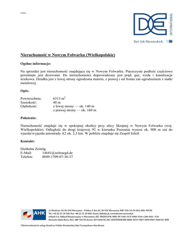Nieruchomość w Nowym Folwarku (Wielkopolskie) Ogólne informacje: Na sprzedaż jest nieruchomość znajdująca się w Nowym Folwarku. Piaszczyste podłoże częściowo porośnięte jest drzewami. Do nieruchomości doprowadzony jest prąd, gaz, woda i kanalizacja ściekowa. Działka jest z lewej strony ogrodzona murem, z prawej i od frontu zaś ogrodzeniem z siatki metalowej. Opis: Powierzchnia: Szerokość: Głębokość: 6313 m2 48 m z lewej strony — ok. 140 m z prawej strony — ok. 160 m Położenie: Nieruchomość znajduje się w spokojnej okolicy przy ulicy Skrajnej w Nowym Folwarku (woj. Wielkopolskie). Odległość do drogi krajowej 92 w kierunku Poznania wynosi ok. 900 m zaś do wjazdu/wyjazdu autostrady A2 ok. 2,5 km. W pobliżu znajduje się Zespół Szkół. Kontakt: Diethelm Zeiträg E-Mail: [email protected] Telefon: 0049-1709-07-36-37 Widok od przodu. Widok na Nowy Folwark. 2/3 Widok na nieruchomość. 3/3