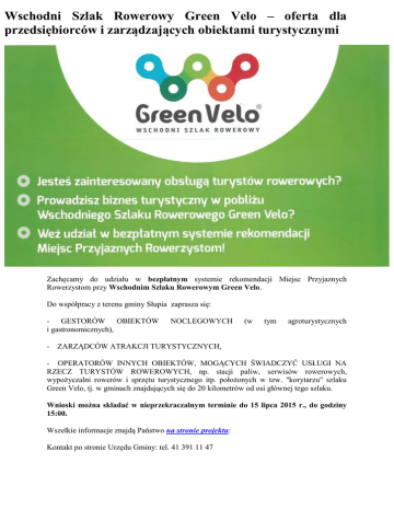 Wschodni Szlak Rowerowy Green Velo – oferta dla przedsiębiorców i zarządzających obiektami turystycznymi Zachęcamy do udziału w bezpłatnym systemie rekomendacji Miejsc Przyjaznych Rowerzystom przy Wschodnim Szlaku Rowerowym Green Velo. Do współpracy z terenu gminy Słupia zaprasza się: - GESTORÓW OBIEKTÓW i gastronomicznych), NOCLEGOWYCH (w tym agroturystycznych - ZARZĄDCÓW ATRAKCJI TURYSTYCZNYCH, - OPERATORÓW INNYCH OBIEKTÓW, MOGĄCYCH ŚWIADCZYĆ USŁUGI NA RZECZ TURYSTÓW ROWEROWYCH, np. stacji paliw, serwisów rowerowych, wypożyczalni rowerów i sprzętu turystycznego itp. położonych w tzw. "korytarzu" szlaku Green Velo, tj. w gminach znajdujących się do 20 kilometrów od osi głównej tego szlaku. Wnioski można składać w nieprzekraczalnym terminie do 15 lipca 2015 r., do godziny 15:00. Wszelkie informacje znajdą Państwo na stronie projektu: Kontakt po stronie Urzędu Gminy: tel. 41 391 11 47