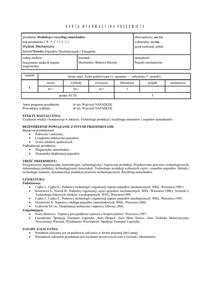 KARTA INFORMACYJNA PRZEDMIOTU przedmiot: Produkcja i recycling samochodów kod przedmiotu: 4-M-P-2-10-S-1-4 Wydzia : Mechaniczny Instytut/Katedra: Pojazdów Mechanicznych i Transportu obowi zkowy: nie/tak wybieralny: nie/tak zyk realizacji: polski rodzaj studiów: Stacjonarne studia II stopnia magisterskie specjalno : Pojazdy mechaniczne semestr I kierunek: Mechanika i Budowa Maszyn forma zaj , liczba godzin/rygor (x -egzamin, + - zaliczenia, # - projekt) razem wyk ady wiczenia laboratoria projekt seminarium 45/+ 26/+ 16/+ 3 - - punkty ECTS Autor programu przedmiotu: Prowadz cy wyk ady: 3 dr in . Wojciech NAPAD EK dr in . Wojciech NAPAD EK EFEKTY KSZTA CENIA: Uzyskanie wiedzy i kompetencji w zakresie: Technologii produkcji i recyklingu elementów i zespo ów samochodów. BEZPO REDNIE POWI ZANIE Z INNYMI PRZEDMIOTAMI: Bazuje na przedmiotach: Podwozia i nadwozia, Urz dzenia elektryczne pojazdów, Teoria silników spalinowych Podbudowuje przedmioty: Diagnostyka samochodów, Ekonomika eksploatacji pojazdów. TRE PRZEDMIOTU: Przygotowanie organizacyjne, konstrukcyjne, technologiczne i logistyczne produkcji. Projektowanie procesów technologicznych, dokumentacja produkcji, technologiczno konstrukcji. Technologia produkcji wybranych cz ci i zespo ów pojazdów. Metody i technologia monta u. Automatyzacja produkcji procesów technologicznych. Recykling samochodów. LITERATURA: Podstawowa: Cypko J., Cypko E.: Podstawy technologii i organizacji napraw pojazdów mechanicznych. WK , Warszawa 1989 r. Kostrzewa S., Nowak B.: Podstawy regeneracji cz ci pojazdów mechanicznych. WK . Warszawa 1980 r. Jezierski J. Technologia t okowych silników wysokopr nych. WNT, Warszawa1999. Cypko J., Cypko E.: Podstawy technologii i organizacji napraw pojazdów mechanicznych. WK , Warszawa 1989, Orze owski S.: Naprawa i obs uga pojazdów samochodowych. WK , Warszawa 2004, Uzdowski M i in.: Eksploatacja techniczna i naprawa. Gliwice, 2003, Uzupe niaj ca: Praca zbiorowa: Naprawy powypadkowe nadwozi a bezpiecze stwo. Warszawa 1997, Czasopisma: Spedycja Transport Logistyka, Auto Ekspert, Auto Moto Serwis, Auto Technika Motoryzacyjna, Nowoczesny Warsztat, Wiadomo ci Warsztatowe. Spedycja Transport Logistyka ZASADY ZALICZANIA: Przedmiot zaliczany jest na podstawie zaliczenia w formie pisemnej lub/i ustnej. Warunkiem zaliczenia przedmiotu jest uzyskanie pozytywnych ocen z wicze i laboratoriów.