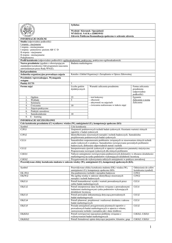 Syllabus Wydział / Kierunek / Specjalność WYDZIAŁ NAUK o ZDROWIU Zdrowie Publiczne/Komunikacja społeczna w ochronie zdrowia INFORMACJE OGÓLNE Studia (odpowiednie podkreślić) I stopnia - stacjonarne I stopnia - niestacjonarne I stopnia - pomostowe: poziom AB/ C/ D II stopnia - stacjonarne II stopnia - niestacjonarne Podyplomowe Profil kształcenia (odpowiednie podkreślić): ogólnoakademicki, praktyczny, praktyczno-ogólnoakademicki Nazwa przedmiotu (zgodnie z obowiązującym Badania marketingowe standardem kształcenia i/lub programem nauczania zatwierdzonym przez Radę WNoZ). Kod przedmiotu Katedra i Zakład Organizacji i Zarządzania w Opiece Zdrowotnej Jednostka organizacyjna prowadząca zajęcia Przedmioty wprowadzające. Wymagania wstępne Punkty ECTS Forma zajęć 1. 2. 3. 4. 5. 6. 7. 8. Ogółem Wykłady Seminaria Ćwiczenia Zajęcia praktyczne Praktyki zawodowe Samokształcenie E – learning 1 Liczba godzin dydaktycznych 25 5 10 Warunki zaliczenia przedmiotu - test końcowy - obecność - aktywność na zajęciach - ćwiczenia realizowane w trakcie zajęć Forma zaliczenia przedmiotu (odpowiednie podkreślić) Egzamin Zaliczenie z oceną Zaliczenie 10 INFORMACJE SZCZEGÓŁOWE Cele kształcenia przedmiotu (C) wynikowe: wiedza (W), umiejętności (U), kompetencje społeczne (KS) Symbol Cele kształcenia C(W)1 Znajomość podstawowych technik badań rynkowych. Ocenianie wartości różnych raportów z badań rynkowych C(W)2 Identyfikowanie stosowanych narzędzi i technik badawczych. Samodzielne projektowanie podstawowych badań rynkowych C(U)1 Samodzielnie rozpoznawanie problemów związanych ze stosowaniem różnych technik analiz rynkowych w praktyce. Samodzielnie rozwiązywanie powstałych problemów badawczych, dobieranie odpowiednich metod i technik C(U)2 Interpretowania zjawisk rynkowych w oparciu o podstawowe parametry statystyczne. Proponowanie rozwiązań rynkowych dla różnych problemów C(KS)1 Nabycie umiejętności rozwiązywania podstawowych dylematów w obszarze działalności marketingowej na rynku podmiotów wykonujących działalność leczniczą C(KS)2 Przygotowanie do wykorzystania nabytych umiejętności w praktyce zawodowej Przewidywane efekty kształcenia studenta w zakresie wiedzy (W), umiejętności (U), kompetencji społecznych (KS). Symbol EK (W)1 EK(W)2 EK(U)1 EK(U)2 EK(U)3 EK(U)4 EK(U)5 EK(KS)1 EK(KS)2 Przewidywane efekty kształcenia studenta (EK): wiedza (W), umiejętności (U), kompetencje społeczne (KS). Zna podstawowe techniki i narzędzia badawcze Ma ogólną wiedzę w zakresie identyfikacji stosowanych narzędzi i technik badawczych Potrafi komunikować wyniki i wartość prowadzonych przez siebie badań marketingowych Potrafi interpretować dane liczbowe związane z prowadzonymi badaniami marketingowymi rynku podmiotów wykonujących działalność leczniczą Potrafi prowadzić dokumentację dotyczącą prowadzonych badań marketingowych Potrafi planować, projektować i realizować działania z zakresu badań marketingowych Posiada umiejętność przygotowania pisemnych raportów z prowadzonych badań marketingowych w oparciu o własne, zastosowanie techniki i narzędzia jaki i dane źródłowe Potrafi rozwiązywać najczęstsze problemy związane z wykonywaniem badań marketingowych Potrafi formułować opinie dotyczące pacjentów, klientów, grup Odniesienie do celów kształcenia (symbol) C(W)1 C(W)2 C(U)1 C(U)1 C(U)2 C(U)1 C(U)2 C(KS)2, C(KS)1 C(KS)2, C(KS)1 1 społecznych w kontekście związanym z prowadzonymi badaniami marketingowymi EK(KS)3 Rozumie potrzebe uczenia się przez całe życie C(KS)1 EK (KS)4 Potrafi odpowiednio określić priorytety służące realizacji C(KS)2 określonego przez siebie lub innych zadania Treści programowe (TP): opis przedmiotu wynikający z obowiązującego standardu kształcenia i/lub programu nauczania zatwierdzonego przez Radę WNoZ Symbol Forma realizacji treści kształcenia: np. wykład, seminaria, Odniesienie do ćwiczenia, zajęcia praktyczne, praktyki zawodowe, efektów kształcenia samokształcenie, E- learning (symbol) TP1 – Istota, przesłanki i użyteczność badań Wykład EK(W)1, EK(W)2, marketingowych EK(KS)3, EK(KS)4 TP2 – Cechy i zachowania przedsiębiorstw a Wykład EK(W)1, EK(W)2, prowadzenie badań marketingowych, ewolucja EK(KS)1, EK(KS)3, badań marketingowych EK(KS)4 TP3 – System komunikacji masowej na rynku Wykład EK(W)1, EK(W)2, podmiotów wykonujących działalność leczniczą EK(KS)2, EK(KS)3 TP4 – System informacji marketingowe a badania Ćwiczenia, zajęcia praktyczne EK(U)4, EK(U)5, EK(KS)1, EK(KS)4, EK(KS)3 TP5 – Budowa kwestionariusza badawczego oraz Ćwiczenia, zajęcia praktyczne EK(U)3, EK(U)4, metody doboru próby w badaniach EK(U)5, EK(KS)3, EK(U)2 TP6 – Metody i techniki zbierania informacji z Ćwiczenia, zajęcia praktyczne EK(U)1, EK(U)3, rynku EK(U)4, EK(U)5, EK(KS)1, EK(KS)2, EK(KS)3 TP7 – Rodzaje badań ilościowych Ćwiczenia, zajęcia praktyczne EK(U)1, EK(U)3, EK(U)4, EK(KS)3 TP8 – Badania jakościowe Ćwiczenia, zajęcia praktyczne EK(U)1, EK(U)3, EK(U)2, EK(U)4, EK(KS)2, EK(KS)3, EK(KS)4 Metody dydaktyczne (sposób pracy nauczyciela, * metody słowne umożliwiający osiągnięcie celów kształcenia) * metody oglądowe * metody praktyczne * metody gier dydaktycznych * multimedialne programy komputerowe Środki dydaktyczne wykorzystywane w * obrazy, schematy modele, materiały drukowane procesie kształcenia Wykaz piśmiennictwa dla studenta 1. Kaczmarczyk S., Badania marketingowe, PWE, Warszawa 2010 Piśmiennictwo podstawowe do 4 pozycji 2. Maison D. Metody badań jakościowych, PWE, Warszawa 2010 1. Badania marketingowe, praca zbiorowa pod red. K. Mazurek –Łopacińskiej, Piśmiennictwo uzupełniające do 4 pozycji PWE,Warszawa 2008 2. Michalik M., Mruk H., Pilarczyk B., Marketing strategiczny na rynku farmaceutycznym, Oficyna Ekonomiczna, Kraków 2011 Sposób oceny pracy studenta Typ oceny: diagnostyczne (D), formujące (F),