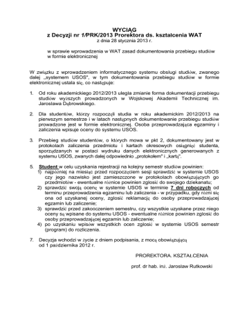 WYCIĄG z Decyzji nr 1/PRK/2013 Prorektora ds. kształcenia WAT z dnia 28 stycznia 2013 r. w sprawie wprowadzenia w WAT zasad dokumentowania przebiegu studiów w formie elektronicznej W związku z wprowadzeniem informatycznego systemu obsługi studiów, zwanego dalej „systemem USOS", w tym dokumentowania przebiegu studiów w formie elektronicznej ustala się, co następuje: 1. Od roku akademickiego 2012/2013 uległa zmianie forma dokumentacji przebiegu studiów wyższych prowadzonych w Wojskowej Akademii Technicznej im. Jarosława Dąbrowskiego. 2. Dla studentów, którzy rozpoczęli studia w roku akademickim 2012/2013 na pierwszym semestrze i w latach następnych dokumentowanie przebiegu studiów prowadzone jest w formie elektronicznej. Osoba przeprowadzająca egzaminy i zaliczenia wpisuje oceny do systemu USOS. 3. Przebieg studiów studentów, o których mowa w pkt 2, dokumentowany jest w protokołach zaliczenia przedmiotu i kartach okresowych osiągnięć studenta, sporządzanych w postaci wydruku danych elektronicznych generowanych z systemu USOS, zwanych dalej odpowiednio „protokołem" i „kartą". 5. Student w celu uzyskania rejestracji na kolejny semestr studiów powinien: 1) najpóźniej na miesiąc przed rozpoczęciem sesji sprawdzić w systemie USOS czy jego nazwisko jest zamieszczone w protokołach obowiązujących go przedmiotów - ewentualne różnice powinien zgłosić do swojego dziekanatu; 2) sprawdzić swoją ocenę w systemie USOS w terminie 7 dni roboczych od terminu przeprowadzenia egzaminu lub zaliczenia - w przypadku, gdy różni się ona od uzyskanej oceny, zgłosić reklamację do osoby przeprowadzającej egzamin lub zaliczenie; 3) sprawdzić przed zakończeniem semestru, czy wszystkie uzyskane przez niego oceny są wpisane do systemu USOS - ewentualne różnice powinien zgłosić do osoby przeprowadzającej egzamin lub zaliczenie; 4) po uzyskaniu wpisów wszystkich ocen zgłosić w systemie USOS semestr (program) do rozliczenia. 7. Decyzja wchodzi w życie z dniem podpisania, z mocą obowiązującą od 1 października 2012 r. PROREKTORA. KSZTAŁCENIA prof. dr hab. inż. Jarosław Rutkowski