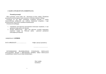 4 KARTA GWARANCYJNA OGRZEWACZA Warunki gwarancji: Okres gwarancji wynosi jeden rok i obowiązuje od daty zakupu. Warunkiem gwarancji jest przestrzeganie zasad zawartych w instrukcji instalacji i obsługi. Gwarancją nie jest objęte uszkodzenie urządzenia powstałe w wyniku nieprawidłowego podłączenia oraz wadliwej eksploatacji niezgodnej z jego przeznaczeniem, jak również uszkodzeń mechanicznych. Gwarancji nie podlegają: 1. 2. Uszkodzenia spowodowane przeciążeniem termicznym urządzenia, w tym spalaniem innego paliwa niż zalecane. Powłoki polakierowane – lakier pod wpływem wysokiej temperatury stopniowo wypala się. Wówczas należy ponownie pomalować termoodpornym lakierem. OGRZEWACZ LINDOS DATA SPRZEDAŻY .............................. Podpis i pieczęć sprzedawcy ............................................. POTWIERDZENIE PRAWIDŁOWEGO WYKONANIA INSTALACJI WYCIĄGOWEJ SPALIN I SPRAWNOŚCI KOMINA ORAZ INSTALACJI NAWIEWNEJ I WENTYLACYJNEJ POWIETRZA. Data i podpis kominiarza 9