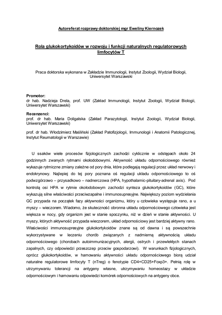Autoreferat rozprawy doktorskiej mgr Eweliny Kiernozek Rola glukokortykoidów w rozwoju i funkcji naturalnych regulatorowych limfocytów T Praca doktorska wykonana w Zakładzie Immunologii, Instytut Zoologii, Wydział Biologii, Uniwersytet Warszawski Promotor: dr hab. Nadzieja Drela, prof. UW (Zakład Immunologii, Instytut Zoologii, Wydział Biologii, Uniwersytet Warszawski) Recenzenci: prof. dr hab. Maria Doligalska (Zakład Parazytologii, Instytut Zoologii, Wydział Biologii, Uniwersytet Warszawski) prof. dr hab. Włodzimierz Maśliński (Zakład Patofizjologii, Immunologii i Anatomii Patologicznej, Instytut Reumatologii w Warszawie) U ssaków wiele procesów fizjologicznych zachodzi cyklicznie w odstępach około 24 godzinnych zwanych rytmami okołodobowymi. Aktywność układu odpornościowego również wykazuje rytmiczne zmiany zależne od pory dnia, które podlegają regulacji przez układ nerwowy i endokrynowy. Najlepiej do tej pory poznana oś regulacji układu odpornościowego to oś podwzgórzowo – przysadkowo – nadnerczowa (HPA, hypothalamic-pituitary-adrenal axis). Pod kontrolą osi HPA w rytmie okołodobowym zachodzi synteza glukokortykoidów (GC), które wykazują silne właściwości przeciwzapalne i immunosupresyjne. Największy poziom wydzielania GC przypada na początek fazy aktywności organizmu, który u człowieka występuje rano, a u myszy – wieczorem. Wiadomo, że skuteczność obronna układu odpornościowego człowieka jest większa w nocy, gdy organizm jest w stanie spoczynku, niż w dzień w stanie aktywności. U myszy, których aktywność przypada wieczorem, układ odpornościowy jest bardziej aktywny rano. Właściwości immunosupresyjne glukokortykoidów znane są od dawna i są powszechnie wykorzystywane w leczeniu chorób związanych z nadmierną aktywnością układu odpornościowego (chorobach autoimmunizacyjnych, alergii, ostrych i przewlekłych stanach zapalnych, czy odpowiedzi przeszczep przeciw gospodarzowi). W warunkach fizjologicznych, oprócz glukokortykoidów, w hamowaniu aktywności układu odpornościowego biorą udział naturalne regulatorowe limfocyty T (nTreg) o fenotypie CD4+CD25+Foxp3+. Pełnią rolę w utrzymywaniu tolerancji na antygeny własne, utrzymywaniu homeostazy w odpornościowym i hamowaniu odpowiedzi komórek odpornościowych na antygeny obce. układzie Limfocyty nTreg CD4+CD25+Foxp3+ powstają w grasicy. Pomimo prowadzonych od wielu lat intensywnych badań, ich dokładny mechanizm różnicowania i dojrzewania w grasicy pozostaje nadal niejasny. Wskazuje się również na udział glukokortykoidów w tym procesie. Głównym źródłem syntezy endogennych glukokortykoidów jest kora nadnerczy. Jednakże syntezę tych hormonów stwierdzono w komórkach nabłonkowych kory grasicy (cTEC, cortical thymic epithelial cells), a także limfocytach T i B. Z dobowym rytmem syntezy GC związany jest okołodobowy rytm migracji leukocytów, aktywacji i funkcji efektorowych komórek układu odpornościowego. Komunikację pomiędzy układem hormonalnym a odpornościowym zapewniają receptory dla hormonów, w tym receptory dla glukokortykoidów (GCR) występujące w oraz na komórkach odpornościowych. Wskazuje się również na udział glukokortykoidów w indukcji syntezy czynnika transkrypcyjnego Foxp3 odpowiedzialnego za powstawanie i funkcje supresorowe limfocytów nTreg oraz na mniejszą wrażliwość tych komórek na indukcję apoptozy przez syntetyczne glukokortykoidy w warunkach eksperymentalnych. Powstaje zatem pytanie, czy w supresji układu odpornościowego i rytmicznych zmianach jego aktywności uczestniczą niezależnie glukokortykoidy i naturalne regulatorowe limfocyty T w drodze odrębnych mechanizmów, czy też wzajemnie uzupełniających się? Na podstawie dostępnych wyników badań dokumentujących udział osi HPA i glukokortykoidów w regulacji funkcji układu odpornościowego oraz jego zmiennej aktywności zależnej od pory dnia, sformułowano następującą hipotezę badawczą: Rozwój i aktywność supresorowa naturalnych regulatorowych limfocytów T wykazuje rytmiczność zależną od pory dnia. Rytmiczne zmiany aktywności supresorowej limfocytów nTreg uczestniczą w zmiennej aktywności układu odpornościowego zależnej od pory dnia. W procesie rozwoju i regulacji rytmicznych zmian aktywności supresorowej limfocytów nTreg uczestniczą glukokortykoidy. Badania przeprowadzono w dwóch etapach. Celem pierwszego była weryfikacja hipotezy zakładającej występowanie rytmiczności rozwoju nTreg w dwóch wybranych punktach czasowych odpowiadających najmniejszemu i największemu stężeniu endogennych glukokortykoidów. Porównano etapy rozwoju głównych populacji tymocytów oraz nTreg dwóch prototypowych szczepów myszy obu płci C57BL/6 i BALB/c różniących się typem odpowiedzi immunologicznej, odpowiednio Th1 i Th2. Celem drugiego etapu była weryfikacja hipotezy zakładającej regulację rozwoju i aktywności supresorowej nTreg przez glukokortykoidy. W badaniach wykorzystano wyżej wymienione szczepy myszy, które traktowano syntetycznym glukokortykoidem – deksametazonem przez dootrzewnowe wstrzyknięcie dwóch wybranych dawek: 1.25 µg/kg/dobę i 1.25 mg/kg/dobę. Na podstawie uzyskanych wyników wykazano, iż: 1. Rozwój i aktywność supresorowa limfocytów nTreg w grasicy wykazuje rytmiczność zależną od pory dnia, płci i typu odpowiedzi immunologicznej: ü wykazano zwiększenie odsetka limfocytów nTreg w grasicy oraz wzrost ich funkcji supresorowej wieczorem ü samce charakteryzują się większym odsetkiem i aktywnością supresorową nTreg niż samice ü kinetyka rozwoju nTreg wykazuje zmienność zależną od typu odpowiedzi immunologicznej 2. Rytmicznym zmianom rozwoju i aktywności supresorowej nTreg towarzyszą rytmiczne zmiany ekspresji receptorów dla glukokortykoidów, które są zgodne z rytmem dobowym syntezy glukokortykoidów. 3. Działanie syntetycznego glukokortykoidu – deksamet