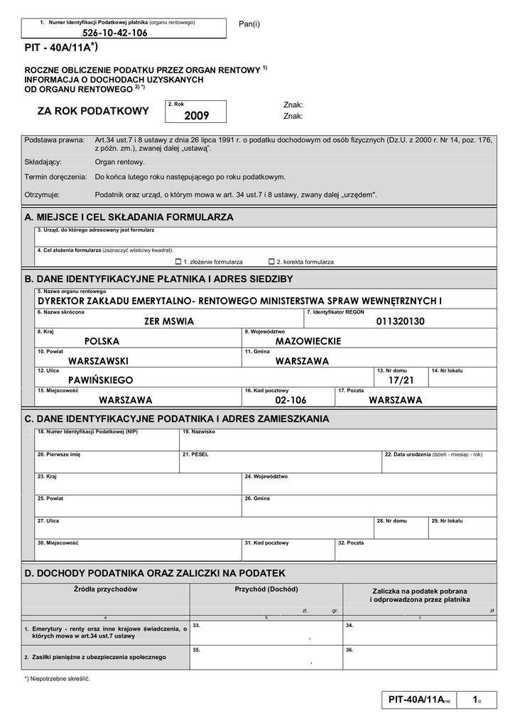 1. Numer Identyfikacji Podatkowej płatnika (organu rentowego) 526-10-42-106 Pan(i) PIT - 40A/11A*) ROCZNE OBLICZENIE PODATKU PRZEZ ORGAN RENTOWY 1) INFORMACJA O DOCHODACH UZYSKANYCH OD ORGANU RENTOWEGO 2) *) ZA ROK PODATKOWY Znak: Znak: 2. Rok 2009 Podstawa prawna: Art.34 ust.7 i 8 ustawy z dnia 26 lipca 1991 r. o podatku dochodowym od osób fizycznych (Dz.U. z 2000 r. Nr 14, poz. 176, z późn. zm.), zwanej dalej „ustawą”. Składający: Organ rentowy. Termin doręczenia: Do końca lutego roku następującego po roku podatkowym. Otrzymuje: Podatnik oraz urząd, o którym mowa w art. 34 ust.7 i 8 ustawy, zwany dalej „urzędem". A. MIEJSCE I CEL SKŁADANIA FORMULARZA 3. Urząd, do którego adresowany jest formularz 4. Cel złożenia formularza (zaznaczyć właściwy kwadrat): 1. złożenie formularza 2. korekta formularza B. DANE IDENTYFIKACYJNE PŁATNIKA I ADRES SIEDZIBY 5. Nazwa organu rentowego DYREKTOR ZAKŁADU EMERYTALNO- RENTOWEGO MINISTERSTWA SPRAW WEWNĘTRZNYCH I 7. Identyfikator REGON 6. Nazwa skrócona ADMINISTRACJI ZER MSWIA 011320130 8. Kraj 9. Województwo POLSKA MAZOWIECKIE 10. Powiat 11. Gmina WARSZAWSKI WARSZAWA 12. Ulica 13. Nr domu PAWIŃSKIEGO 14. Nr lokalu 17/21 15. Miejscowość 16. Kod pocztowy WARSZAWA 17. Poczta 02-106 WARSZAWA C. DANE IDENTYFIKACYJNE PODATNIKA I ADRES ZAMIESZKANIA 18. Numer Identyfikacji Podatkowej (NIP) 19. Nazwisko 20. Pierwsze imię 21. PESEL 22. Data urodzenia (dzień - miesiąc - rok) 23. Kraj 24. Województwo 25. Powiat 26. Gmina 27. Ulica 28. Nr domu 30. Miejscowość 31. Kod pocztowy 29. Nr lokalu 32. Poczta D. DOCHODY PODATNIKA ORAZ ZALICZKI NA PODATEK Źródła przychodów Przychód (Dochód) a b Zaliczka na podatek pobrana i odprowadzona przez płatnika zł, 1. Emerytury - renty oraz inne krajowe świadczenia, o gr. 33. których mowa w art.34 ust.7 ustawy 34. , 35. 2. Zasiłki pieniężne z ubezpieczenia społecznego zł c 36. , *) Niepotrzebne skreślić. PIT-40A/11A (16) 1 /2 E. INFORMACJA O DOKONANYCH ZWROTACH (POTRĄCENIACH), PRZYCHODACH ZWOLNIONYCH OD PODATKU ORAZ O SKŁADCE NA UBEZPIECZENIE ZDROWOTNE 37. Kwota dokonanego w roku podatkowym zwrotu (potrącenia), o którym mowa w art.34 ust.10-10b ustawy, nieuwzględniona przy poborze zaliczek przez organ rentowy - odliczenie od dochodu Kwota składki na ubezpieczenie zdrowotne, o której mowa w art.27b ustawy, tj. do wysokości 7,75% podstawy jej wymiaru - odliczenie od podatku Zwrot uprzednio zapłaconej i odliczonej składki na ubezpieczenie zdrowotne, otrzymany bezpośrednio od organu rentowego - doliczenie do podatku Przychód zwolniony od podatku na podstawie art.21 ust.1 pkt 2, 75 i 100 ustawy, np. renty przyznane na podstawie odrębnych przepisów o zaopatrzeniu inwalidów wojennych i wojskowych oraz ich rodzin, renty wypłacane osobom represjonowanym i członkom ich rodzin zł, gr zł, gr zł, gr zł, gr 38. 39. 40. F. ROCZNE OBLICZENIE PODATKU PRZEZ ORGAN RENTOWY zł 41. Podstawa obliczenia podatku (po zaokrągleniu do pełnych złotych) Od kwoty z poz.33 należy odjąć kwotę z poz.37. Jeżeli różnica jest liczbą ujemną, należy wpisać 0. 42. Podatek należny (po zaokrągleniu do pełnych złotych) Podatek od podstawy z poz.41 obliczony zgodnie z art.34 ustawy. 43. Różnica pomiędzy podatkiem należnym a sumą pobranych zaliczek, DO ZAPŁATY Od kwoty z poz.42 należy odjąć kwotę z poz.34. Jeżeli różnica jest liczbą ujemną, należy wpisać 0. Niedopłata podatku zostanie potrącona z bieżących świadczeń. Różnica pomiędzy sumą pobranych zaliczek a podatkiem należnym, NADPŁATA 44. Od kwoty z poz.34 należy odjąć kwotę z poz.42. Jeżeli różnica jest liczbą ujemną, należy wpisać 0. Nadpłata podatku, zgodnie z ustawą, zaliczona zostanie na poczet zaliczki za miesiąc marzec roku następującego po roku podatkowym, a jeżeli ją przekroczy - zwrócona łącznie z bieżącymi świadczeniami. Kwota zaliczki na podatek od emerytur-rent oraz innych krajowych świadczeń, o których mowa w art. 34 ust. 7 ustawy, uwzględniająca rozliczenie kwoty do zapłaty (nadpłaty) 45. Jeżeli z rocznego obliczenia podatku wynika: - kwota do zapłaty, należy wpisać sumę kwot z poz. 34 i 43, - kwota nadpłaty, należy od kwoty z poz. 34 odjąć kwotę z poz. 44. G. OŚWIADCZENIE PŁATNIKA LUB OSOBY WYZNACZONEJ DO OBLICZANIA PODATKU Dyrektor 46. Pieczątka i podpis Oświadczam, że są mi znane przepisy Kodeksu karnego skarbowego o odpowiedzialności za podanie danych niezgodnych z rzeczywistością. z up. Objaśnienia 1) Roczne obliczenie podatku (PIT-40A) organy rentowe sporządzają podatnikom uzyskującym dochody, o których mowa w art. 34 ust.7 ustawy, tj. w szczególności z tytułu emerytur i rent, świadczeń przedemerytalnych oraz zasiłków przedemerytalnych, z wyjątkiem podatników: a) w stosunku do których ustał obowiązek poboru zaliczek, b) którzy złożyli oświadczenie o zamiarze wspólnego opodatkowania swoich dochodów z dochodami małżonka lub w sposób przewidziany dla osób samotnie wychowujących dzieci, chyba że podatnik przed końcem roku podatkowego złożył oświadczenie o rezygnacji z zamiaru opodatkowania w powyższy sposób, c) w stosunku do których, na podstawie przepisów Ordynacji podatkowej, zwolniono organ rentowy w całości lub w części z obowiązku poboru zaliczek na podatek dochodowy, d) którym nie pobierano zaliczek na podatek dochodowy stosownie do postanowień umów o unikaniu podwójnego opodatkowania. 2) Informację o dochodach (PIT-11A) organy rentowe sporządzają podatnikom, którym nie dokonują rocznego obliczenia podatku (PIT-40A) (np. podatnikom uzyskującym dochody z zasiłków pieniężnych z ubezpieczenia społecznego), oraz podatnikom, którym dokonują jedynie wypłaty świadczeń określonych w art. 21 ust. 1 pkt 2, 75 i 100 ustawy. Informacja dla osób, które na podstawie otrzymanego formularza PIT-11A albo PIT-40A będą składać zeznanie podatkowe PIT-36 lub PIT-37 Osoby, które od