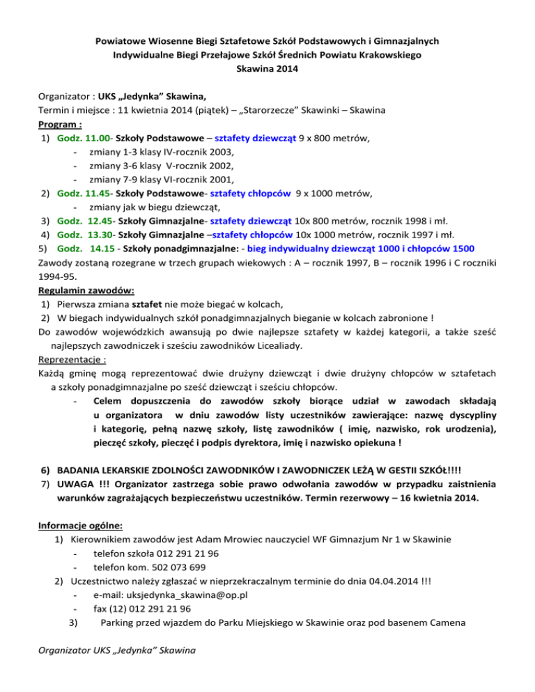 Powiatowe Wiosenne Biegi Sztafetowe Szkół Podstawowych i Gimnazjalnych Indywidualne Biegi Przełajowe Szkół Średnich Powiatu Krakowskiego Skawina 2014 Organizator : UKS „Jedynka” Skawina, Termin i miejsce : 11 kwietnia 2014 (piątek) – „Starorzecze” Skawinki – Skawina Program : 1) Godz. 11.00- Szkoły Podstawowe – sztafety dziewcząt 9 x 800 metrów, - zmiany 1-3 klasy IV-rocznik 2003, - zmiany 3-6 klasy V-rocznik 2002, - zmiany 7-9 klasy VI-rocznik 2001, 2) Godz. 11.45- Szkoły Podstawowe- sztafety chłopców 9 x 1000 metrów, - zmiany jak w biegu dziewcząt, 3) Godz. 12.45- Szkoły Gimnazjalne- sztafety dziewcząt 10x 800 metrów, rocznik 1998 i mł. 4) Godz. 13.30- Szkoły Gimnazjalne –sztafety chłopców 10x 1000 metrów, rocznik 1997 i mł. 5) Godz. 14.15 - Szkoły ponadgimnazjalne: - bieg indywidualny dziewcząt 1000 i chłopców 1500 Zawody zostaną rozegrane w trzech grupach wiekowych : A – rocznik 1997, B – rocznik 1996 i C roczniki 1994-95. Regulamin zawodów: 1) Pierwsza zmiana sztafet nie może biegać w kolcach, 2) W biegach indywidualnych szkół ponadgimnazjalnych bieganie w kolcach zabronione ! Do zawodów wojewódzkich awansują po dwie najlepsze sztafety w każdej kategorii, a także sześć najlepszych zawodniczek i sześciu zawodników Licealiady. Reprezentacje : Każdą gminę mogą reprezentować dwie drużyny dziewcząt i dwie drużyny chłopców w sztafetach a szkoły ponadgimnazjalne po sześć dziewcząt i sześciu chłopców. Celem dopuszczenia do zawodów szkoły biorące udział w zawodach składają u organizatora w dniu zawodów listy uczestników zawierające: nazwę dyscypliny i kategorię, pełną nazwę szkoły, listę zawodników ( imię, nazwisko, rok urodzenia), pieczęć szkoły, pieczęć i podpis dyrektora, imię i nazwisko opiekuna ! 6) BADANIA LEKARSKIE ZDOLNOŚCI ZAWODNIKÓW I ZAWODNICZEK LEŻĄ W GESTII SZKÓŁ!!!! 7) UWAGA !!! Organizator zastrzega sobie prawo odwołania zawodów w przypadku zaistnienia warunków zagrażających bezpieczeństwu uczestników. Termin rezerwowy – 16 kwietnia 2014. Informacje ogólne: 1) Kierownikiem zawodów jest Adam Mrowiec nauczyciel WF Gimnazjum Nr 1 w Skawinie telefon szkoła 012 291 21 96 telefon kom. 502 073 699 2) Uczestnictwo należy zgłaszać w nieprzekraczalnym terminie do dnia 04.04.2014 !!! e-mail: [email protected] fax (12) 012 291 21 96 3) Parking przed wjazdem do Parku Miejskiego w Skawinie oraz pod basenem Camena Organizator UKS „Jedynka” Skawina