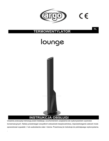 PL TERMOWENTYLATOR INSTRUKCJA OBSŁUGI Uważnie przeczytaj instrukcję przed instalacją i uruchomieniem urządzenia lub wykonywaniem czynności konserwacyjnych. Należy przestrzegać wszystkich wskazówek bezpieczeństwa, nieprzestrzeganie zaleceń może spowodować wypadek i / lub uszkodzenia ciała / mienia. Przechowuj te instrukcje do późniejszego wykorzystania. ` INFORMACJE DOTYCZĄCE BEZPIECZEŃŚTWA • Używaj urządzenia wyłącznie wg poniższej instrukcji. Każde inne zastosowanie nie zalecane przez producenta może spowodować pożar, porażenie prądem elektrycznym lub zranienia osób. • Upewnij się, że zasilanie sieciowe jest zgodne z napięciem podanym na tabliczce danych (230V ~ / 50Hz). • Produkt nie jest zabawką. Dzieci powinny być odpowiednio nadzorowane, aby nie bawiły się urządzeniem. • To urządzenie nie jest przeznaczone do użytku przez osoby (w tym dzieci) o ograniczonej sprawności fizycznej, sensorycznej lub psychicznej, lub bez odpowiedniego doświadczenia i wiedzy, chyba że są one odpowiednio nadzorowane podczas korzystania z tego urządzenia przez osobę odpowiedzialną za ich bezpieczeństwo. • Nie przykrywać urządzenia lub ograniczać wlotu i wylotu powietrza, aby zapobiec przegrzaniu. • Upewnij się, że wszystkie obiekty są co najmniej 1 metr od przodu i boków urządzenia. • Odłączyć zasilanie sieciowe, gdy urządzenie nie jest używane lub podczas konserwacji. • Unikaj używania termowentylatora w warunkach zapylenia lub w obecności łatwopalnych oparów (np. w warsztatach lub garażach, opary farby) • Nie wolno używać urządzenia do suszenia odzieży. • Używaj urządzenia w dobrze wentylowanym pomieszczeniu. • Nie wkładaj palców lub przedmiotów do wlotu / wylotu powietrza, gdyż może to doprowadzić do porażenia prądem lub pożaru lub uszkodzić urządzenie. Aby uniknąć ryzyka pożaru, nie należy zakrywać kratek lub manipulować nimi w jakikolwiek sposób podczas pracy urządzenia. • Nie należy używać urządzenia, jeśli kabel lub wtyczka są uszkodzone. Jeśli przewód zasilający jest uszkodzony, musi zostać wymieniony przez producenta, sprzedawcę lub wykwalifikowaną osobę w celu uniknięcia zagrożenia bezpieczeństwa. • Nie uruchamiaj urządzenia, jeśli spadło z wysokości lub poniosło szkodę w inny sposób. Skontaktuj się z wykwalifikowanym personelem technicznym do zbadania urządzenia. Nie wykonuj żadnych napraw elektrycznych i mechanicznych samodzielnie. • Najczęstszą przyczyną przegrzania jest zgromadzenie się pyłu w urządzeniu. Usuwaj kurz regularnie. Odłącz urządzenie i wyczyść wloty i wyloty powietrza i kratki przy pomocy odkurzacza. • Nie należy używać silnych detergentów do czyszczenia tego urządzenia. Czyścić urządzenia przy pomocy wilgotnej (ale nie mokrej) ściereczki wypłukanej w gorącej wodzie z mydłem. Zawsze wyjąć wtyczkę z gniazdka przed czyszczeniem. • Aby odłączyć termowentylator, przesuń przełącznik na OFF i wyjmij wtyczkę z gniazdka. Ciągnij za wtyczkę. Nie należy ciągnąć za przewód przy odłączaniu wentylatora. • Nie wolno umieszczać żadnych przedmiotów na przewodzie i nie wyginać ich. ` • Nie zaleca się używania przedłużaczy, ponieważ może się on przegrzać i spowodować ryzyko pożaru. Nie należy używać jednego przedłużacza do podłączenia wielu urządzeń. • Nie należy zanurzać przewodu, wtyczki lub jakiegokolwiek innego elementu urządzenia w wodzie lub innych cieczach. • Nie wolno dotykać wtyczki mokrymi rękami. • Nie należy umieszczać termowentylatora nad lub w pobliżu innego źródła ciepła. UWAGA ! UNIKAJ ZAKRYWANIA URZĄDZENIA CELEM UNIKNIĘCIA RYZYKA PRZEGRZANIA Mówi o tym również poniższy symbol: • Urządzenie może spowodować pożar, jeżeli, w czasie pracy, jest objęty lub styka się z materiałami palnymi (zasłony, firany, koce) itp. Przechowywać termowentylator Z DALA OD TYCH MATERIAŁÓW. • Nie należy podłączać urządzenia do źródła zasilania, zanim nie zostało ono prawidłowo zmontowane i ustawione. • Urządzenie nagrzewa się nieznacznie w czasie użytkowania. Aby uniknąć oparzeń, nie dotykaj powierzchni !!! • Nie należy układać kabla pod dywanami. Nie zakrywać przewodu kocami, dywanami lub podobnymi materiałami. Umieść przewód z dala od ruchliwych miejsc lub tam, gdzie może być przypadkowo pociągnięty. • Nie wolno używać grzałki wentylatora w bliskim sąsiedztwie wanny, prysznica, umywalki. • Nie ustawiaj grzejnika wentylatora poniżej gniazda zasilającego. • Nie używać urządzenia na zewnątrz. OSTRZEŻENIE: nie używać termowentylator z kontrolerem lub innym zewnętrznym urządzeniem który uruchamia urządzenie automatycznie, gdyż może spowodować pożar, szczególnie kiedy urządzenie jest przykryte w/w materiałami lub niewłaściwie ustawione. • Po pierwszym uruchomieniu, urządzenie może wydzielać lekki, nieszkodliwy zapach. Zapach ten jest efektem wstępnego podgrzewania wewnętrznych elementów grzejnych, i nie powtarza się później. OSTRZEŻENIE: PRZYCISK ON / OFF, nie jest jedynym środkiem odłączenia zasilania. Podczas serwisowania lub przesuwania GRZEJNIK, Zawsze wyłączaj kabel z gniazdka. ` INSTRUKCJA MONTAŻU Otwórz pudełko, następnie wyjmij 3 części urządzenia: pilot zdalnego sterowania, podstawę i urządzenie. 1. Umieść podstawę w dolnej części urządzenia i dokręć śruby. Urządzenie Podstawa Śruby 2. Ustaw urządzenie pionowo dopiero wtedy możesz je włączyć ON OPIS CZĘŚCI URZĄDZENIA 1. Przyciski i wyświetlacz LCD 2. Kratka wylotu powietrza 3. Prawa strona urządzenia wlot powietrza grille 4. Lewa strona urządzenia wlot powietrza 5. Podstawa 6. Pilot zdalnego sterowania 7. Klawisz Włącz (ON) Wyłącz (OFF) Widok z przodu Widok boczny Widok z tyłu JAK UŻYWAĆ URZĄDZENIA ? Ustaw urządzenie na stabilnej i płaskiej powierzchni Podłącz przewód zasila