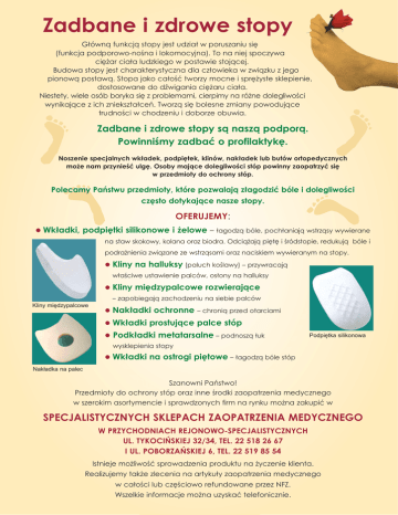 Zadbane i zdrowe stopy Główną funkcją stopy jest udział w poruszaniu się (funkcja podporowo-nośna i lokomocyjna). To na niej spoczywa ciężar ciała ludzkiego w postawie stojącej. Budowa stopy jest charakterystyczna dla człowieka w związku z jego pionową postawą. Stopa jako całość tworzy mocne i sprężyste sklepienie, dostosowane do dźwigania ciężaru ciała. Niestety, wiele osób boryka się z problemami, cierpimy na różne dolegliwości wynikające z ich zniekształceń. Tworzą się bolesne zmiany powodujące trudności w chodzeniu i doborze obuwia. Zadbane i zdrowe stopy są naszą podporą. Powinniśmy zadbać o profilaktykę. Noszenie specjalnych wkładek, podpiętek, klinów, nakładek lub butów ortopedycznych może nam przynieść ulgę. Osoby mające dolegliwości stóp powinny zaopatrzyć się w przedmioty do ochrony stóp. Polecamy Państwu przedmioty, które pozwalają złagodzić bóle i dolegliwości często dotykające nasze stopy. OFERUJEMY: Wkładki, podpiętki silikonowe i żelowe – łagodzą bóle, pochłaniają wstrząsy wywierane na staw skokowy, kolana oraz biodra. Odciążają piętę i śródstopie, redukują bóle i podrażnienia związane ze wstrząsami oraz naciskiem wywieranym na stopy. Kliny na halluksy (paluch koślawy) – przywracają właściwe ustawienie palców, osłony na halluksy Kliny międzypalcowe rozwierające – zapobiegają zachodzeniu na siebie palców Kliny międzypalcowe Nakładki ochronne – chronią przed otarciami Wkładki prostujące palce stóp Podkładki metatarsalne – podnoszą łuk Podpiętka silikonowa wysklepienia stopy Wkładki na ostrogi piętowe – łagodzą bóle stóp Nakładka na palec Szanowni Państwo! Przedmioty do ochrony stóp oraz inne środki zaopatrzenia medycznego w szerokim asortymencie i sprawdzonych firm na rynku można zakupić w SPECJALISTYCZNYCH SKLEPACH ZAOPATRZENIA MEDYCZNEGO W PRZYCHODNIACH REJONOWO-SPECJALISTYCZNYCH UL. TYKOCIŃSKIEJ 32/34, TEL. 22 518 26 67 I UL. POBORZAŃSKIEJ 6, TEL. 22 519 85 54 Istnieje możliwość sprowadzenia produktu na życzenie klienta. Realizujemy także zlecenia na artykuły zaopatrzenia medycznego w całości lub częściowo refundowane przez NFZ. Wszelkie informacje można uzyskać telefonicznie.