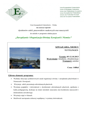 Unia Europejskich Federalistów – Polska ma zaszczyt zaprosić dyrektorów szkół, pracowników naukowych oraz nauczycieli do udziału w programie edukacyjnym „Zarządzanie i Organizacja Oświaty Szwajcarii i Niemiec” SZWAJCARIA, NIEMCY TUTTLINGEN Termin: 05-12.10.2013 Wyżywienie: śniadania, obiadokolacje Transport: autokar Cena: 1480zł Główne elementy programu: ● Wykłady dotyczące podstawowych zasad organizacji oświaty i zarządzania placówkami w Niemczech i Szwajcarii. ● ● Wizytacja szkół, prezentacja odwiedzanych placówek. Wymiana poglądów i doświadczeń z dyrektorami odwiedzanych placówek, spotkania z kadrą pedagogiczną, dyskusje na temat metodyki nauczania oraz kształcenia nauczycieli i doskonalenia zawodowego. ● Wizytacje zajęć w klasach. Możliwość nawiązania ciekawej współpracy i wymiany doświadczeń. Rada Europy w Strassburgu ( Francja ) – wejście z przewodnikiem , oprowadzanie, wykład tematyczny z możliwością dyskusji . Elementy turystyczne: Schwarzwald (Triberg), Konstancja nad Jeziorem Bodeńskim, Zurich, Ulm, Freiburg. Program obejmie wizyty w szkołach, w ramach których planowane są spotkania z kadrą pedagogiczną, zwiedzanie obiektów, hospitacja zajęć. Uczestnicy będą mieli szansę porównania metod nauczania stosowanych w Niemczech, Szwajcarii i Polsce, nawiązania kontaktów z kadrą szkół szwajcarskich i niemieckich. Po zakończeniu programu uczestnicy seminarium otrzymują certyfikaty, które mogą być przydatne przy awansie zawodowym. Termin: 05-12.10.2013r Grupa: 40 osób Cena: 1480 zł obejmuje: przygotowanie programu, transport autokarem klimatyzowanym (WC, Barek, DVD), 5 noclegów w Tuttlingen w ośrodku szkoleniowym: pokoje 2 i 3 osobowe, łóżka małżeńskie z podwójną oddzielną pościelą, wyżywienie polskie (śniadania i obiadokolacje) plus prowiant przy śniadaniach, ubezpieczenie KL, NNW, Assistance w PZU, wizytowanie placówek tłumaczenia wykładów oraz praktyczną pomoc kierownika wyjazdu i tłumacza. Osoby zainteresowane prosimy o kontakt celem przesłania ramowego programu. Rezerwacja miejsc Podstawą do rezerwacji miejsca jest przesłanie listem, faksem, telefonicznie lub e-mailem zgłoszenia zawierającego imię, nazwisko, adres, PESEL, telefon kontaktowy, faks/mail oraz adres miejsca pracy wszystkich uczestników wyjazdu. W terminie 05.06.2013 należy wpłacić zaliczkę w wysokości 400 zł, a do dnia pozostałą kwotę tzn. 1080 zł. na konto UEF- Polska. Przy wpłatach proszę dopisać: Tuttlingen_05-12.10.2013 oraz imię i nazwisko uczestnika Konto UEF: Nordea Bank Polska 94 1440 1231 0000 0000 0542 9455 Serdecznie zapraszamy do udziału w programie! Kierownik sekcji niemieckojęzycznej Jan Makrocki e-mail: [email protected] tel.: 0048 42 630 08 22 wew.25 fax: 0048 42 639 77 70