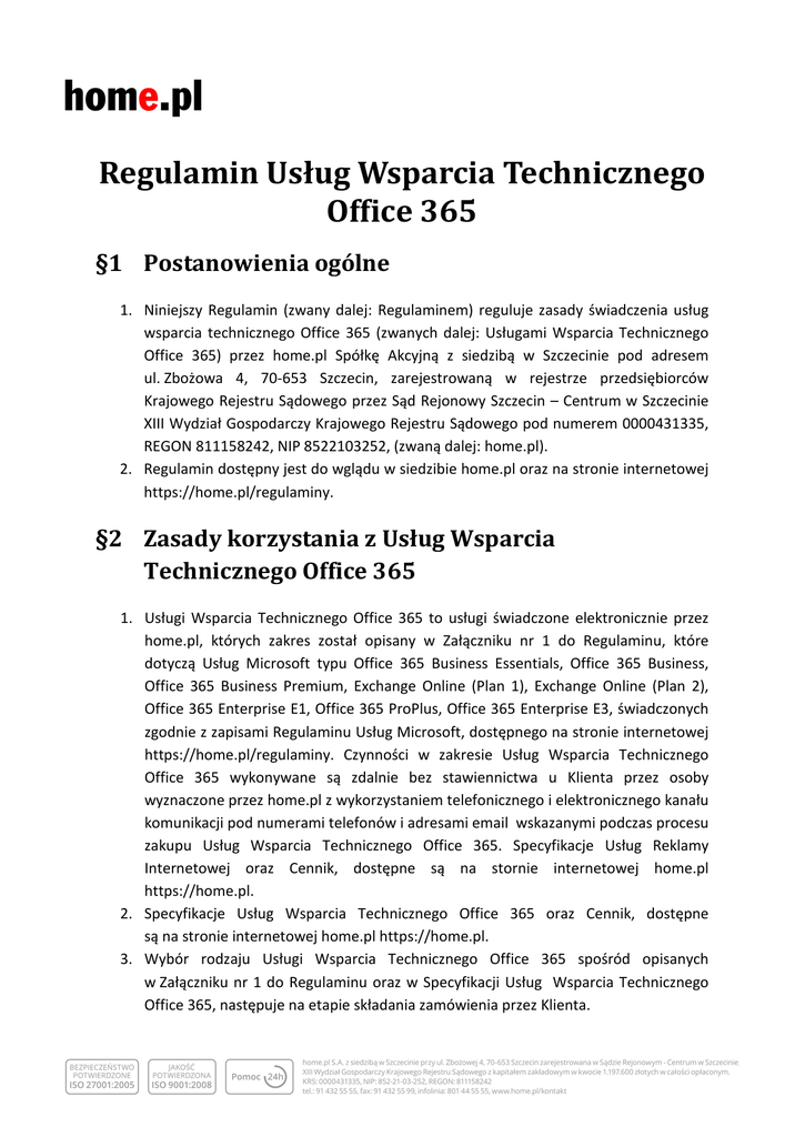 Regulamin Usług Wsparcia Technicznego Office 365 §1 Postanowienia ogólne 1. Niniejszy Regulamin (zwany dalej: Regulaminem) reguluje zasady świadczenia usług wsparcia technicznego Office 365 (zwanych dalej: Usługami Wsparcia Technicznego Office 365) przez home.pl Spółkę Akcyjną z siedzibą w Szczecinie pod adresem ul. Zbożowa 4, 70-653 Szczecin, zarejestrowaną w rejestrze przedsiębiorców Krajowego Rejestru Sądowego przez Sąd Rejonowy Szczecin – Centrum w Szczecinie XIII Wydział Gospodarczy Krajowego Rejestru Sądowego pod numerem 0000431335, REGON 811158242, NIP 8522103252, (zwaną dalej: home.pl). 2. Regulamin dostępny jest do wglądu w siedzibie home.pl oraz na stronie internetowej https://home.pl/regulaminy. §2 Zasady korzystania z Usług Wsparcia Technicznego Office 365 1. Usługi Wsparcia Technicznego Office 365 to usługi świadczone elektronicznie przez home.pl, których zakres został opisany w Załączniku nr 1 do Regulaminu, które dotyczą Usług Microsoft typu Office 365 Business Essentials, Office 365 Business, Office 365 Business Premium, Exchange Online (Plan 1), Exchange Online (Plan 2), Office 365 Enterprise E1, Office 365 ProPlus, Office 365 Enterprise E3, świadczonych zgodnie z zapisami Regulaminu Usług Microsoft, dostępnego na stronie internetowej https://home.pl/regulaminy. Czynności w zakresie Usług Wsparcia Technicznego Office 365 wykonywane są zdalnie bez stawiennictwa u Klienta przez osoby wyznaczone przez home.pl z wykorzystaniem telefonicznego i elektronicznego kanału komunikacji pod numerami telefonów i adresami email wskazanymi podczas procesu zakupu Usług Wsparcia Technicznego Office 365. Specyfikacje Usług Reklamy Internetowej oraz Cennik, dostępne są na stornie internetowej home.pl https://home.pl. 2. Specyfikacje Usług Wsparcia Technicznego Office 365 oraz Cennik, dostępne są na stronie internetowej home.pl https://home.pl. 3. Wybór rodzaju Usługi Wsparcia Technicznego Office 365 spośród opisanych w Załączniku nr 1 do Regulaminu oraz w Specyfikacji Usług Wsparcia Technicznego Office 365, następuje na etapie składania zamówienia przez Klienta. 4. Warunkiem koniecznym do skorzystania z Usług Wsparcia Technicznego Office 365 jest: a) zaakceptowanie postanowień niniejszego Regulaminu, oraz b) zaakceptowanie postanowień Regulaminu sieci home.pl, oraz c) zaakceptowanie i zobowiązanie się do spełnienia warunków technicznych, w tym udzielenia informacji i dostępów, koniecznych do wykonania Usługi Wsparcia Technicznego Office 365 wskazanych przez specjalistę z home.pl w trybie pkt. 5 poniżej. 5. W terminie 3 dni od dnia uiszczenia przez Klienta ceny z tytułu Usług Wsparcia Technicznego Office 365 specjalista z home.pl skontaktuje się z Klientem telefonicznie na numer telefonu podany przez Klienta w Panelu Klienta celem przekazania informacji niezbędnych do wykonania Usług Wsparcia Technicznego Office 365 i ustalenia zakresu poszczególnych działań, terminów ich wykonania oraz zakresu warunków technicznych, informacji i dostępów, koniecznych do wykonania Usługi Wsparcia Technicznego Office 365, które muszą być spełnione lub dostarczone przez Klienta. 6. Usługa Wsparcia Technicznego Office 365 zostanie wykonana w terminie 7 dni od dnia spełnienia lub dostarczenia przez Klienta w sposób uzgodniony w trybie pkt. 5 powyżej warunków technicznych, informacji i dostępów, koniecznych do wykonania Usługi Wsparcia Technicznego Office 365. §3 Rozwiązanie umowy o świadczenie przez home.pl Usługi Wsparcia Technicznego Office 365 1. Umowa o świadczenie Usługi Wsparcia Technicznego Office 365 zawierana jest na czas oznaczony obejmujący okres niezbędny do wykonania Usługi Wsparcia Technicznego Office 365. 2. Umowa o świadczenie Usługi Wsparcia Technicznego Office 365 może być rozwiązana przez Klienta przed upływem okresu wskazanego w pkt 1 powyżej, jedynie z przyczyn zależnych wyłącznie od home.pl tj. w przypadku niewykonania lub nienależytego wykonania Usługi Wsparcia Technicznego Office 365. Do rozwiązania umowy o świadczenie Usługi Wsparcia Technicznego Office 365 nie znajdują zastosowania zapisy Regulaminu sieci home.pl przewidujące możliwość rozwiązania przez Klienta umowy zawartej z home.pl w trybie wypowiedzenia, z wyjątkiem zapisu przewidującego możliwość wypowiedzenia umowy zawartej z home.pl w przypadku zmiany niniejszego Regulaminu lub Regulaminu sieci home.pl. §4 Postanowienia końcowe 1. 2. W sprawach nieuregulowanych w niniejszym Regulaminie zastosowanie znajduje Regulamin sieci home.pl, dostępny na stronie https://home.pl/regulaminy. home.pl zastrzega sobie możliwość zmiany Załącznika nr 1 do Regulaminu poprzez zmianę typów i rodzajów Usług Wsparcia Technicznego Office 365 (rozszerzanie i ograniczanie, dopisywanie nowych). Zmiana taka nie stanowi zmiany Regulaminu w rozumieniu przepisów prawa oraz Regulaminu sieci home.pl. Zmiana taka nie wpływa na korzystanie z Usług Wsparcia Technicznego Office 365 na podstawie zawartych przed jej wprowadzeniem umów o świadczenie przez home.pl Usługi Wsparcia Technicznego Office 365.