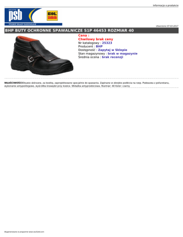 Informacje o produkcie Utworzono 07-03-2017 BHP BUTY OCHRONNE SPAWALNICZE S1P 46453 ROZMIAR 40 Cena : Chwilowy brak ceny Nr katalogowy : 25323 Producent : BHP Dostępność : Zapytaj w Sklepie Stan magazynowy : brak w magazynie Średnia ocena : brak recenzji WŁAŚCIWOŚCIObuwie skórzane, za kostkę, zaprojektowane specjalnie do spawania. Zapinane w obrębie podbicia na rzep. Podeszwa z poliuretanu, wykonanie antypoślizgowe, wyściółka krawędzi przy kostce. Wkładka antyprzebiciowa. Rozmiar: 40 Kolor: czarny Wygenerowano w programie www.oscGold.com