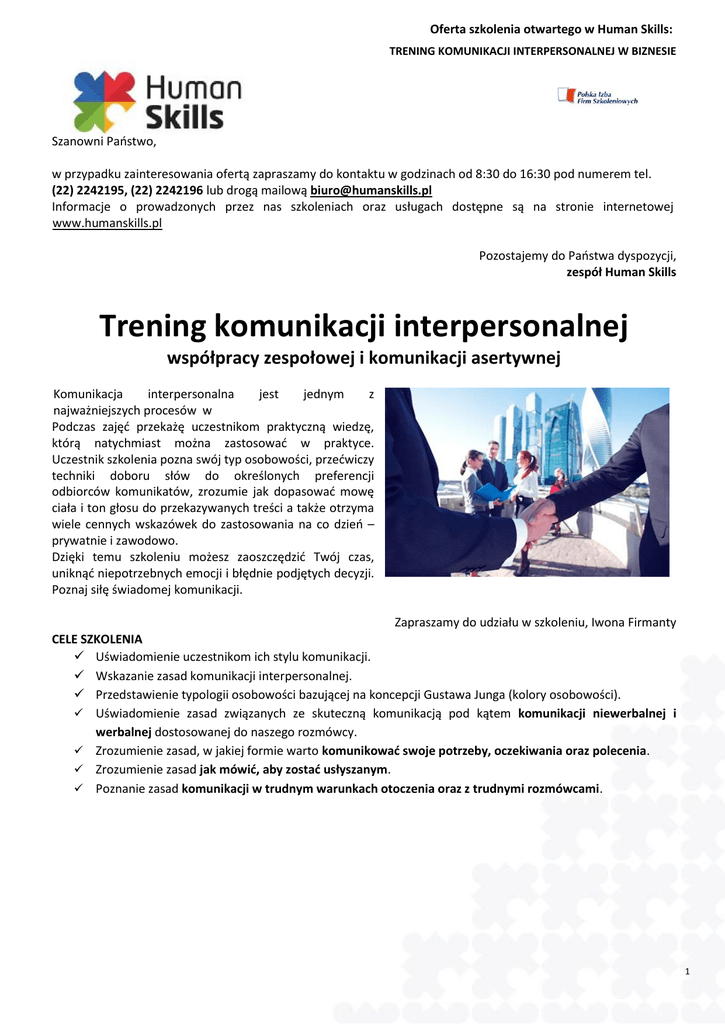 Oferta szkolenia otwartego w Human Skills: TRENING KOMUNIKACJI INTERPERSONALNEJ W BIZNESIE Szanowni Państwo, w przypadku zainteresowania ofertą zapraszamy do kontaktu w godzinach od 8:30 do 16:30 pod numerem tel. (22) 2242195, (22) 2242196 lub drogą mailową [email protected] Informacje o prowadzonych przez nas szkoleniach oraz usługach dostępne są na stronie internetowej www.humanskills.pl Pozostajemy do Państwa dyspozycji, zespół Human Skills Trening komunikacji interpersonalnej współpracy zespołowej i komunikacji asertywnej Komunikacja interpersonalna jest jednym z najważniejszych procesów w Podczas zajęć przekażę uczestnikom praktyczną wiedzę, którą natychmiast można zastosować w praktyce. Uczestnik szkolenia pozna swój typ osobowości, przećwiczy techniki doboru słów do określonych preferencji odbiorców komunikatów, zrozumie jak dopasować mowę ciała i ton głosu do przekazywanych treści a także otrzyma wiele cennych wskazówek do zastosowania na co dzień – prywatnie i zawodowo. Dzięki temu szkoleniu możesz zaoszczędzić Twój czas, uniknąć niepotrzebnych emocji i błędnie podjętych decyzji. Poznaj siłę świadomej komunikacji. Zapraszamy do udziału w szkoleniu, Iwona Firmanty CELE SZKOLENIA  Uświadomienie uczestnikom ich stylu komunikacji.  Wskazanie zasad komunikacji interpersonalnej.  Przedstawienie typologii osobowości bazującej na koncepcji Gustawa Junga (kolory osobowości).  Uświadomienie zasad związanych ze skuteczną komunikacją pod kątem komunikacji niewerbalnej i werbalnej dostosowanej do naszego rozmówcy.  Zrozumienie zasad, w jakiej formie warto komunikować swoje potrzeby, oczekiwania oraz polecenia.  Zrozumienie zasad jak mówić, aby zostać usłyszanym.  Poznanie zasad komunikacji w trudnym warunkach otoczenia oraz z trudnymi rozmówcami. 1 Oferta szkolenia otwartego w Human Skills: TRENING KOMUNIKACJI INTERPERSONALNEJ W BIZNESIE KORZYŚCI DLA UCZESTNIKÓW  Rozwój kompetencji z zakresu komunikacji ustnej oraz pisemnej w życiu zawodowym/prywatnym.  Wzrost osobistej skuteczności oraz efektywności zawodowej.  Poznanie behawioralnych aspektów komunikacji oraz technik oddziaływania na pierwotną część mózgu naszego rozmówcy.  Znajomość narzędzi do wykorzystania podczas budowania relacji w tym między innymi nabycie umiejętności dopasowania się do swojego rozmówcy pod kątem jego typu osobowości.  Umiejętność radzenia sobie w trudnych sytuacjach. ADRESACI SZKOLENIA  Osoby zainteresowane rozwojem kompetencji z zakresu komunikacji interpersonalnej.  Osoby pracujące w zespołach.  Osoby zainteresowane rozwojem osobistym. METODA SZKOLENIOWA Szkolenie prowadzone zgodnie z cyklem Kolba oraz zgodnie z metodą ABL (Activity Based Learning). Uczestnicy będą brali udział w aktywizujących ćwiczeniach indywidualnych oraz grupowych poprzedzonych niezbędnym wprowadzeniem teoretycznym. Uczestnicy będą mieli również możliwość autodiagnozy oraz otrzymają feedback od trenera. Trener będzie przedstawiał merytorykę zgodnie z 3 kanałami przekazu informacji – wzrok, ruch, słuch. Panel dyskusyjny, ćwiczenia grupowe i indywidualne, prezentacja, odgrywanie ról, analiza przypadków i filmów poglądowych. PROFIL TRENERA: Szkolenie poprowadzi Iwona Firmanty Iwona Firmanty jest trenerem z wieloletnim doświadczeniem zawodowym. Dyplomowany psycholog i socjolog – magister do kwadratu. Pracuje również jako coach zgodnie z wytycznymi ICF. Założyła firmę szkoleniową Human Skills i z każdym rokiem rośnie grono Klientów, którzy zaufali jakości realizowanych przez Iwonę szkoleń. Iwona Firmanty zajmuje się szeroko pojętą inżynierią psychospołeczną. Specjalizuje się w praktycznym i pragmatycznym podejściu do realizowanych przez nią projektów. Każdy z uczestników korzystający ze szkoleń Iwony otrzymuje wachlarz rozwiązań swoich problemów i rebusów. Iwona otwiera oczy swoim Klientom i uczy ich patrzenia na drugą stronę każdego medalu. Dzięki temu szkolenia prowadzone przez Iwonę Firmanty przynoszą Klientom konkretny zysk i oszczędności. Iwona udziela się również w mediach typu TVN, Polsat, TVP 1 oraz w radiu. O efektach jej pracy można przeczytać w artykułach w gazetach typu „Zwierciadło” oraz „Sens”. 2 Oferta szkolenia otwartego w Human Skills: TRENING KOMUNIKACJI INTERPERSONALNEJ W BIZNESIE I DZIEŃ 09:30 – 09:45 Rozpoczęcie, omówienie celów szkolenia z zakresu komunikacji interpersonalnej oraz potrzeb uczestników. 09:45 – 10:30 FUNDAMENTY SKUTECZNEJ KOMUNIKACJI INTERPERSONALNEJ   Zasady budowania efektywnej komunikacji interpersonalnej. Komunikacja interpersonalna a poziomy świadomości – mózg pierwotny i mózg współczesny. Autoprezentacja poprzez komunikację werbalną i niewerbalną. Komunikacja niewerbalna – znaczenie mowy ciała a badania A. Meharbiana. Komunikacja werbalna – znaczenie tonu głosu i siły pozytywnych sformułowań.  Najczęstsze błędy w komunikacji.    10:30 – 10:45 Przerwa 10:45- 13:00 TYPY OSOBOWOŚCI W KOMUNIKACJI W ZESPOLE  Czynnik osobowości G. Gallupa.  Skuteczna komunikacja ze wzrokowcami, słuchowcami i kinestetykami.  Analiza transakcyjna E. Berna.  Typy osobowości G. Junga.  Style komunikacji z określonymi typami osobowości. 13:00 – 13:40 Przerwa na obiad 13:40 – 15:15 GRA W KOLORY – KOMUNIKACJA W PRAKTYCE  Gra w kolory – podział grupy zgodnie z wynikami testu w antagonistyczne grupy, których celem będzie osiągnięcie wspólnego celu. Zespoły będą miały za zadanie zakomunikowanie w formie grupowej prezentacji swojego celu. Podczas tego ćwiczenia grupa ma możliwość przećwiczenia w praktyce najważniejszego fundamentu komunikacji interpersonalnej. 15:15 – 15:30 Przerwa 15:30 – 16:15 MODUŁ – NETWORKING, CZYLI BUDOWANIE SIECI KONTAKTÓW  Elevator Speech – praca indywidualna i grupowa z elementami prezentacji.  Twoje mocne strony i mówienie o sobie językiem korzyści dl
