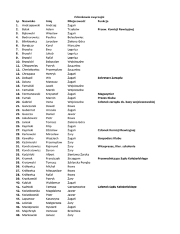Lp 1. 2. 3. 4. 5. 6. 7. 8. 9. 10. 11. 12. 13. 14. 15. 16. 17. 18. 19. 20. 21. 22. 23. 24. 25. 26. 27. 28. 29. 30. 31. 32. 33. 34. 35. 36. 37. 38. 39. 40. 41. 42. 43. 44. 45. 46. 47. 48. Nazwisko Andrzejewski Balak Bąkowski Bednarowicz Blinkiewicz Borejszo Brzeska Brzeski Brzeski Brzezicki Chłopowiec Chmielowiec Chrząszcz Dokupil Dziura Famulski Famulski Formanowski Furtak Gabriel Ganczarek Gubernat Guszcza Jakubowicz Janiak Kapiński Kapiński Karkowski Kawałko Kaźmierski Kondratowicz Kondratowicz Kościński Kramek Krotowski Królewicz Królewicz Królewicz Krzykawski Kubiak Kuźnicki Kwiatkowska Kwiatkowski Lapunow Leśniak Maciejewski Majchrzyk Markowski Imię Andrzej Adam Wiesław Paulina Jarosław Karol Ewa Jakub Rafał Sebastian Patryk Przemysław Henryk Wit Mateusz Jacek Marek Krzysztof Marcin Irena Dawid Urszula Daniel Piotr Tomasz Filip Zdzisław Mirosław Wojciech Przemysław Rajmund Zenon Albert Franciszek Tomasz Michał Mieczysław Rafał Patryk Waldemar Tomasz Magdalena Piotr Katarzyna Małgorzata Ryszard Ireneusz Janusz Członkowie zwyczajni Miejscowość Funkcja Żagań Trzebów Przew. Komisji Rewizyjnej Żagań Bolesławiec Zielona Góra Marszów Legnica Legnica Legnica Wojcieszów Szczaniec Szczaniec Żagań Żagań Sekretarz Zarządu Żagań Wojcieszów Wojcieszów Żagań Magazynier Żagań Prezes Klubu Wojcieszów Członek zarządu ds. bazy wojcieszowskiej Iłowa Żagań Jawor Iłowa Zielona Góra Żagań Żagań Członek Komisji Rewizyjnej Żary Żagań Gospodarz Klubu Żary Żary Wiceprezes, Kier. szkolenia Żary Sieniawa Żarska Strzegom Przewodniczący Sądu Koleżeńskiego Szklarska Poręba Iłowa Iłowa Iłowa Żary Żagań Gorzanowice Członek Sądu Koleżeńskiego Jawor Jawor Żagań Żary Żagań Brzeźnica Żary 49. 50. 51. 52. 53. 54. 55. 56. 57. 58. 59. 60. 61. 62. 63. 64. 65. 66. 67. 68. 69. 70. 71. 72. 73. 74. 75. 76. 77. 78. 79. 80. 81. 82. 83. 84. 85. 86. 87. 88. 89. 90. 1. 2. 3. 4. 5. 6. Muszyński Muszyński Muszalski Nowotny Oleksy Oleksy Orzech Pałka Piotrowska Pisarczyk Rotarski Ruczkowski Sałabaj Sawicka Sawicki Sawicki Sawicki Sawicka Sawicka Sawicz Sawicz Sieja Sieja Sokołowski Szkudlarek Szukała Świątek Tomaszewski Urszulak Urszulak Wałasiewicz Wcisło Werbiński Wojewódzki Wójcik Wójtowicz Zema Zema Zięba Zyzańska Zyzańska Żurek Banaszak Blaurok Danieliszyn Drabik Kowal Muskała Grzegorz Robert Grzegorz Marcin Marcin Daniel Anna Bogdan Magdalena Andrzej Jakub Bartosz Stanisław Halina Łukasz Marek Marek Patrycja Małgorzata Dariusz Robert Katarzyna Marcin Jacek Krzysztof Piotr Robert Krzysztof Jan Przemysław Andrzej Renata Jan Ireneusz Rafał Łukasz Mirosław Katarzyna Wiesław Maria Halina Roman Żagań Żagań Żagań Żagań Żagań Żagań Złotoryja Żagań Mirostowice Dolne Żary Żagań Żary Kunice Legnickie Żagań Żagań Żagań Konin Żagański Iłowa Iłowa Żary Żary Żagań Żagań Szczaniec Bogatynia Poznań Żagań Szprotawa Żary Żary Kowary Żagań Żary Zielona Góra Wrocław Iłowa Żagań Żagań Żagań Żagań Żagań Żagań Zbigniew Andrzej Ireneusz Józef Zbigniew Zdzisław Członkowie honorowi Żagań Żagań Żagań Żagań Żagań Żagań Członek Sądu Koleżeńskiego Członek Komisji Rewizyjnej Skarbnik Członek zarządu ds. promocji i projektów Gospodarz Klubu 7. 8. 9. 10. 11. 12. 1. 2. 3. 4. Nowak Stępień Szynkiewicz Klimas Koisar Zyzański Bochynek Lapunow Konwent Raszka Bronisław Mieczysław Adam Józef Bernard Henryk Żagań Nicea Wrocław Zielona Góra Warszawa Żagań Marian Edward Andrzej Bożena Członkowie wspierający Janowice Wielkie Żagań Magazynier Wrocław Żagań