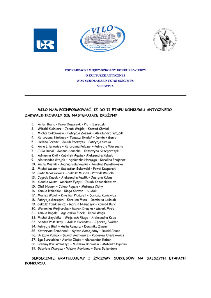 PODKARPACKI MIĘDZYSZKOLNY KONKURS WIEDZY O KULTURZE ANTYCZNEJ NON SCHOLAE SED VITAE DISCIMUS VI EDYCJA MIŁO NAM POINFORMOWAĆ, IŻ DO II ETAPU KONKURSU ANTYCZNEGO ZAKWALIFIKOWAŁY SIĘ NASTĘPUJĄCE DRUŻYNY: 1. 2. 3. 4. 5. 6. 7. 8. 9. 10. 11. 12. 13. 14. 15. 16. 17. 18. 19. 20. 21. 22. 23. 24. 25. 26. 27. 28. 29. Artur Bialic – Paweł Kasprzyk – Piotr Szredzki Witold Kuśnierz – Jakub Wajda – Konrad Chmiel Michał Sokołowski – Patrycja Zoszak – Aleksandra Wójcik Katarzyna Stokłosa – Tomasz Smoleń – Dominik Gunia Helena Perenc – Jakub Początek – Patrycja Sroka Anna Litarowicz – Katarzyna Pelczar – Patrycja Warzecha Julia Dural – Joanna Sanocka – Katarzyna Grzegorczyk Adrianna Król – Cużytek Agata – Aleksandra Kabala Aleksandra Stojak – Agnieszka Haręzga – Karolina Prajtner Anita Maśnik - Joanna Bolanowska - Karolina Kwiatkowska Michał Mazur – Sebastian Bukowski – Paweł Kasperski Piotr Mrożkiewicz – Łukasz Murias – Patryk Walicki Jagoda Kazak – Aleksandra Pawlik – Justyna Kubas Klaudia Musz – Mariusz Fynyk – Jakub Kozaczkiewicz Olaf Hadam – Jakub Rogala – Mateusz Cichy Kamila Dziedzic – Kinga Chrzan – Siudak Maciej Walat – Krystian Płodzień – Dariusz Koniewicz Patrycja Szczęch - Karolina Musz - Dominika Leśniak Łukasz Tomkiewicz - Marcin Niemczyk - Konrad Barć Weronika Wojturska – Marek Drupka – Marek Mróz Kamila Rogala – Agnieszka Ficek – Karol Wnęk Michał Szydełko - Wojciech Plizga - Aleksandra Koba Sandra Posłuszny - Jakub Sieradzki - Jędrzej Świder Patrycja Bień – Anita Rymarz – Dominika Zywar Katarzyna Bembenek – Sylwia Samojedny – Dawid Gruca Urszula Rumak – Dawid Błachowicz – Radosław Oleszkowicz Iga Burzyńska – Adrian Zięba – Aleksander Reben Przemysław Wołoszyn – Mieszko Borowski – Mateusz Kijanka Gabriela Charysz – Woźny Adrianna – Sara Sztandera SERDECZNIE GRATULUJEMY I ŻYCZYMY SUKCESÓW NA DALSZYCH ETAPACH KONKURSU. PÓŁFINAŁ KONKURSU ODBĘDZIE SIĘ 13 STYCZNIA 2015R. (wtorek) O GODZ. 10.00 W VI LICEUM OGÓLNOKSZTAŁCĄCYM W RZESZOWIE (AULA). Równocześnie przypominamy, iż zgodnie z Regulaminem etap II polega na napisaniu przez każdą drużynę reportażu związanego z tematem Konkursu. Praca ta ma zawierać max 250 słów. Czas trwania II etapu Konkursu wynosi 90 minut. Wyniki posłużą do wyłonienia najlepszych 8 drużyn, które uzyskają statut Finalistów i wezmą udział w Finale (Instytut Historii – Uniwersytet Rzeszowski). Podstawowym narzędziem komunikacji między Organizatorami i Uczestnikami Konkursu jest strona internetowa VI LO (http://www.lo6.resman.pl/konkursy.php), gdzie zamieszczone są Regulamin, komunikaty, a także wyniki poszczególnych stopni Konkursu. Z poważaniem, dr Beata Blahaczek mgr Bogumiła Zielińska www.6lo.rzeszow.pl/konkursy Organizator: Zakład Historii Starożytnej i Orientalistyki Instytutu Historii UR VI Liceum Ogólnokształcące w Rzeszowie Patronat Honorowy : JM Rektor Uniwersytetu Rzeszowskiego prof. dr hab. Aleksandre Bobko Dyrektor Zespołu Szkół Nr 1 w Rzeszowie Tadeusz Bajda Podkarpacki Kurator Oświaty Jacek Wojtas Patronat medialny: