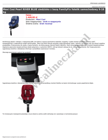 Informacje o produkcie Utworzono 07-03-2017 Maxi Cosi Pearl RIVER BLUE siedzisko z bazą FamilyFix fotelik samochodowy 9-18 kg Cena : 1.448,00 zł pl Producent : Maxi Cosi Stan magazynowy : brak w magazynie Średnia ocena : brak recenzji zk a. Kombinacja jakości i designu z najwyższej półki, do wyboru 5 pozycji pochylenia siedziska, wygodny i szybki montaż systemem "kliknij-i-jedź", kompatybilność z większością modeli samochodów - Maxi-Cosi Pearl oferuje wszystko czego potrzebuje rodzic i dziecko, by w pełni móc się cieszyć wspólną przejażdżka. Przeznaczony do użytku z bazą FamilyFix, do której pasuje również fotelik CabrioFix. Pearl otrzymał wysokie oceny w testach bezpieczeństwa. Zapewnia optymalne bezpieczeństwo dzięki połączeniu z systemem ISOFIX i oferuje łatwość obsługi do ok. 4 roku życia dziecka. Dla Twojej pewności, sygnalizacja świetlna i dźwiękowa informuje o prawidłowo wykonanym montażu. .c al in ec Dlaczego powinienem wybrać ten produkt? w w w Sygnalizacja świetlna i dźwiękowa bazy FamilyFix potwierdza prawidłowy montaż fotelika na bazie minimalizując ryzyko popełnienia błędu To innowacyjne rozwiązanie powoduje, że po otwarciu zamka szelki odchylaja sie i pozostaja w rozchylonej pozycji Wygenerowano w programie www.oscGold.com ec zk a. pl Jednoczesna i wygodna regulacja wysokości szelek uprzęży i zagłówka in Do wyboru 5 komfortowych pozycji ustawienia siedziska od półleżącej do spania, do pionowej do siedzenia Cechy produktu: .c al Łatwy w użytkowaniu Bardzo łatwa regulacja wysokości szelek uprzęży oraz zagłówka Innowacyjne rozwiązanie utrzymujące szelki w pozycji otwartej zapewnia łatwe umieszczenia i wyjmowanie dziecka Łatwe zdejmowanie tapicerki Tapicerka może być czyszczona i prana w pralce ISOFIX zapewnia bezpieczeństwo, łatwy i szybki montaż fotelika w Komfort 4 komfortowe pozycje położenia siedziska od siedzącej do leżącej (do spania) w Bezpieczeństwo Sygnalizacja świetlna i dźwiękowa minimalizuje ryzyko popełnienia błędu podczas montażu Wysoko oceniony w testach w połączeniu z bazą FamilyFix w Informacje ogólne 5 punktowe szelki zapewniają bezpieczeństwo dziecku przed twardymi elemntami przy uderzeniu czołowym Użytkowany z bazą FamilyFix zapewnia bezpieczeństwo oraz łatwość użytkowania od urodzenia do około 4 lat Optymalne bezpieczeństwo w przypadku uderzń bocznych (SPS) Użytkowanie przodem do kierunku jazdy od około 9 miesięcy do około 4 lat życia dziecka Produkowany w Europie ZESTAW MAXI-COSI FAMILY: 1 ISOFIX BAZA + 2 FOTELIKI SAMOCHODOWE = PONAD 3 LATA DLA PODSTAWOWEGO BEPIECZNEGO I ŁATWEGO UŻYTKOWANIA ec Elastyczny i bezproblemowy Isofix - bezpieczne rozwiązanie podróży zk a. pl Informacje o produkcie Dlaczego wybrać Zestaw Family Concept? in Zestaw Family Concept składający się z bazy FamilyFix oraz fotelików samochodowych Pebble i Pearl, to najlepsza ochrona Isofix jaką Maxi-Cosi ma do zaoferowania rodzinie. Zaprojektowany tak, aby doskonale pasowały do siebie, trzy elementy można kupić oddzielnie w każdym momencie jeżeli jest taka potrzeba. w w w .c al Baza FamilyFix stosowana jest w celu zamontowania fotelika Pebble Ta sama baza stosowana jest do zamontowania fotelika Pearl Od urodzenia do 3½ lat stosowania bezpieczmnego systemu Isofix (najwyższe oceny testów): solidny montaż ISOFIX w samochodzie, kontrolki diodowe i sygnał dźwiękowy potwierdzą prawidłowe i bezpieczne zamocowanie bazy i fotelika oraz dodatkowe boczną ochronę 3½ roku łatwego użytkowania: bez potrzeby stosowania pasów bezpieczeństwa, lekkie foteliki, 'łatwo odpinana' uprząż połączona z regulowanym zagłówkiem Dodatkowa pionowa pozycja w foteliku Pebble lub Cabriofix, zapewnia dodatkowe miejsce na nogi, co powoduje, że dziecko może dłużej podróżować w pozycji tyłem do kierunku jazdy Dodatkowa pozycja pionowa w foteliku Pearl Wygenerowano w programie www.oscGold.com w w pl zk a. ec in .c al w