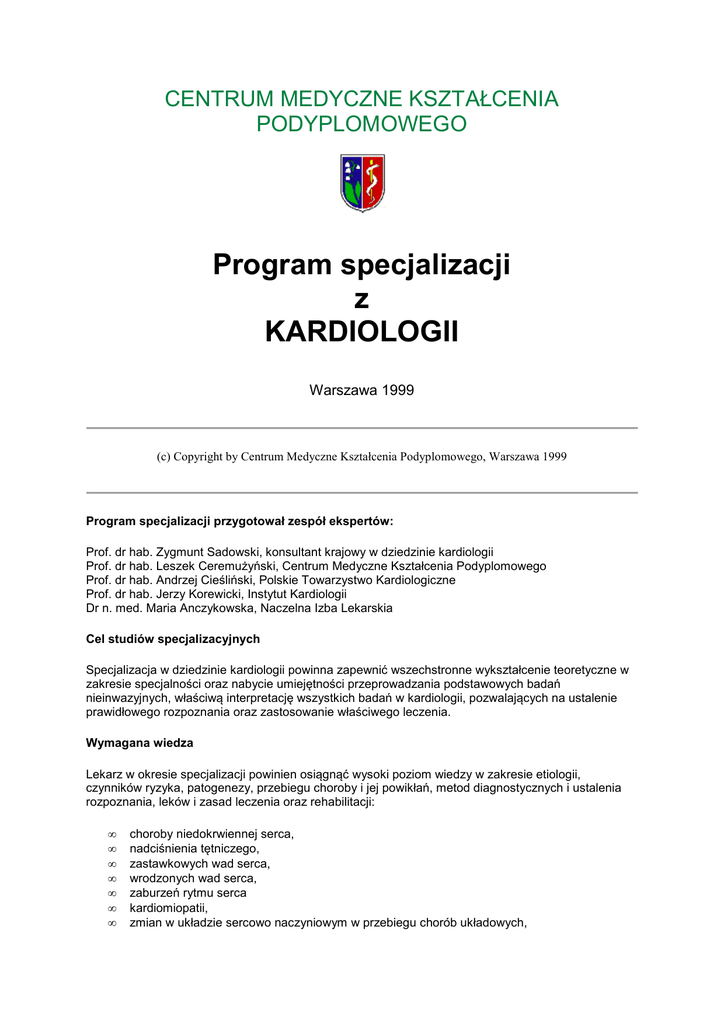 CENTRUM MEDYCZNE KSZTAŁCENIA PODYPLOMOWEGO Program specjalizacji z KARDIOLOGII Warszawa 1999 (c) Copyright by Centrum Medyczne Kształcenia Podyplomowego, Warszawa 1999 Program specjalizacji przygotował zespół ekspertów: Prof. dr hab. Zygmunt Sadowski, konsultant krajowy w dziedzinie kardiologii Prof. dr hab. Leszek Ceremużyński, Centrum Medyczne Kształcenia Podyplomowego Prof. dr hab. Andrzej Cieśliński, Polskie Towarzystwo Kardiologiczne Prof. dr hab. Jerzy Korewicki, Instytut Kardiologii Dr n. med. Maria Anczykowska, Naczelna Izba Lekarskia Cel studiów specjalizacyjnych Specjalizacja w dziedzinie kardiologii powinna zapewnić wszechstronne wykształcenie teoretyczne w zakresie specjalności oraz nabycie umiejętności przeprowadzania podstawowych badań nieinwazyjnych, właściwą interpretację wszystkich badań w kardiologii, pozwalających na ustalenie prawidłowego rozpoznania oraz zastosowanie właściwego leczenia. Wymagana wiedza Lekarz w okresie specjalizacji powinien osiągnąć wysoki poziom wiedzy w zakresie etiologii, czynników ryzyka, patogenezy, przebiegu choroby i jej powikłań, metod diagnostycznych i ustalenia rozpoznania, leków i zasad leczenia oraz rehabilitacji: • • • • • • • choroby niedokrwiennej serca, nadciśnienia tętniczego, zastawkowych wad serca, wrodzonych wad serca, zaburzeń rytmu serca kardiomiopatii, zmian w układzie sercowo naczyniowym w przebiegu chorób układowych, • • • • • • • • • • infekcyjnego zapalenia wsierdzia, chorób osierdzia, zespołu płucno - sercowego, chorób dużych naczyń oraz naczyń obwodowych, powikłań sercowo-naczyniowych w przebiegu przewlekłej niewydolności nerek, urazów serca i naczyń, guzów serca, chorób serca w przebiegu ciąży, zasad kontroli i leczenia chorych w okresie pooperacyjnym w tym po kardiochirurgii, a także promocji zdrowia i prewencji pierwotnej i wtórnej chorób układu krążenia a szczególnie choroby wieńcowej. Wymagane umiejętności praktyczne Lekarz w okresie specjalizacji powinien osiągnąć umiejętność samodzielnego wykonywania i interpretacji nieinwazyjnych badań kardiologicznych oraz zapoznać się praktycznie z zabiegami kardiologii inwazyjnej i interwencyjnej. Lekarz w okresie specjalizacji powinien zdobyć umiejętność wykonywania zabiegów ratujących życie. • • • • • wprowadzania elektrody endokawitarnej do stymulacji zewnętrznej, dokonania centralnego wkłucia żylnego oraz wprowadzenia cewnika Swan-Ganza, intubacji, prowadzenia reanimacji, różnych metod stymulacji serca, kardiowersji i defibrylacji serca, nakłucia osierdzia, Lekarz w okresie specjalizacji kardiologicznej jest zobowiązany wykonać i zinterpretować: • • • • badanie elektrokardiograficzne próby wysiłkowe elektrokardiograficzne, HRV 24 godz. monitorowanie ekg. Metodą Holtera badanie echokardiograficzne techniką dopplerowską oraz uczestniczyć w badaniach echokardiograficznych obciążeniowych, (próba wysiłkowa, dobutaminowa i przezprzełykowych Lekarz specjalizujący się powinien aktywnie uczestniczyć w wykonywaniu i interpretacji określonej liczby procedur: • • • • implantacji układów stymulujących serce różnych typów oraz przeprowadzać kontrolę wszczepionych stymulatorów i ich programowanie, koronarografii i angioplastyce wieńcowej, badań z zakresu elektrofizjologii inwazyjnej, stymulacji przezprzełykowej oraz ablacji RF, scyntygrafii perfuzyjnej mięśnia sercowego SPECT. Formy zdobywania wiedzy i umiejętności praktycznych Kursy Kurs wprowadzający Kurs wprowadzający w pierwszym roku specjalizacji. Kursy doskonalące W trakcie specjalizacji lekarz powinien odbyć co najmniej 3 kursy spośród wymienionych w programie szkolenia z kardiologii przez CMKP. Formy samokształcenia. W czasie specjalizacji lekarz powinien przestudiować monografie i pozycje piśmiennictwa wskazane w załączniku nr 1. (w przygotowaniu). Powinien brać udział w działalności towarzystw naukowych (Polskie Towarzystwo Kardiologiczne), poprzez udział w posiedzeniach i zjazdach. Kierownik specjalizacji dokonuje w porozumieniu ze specjalizującym się lekarzem wyboru dwóch prac poglądowych do opracowania i przeprowadza ich ocenę. Staże kierunkowe. Lekarz w ramach specjalizacji powinien odbyć staże: • • • w oddziale intensywnej opieki kardiologicznej (8 tygodni), w oddziale kardiochirurgicznym z oddziałem pooperacyjnym (4 tygodnie) w oddziale kardiologii dziecięcej (4 tygodnie). Kształcenie w wykonywaniu zabiegów i procedur medycznych Wykaz i liczba procedur i zabiegów medycznych, w których specjalizujący się ma obowiązek uczestniczyć: • • • • • w implantacji układów stymulujących serca różnych typów (30) oraz przeprowadzać kontrolę wszczepionych stymulatorów i ich programowanie, w koronarografii i angioplastyce wieńcowej (200), w badaniach z zakresu elektrofizjologii inwazyjnej, stymulacji przezprzełykowej oraz ablacji RF (łącznie 50). w badaniach echokardiograficznych obciążeniowych, (próba wysiłkowa, dobutaminowałącznie ponad 50 badań) Wykaz i liczba procedur i zabiegów medycznych które specjalizujący się musi wykonać. Wykonywanie zabiegów ratujących życie. • • • • • wprowadzenia elektrody endokawitarnej do stymulacji zewnętrznej dokonania centralnego wkłucia żylnego oraz wprowadzenia cewnika Swan- Ganza intubacji prowadzenia reanimacji, różnych metod stymulacji serca, kardiowersji i defibrylacji serca nakłucia osierdzia Wykonanie i interpretowanie: • • • • badań elektrokardiograficznych (1000 badań) prób wysiłkowych elektrokardiograficznych, HRV (100 badań) 24 godz. monitorowania ekg. metodą Holtera (100 badań) badań echokardiograficznych techniką dopplerowską (ponad 300 badań) Wykonanie lub uczestniczenie w zabiegach winno być potwierdzone przez kierownika pracowni lub zakładu w książeczce specjalizacji. Pełnienie dyżurów le