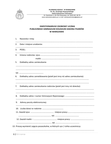 PIJARSKIE SZKOŁY W WARSZAWIE Im. Ks. Onufrego Kopczyńskiego Szkoła Podstawowa i Gimnazjum Ul. Gwintowa 3, 00-704 Warszawa, tel. 0(22) 841 28 76 www.warszawa.pijarzy.pl; e-mail: [email protected] KWESTIONARIUSZ OSOBOWY UCZNIA PUBLICZNEGO GIMNAZJUM KOLEGIUM ZAKONU PIJARÓW W WARSZAWIE 1. Nazwisko i imię: ......................................................................................................................................... 2. Data i miejsce urodzenia: ......................................................................................................................................... 3. PESEL: .......................................................................................................................................... 4. Imiona rodziców: ojca:...................................................................... matki: ................................................................... 5. Dokładny adres zamieszkania ....................................................................................................................................... ....................................................................................................................................... tel. ........................................... 6. Dokładny adres zameldowania (jeżeli jest inny niż adres zamieszkania): ………………………………………………….............................................................................. .................................................................................................................................. 7. Dokładny adres zamieszkania rodziców (jeżeli jest inny niż dziecka): ........................................................................................................................................... ........................................................................................................................................... 8. Dokładny adres i numer Gimnazjum Rejonowego: ……………………………………………….. …………………………………………………………………………………………………………………………………….. 9. Adresy poczty elektronicznej: ........................................................................................................................................... 10. Liczba dzieci w rodzinie: ..................................... 11. Zawód ojca: ......................................... miejsce pracy:…………………………………………. .......................................................... tel. .......................................... 12. Zawód matki: : ......................................... miejsce pracy: ………………………............... ………………………………………………………….. tel. .......................................... 13. Proszę wymienić zajęcia pozaszkolne, w których syn / córka uczestniczy: ........................................................................................................................................... 1|Strona ........................................................................................................................................... ........................................................................................................................................... …………………………………………………………………………………………………………………………………… 14. Proszę wymienić rodzaje zaangażowania syna / córki w życiu religijnym Kościoła (ruchy religijne, grupy modlitewne służba liturgiczna): ........................................................................................................................................... ........................................................................................................................................... ........................................................................................................................................... 15. Jakie motywy przyświecały wyborowi przez Państwa szkoły pijarskiej ? ........................................................................................................................................... ........................................................................................................................................... ........................................................................................................................................... …………………………………………………………………………………………………………………………………… Oświadczam, iż zgodnie z Ustawą z dnia 29 sierpnia 1997 r. o ochronie danych osobowych (Dz. U. Nr 133, poz. 883 z późn. zm.) wyrażam zgodę / nie wyrażam zgody (właściwe podkreślić) na przetwarzanie danych osobowych mojego dziecka do celów związanych z działalnością Publicznego Gimnazjum Kolegium Zakonu Pijarów w Warszawie. Warszawa, dn. ......................................... ........................................................ (podpis jednego z rodziców) DEKLARACJA RODZICÓW Charakter naszej szkoły opiera się na chrześcijańskiej koncepcji człowieka i świata, integralnej formacji osoby w trzech wymiarach: duchowym, intelektualnym i fizycznym, współpracy rodziców, nauczycieli i uczniów, zaangażowania w ciągłą formację i chrześcijański styl życia: a) Czy akceptują Państwo wychowanie opierające się na etyce chrześcijańskiej proponowane przez naszą szkołę? TAK NIE b) Czy zobowiązują się Państwo do współpracy w dziele wychowania religijnego, jakie proponuje nasza szkoła a w szczególności: TAK 2|Strona NIE • do pomocy w organizowaniu i przeprowadzaniu rekolekcji szkolnych dla dzieci? TAK • NIE