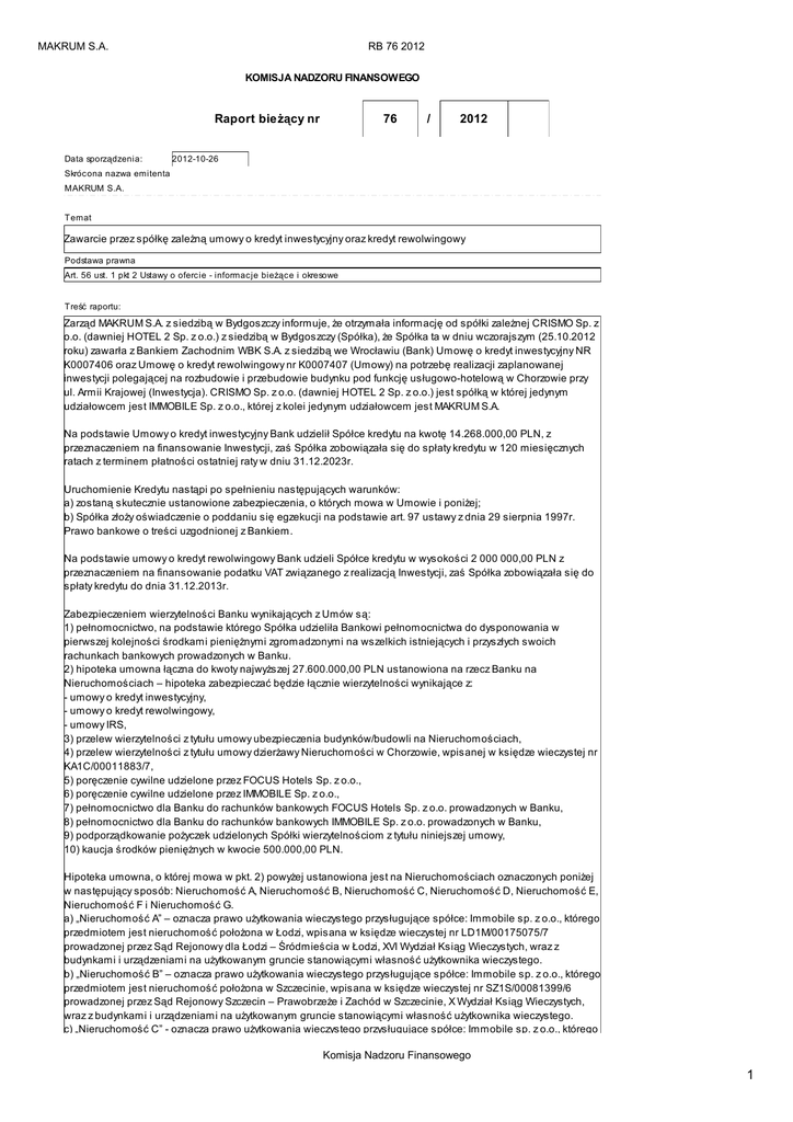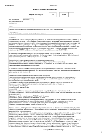 MAKRUM S.A. RB 76 2012 KOMISJA NADZORU FINANSOWEGO Raport bieżący nr Data sporządzenia: 76 / 2012 2012-10-26 Skrócona nazwa emitenta MAKRUM S.A. Temat Zawarcie przez spółkę zależną umowy o kredyt inwestycyjny oraz kredyt rewolwingowy Podstawa prawna Art. 56 ust. 1 pkt 2 Ustawy o ofercie - informacje bieżące i okresowe Treść raportu: Zarząd MAKRUM S.A. z siedzibą w Bydgoszczy informuje, że otrzymała informację od spółki zależnej CRISMO Sp. z o.o. (dawniej HOTEL 2 Sp. z o.o.) z siedzibą w Bydgoszczy (Spółka), że Spółka ta w dniu wczorajszym (25.10.2012 roku) zawarła z Bankiem Zachodnim WBK S.A. z siedzibą we Wrocławiu (Bank) Umowę o kredyt inwestycyjny NR K0007406 oraz Umowę o kredyt rewolwingowy nr K0007407 (Umowy) na potrzebę realizacji zaplanowanej inwestycji polegającej na rozbudowie i przebudowie budynku pod funkcję usługowo-hotelową w Chorzowie przy ul. Armii Krajowej (Inwestycja). CRISMO Sp. z o.o. (dawniej HOTEL 2 Sp. z o.o.) jest spółką w której jedynym udziałowcem jest IMMOBILE Sp. z o.o., której z kolei jedynym udziałowcem jest MAKRUM S.A. Na podstawie Umowy o kredyt inwestycyjny Bank udzielił Spółce kredytu na kwotę 14.268.000,00 PLN, z przeznaczeniem na finansowanie Inwestycji, zaś Spółka zobowiązała się do spłaty kredytu w 120 miesięcznych ratach z terminem płatności ostatniej raty w dniu 31.12.2023r. Uruchomienie Kredytu nastąpi po spełnieniu następujących warunków: a) zostaną skutecznie ustanowione zabezpieczenia, o których mowa w Umowie i poniżej; b) Spółka złoży oświadczenie o poddaniu się egzekucji na podstawie art. 97 ustawy z dnia 29 sierpnia 1997r. Prawo bankowe o treści uzgodnionej z Bankiem. Na podstawie umowy o kredyt rewolwingowy Bank udzieli Spółce kredytu w wysokości 2 000 000,00 PLN z przeznaczeniem na finansowanie podatku VAT związanego z realizacją Inwestycji, zaś Spółka zobowiązała się do spłaty kredytu do dnia 31.12.2013r. Zabezpieczeniem wierzytelności Banku wynikających z Umów są: 1) pełnomocnictwo, na podstawie którego Spółka udzieliła Bankowi pełnomocnictwa do dysponowania w pierwszej kolejności środkami pieniężnymi zgromadzonymi na wszelkich istniejących i przyszłych swoich rachunkach bankowych prowadzonych w Banku. 2) hipoteka umowna łączna do kwoty najwyższej 27.600.000,00 PLN ustanowiona na rzecz Banku na Nieruchomościach – hipoteka zabezpieczać będzie łącznie wierzytelności wynikające z: - umowy o kredyt inwestycyjny, - umowy o kredyt rewolwingowy, - umowy IRS, 3) przelew wierzytelności z tytułu umowy ubezpieczenia budynków/budowli na Nieruchomościach, 4) przelew wierzytelności z tytułu umowy dzierżawy Nieruchomości w Chorzowie, wpisanej w księdze wieczystej nr KA1C/00011883/7, 5) poręczenie cywilne udzielone przez FOCUS Hotels Sp. z o.o., 6) poręczenie cywilne udzielone przez IMMOBILE Sp. z o.o., 7) pełnomocnictwo dla Banku do rachunków bankowych FOCUS Hotels Sp. z o.o. prowadzonych w Banku, 8) pełnomocnictwo dla Banku do rachunków bankowych IMMOBILE Sp. z o.o. prowadzonych w Banku, 9) podporządkowanie pożyczek udzielonych Spółki wierzytelnościom z tytułu niniejszej umowy, 10) kaucja środków pieniężnych w kwocie 500.000,00 PLN. Hipoteka umowna, o której mowa w pkt. 2) powyżej ustanowiona jest na Nieruchomościach oznaczonych poniżej w następujący sposób: Nieruchomość A, Nieruchomość B, Nieruchomość C, Nieruchomość D, Nieruchomość E, Nieruchomość F i Nieruchomość G. a) „Nieruchomość A” – oznacza prawo użytkowania wieczystego przysługujące spółce: Immobile sp. z o.o., którego przedmiotem jest nieruchomość położona w Łodzi, wpisana w księdze wieczystej nr LD1M/00175075/7 prowadzonej przez Sąd Rejonowy dla Łodzi – Śródmieścia w Łodzi, XVI Wydział Ksiąg Wieczystych, wraz z budynkami i urządzeniami na użytkowanym gruncie stanowiącymi własność użytkownika wieczystego. b) „Nieruchomość B” – oznacza prawo użytkowania wieczystego przysługujące spółce: Immobile sp. z o.o., którego przedmiotem jest nieruchomość położona w Szczecinie, wpisana w księdze wieczystej nr SZ1S/00081399/6 prowadzonej przez Sąd Rejonowy Szczecin – Prawobrzeże i Zachód w Szczecinie, X Wydział Ksiąg Wieczystych, wraz z budynkami i urządzeniami na użytkowanym gruncie stanowiącymi własność użytkownika wieczystego. c) „Nieruchomość C” - oznacza prawo użytkowania wieczystego przysługujące spółce: Immobile sp. z o.o., którego Komisja Nadzoru Finansowego 1 MAKRUM S.A. RB 76 2012 c) „Nieruchomość C” - oznacza prawo użytkowania wieczystego przysługujące spółce: Immobile sp. z o.o., którego przedmiotem jest nieruchomość położona w Bydgoszczy, wpisana w księdze wieczystej nr BY1B/00004707/1 prowadzonej przez Sąd Rejonowy w Bydgoszczy, X Wydział Ksiąg Wieczystych, wraz z budynkami i urządzeniami na użytkowanym gruncie stanowiącymi własność użytkownika wieczystego. d) „Nieruchomość D” – oznacza prawo użytkowania wieczystego przysługujące spółce: Immobile sp. z o.o., którego przedmiotem jest nieruchomość położona w Bydgoszczy, wpisana w księdze wieczystej nr BY1B/00064765/3 prowadzonej przez Sąd Rejonowy w Bydgoszczy, X Wydział Ksiąg Wieczystych, wraz z budynkami i urządzeniami na użytkowanym gruncie stanowiącymi własność użytkownika wieczystego. e) „Nieruchomość E” – oznacza prawo użytkowania wieczystego przysługujące spółce: Immobile sp. z o.o., którego przedmiotem jest nieruchomość położona w Bydgoszczy, wpisana w księdze wieczystej nr BY1B/00004072/0 prowadzonej przez Sąd Rejonowy w Bydgoszczy, X Wydział Ksiąg Wieczystych, wraz z budynkami i urządzeniami na użytkowanym gruncie stanowiącymi własność użytkownika wieczystego. f) „Nieruchomość F” – oznacza prawo użytkowania wieczystego przysługujące spółce: Immobile sp. z o.o., którego przedmiotem jest nieruchomość
