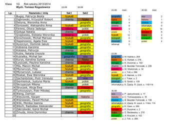 Klasa 1G Rok szkolny 2013/2014 Wych. Tomasz Rogoziewicz 23.09 30.09 23.09 Lp. 1 2 3 4 5 6 7 8 9 10 11 12 13 14 15 16 17 18 19 20 21 22 23 24 25 26 27 28 29 30 31 32 33 Nazwisko i imię Bugaj, Patrycja Beata Dąbrowski, Krzysztof Robert Detyna, Weronika Anna Dynowski, Aleksandra Anna Ferens, Oliwia Jadwiga Gołyga Natalia Grajewska, Elżbieta Weronika Grochowski, Michał Mariusz Hapanowicz, Agata Ewa Hyszczyn, Dominik Jakub Kobienia Karolina Kolaska, Patrycja Kubis, Natalia Urszula Kukielka, Michał Jan Kurys, Karolina Sylwia Łyszczek, Paulina Karolina Miś, Marcin Michał Młynarczyk, Filip Młynarczyk, Łukasz Moskal, Ewa Weronika Sachanbiński, Piotr Ireneusz Siemieniuk, Justyna Maria Skrzypczyk Milena Stryczek, Alicja Ewa Tymczyszyn, Piotr Mikołaj Wang, Damian Wieczorek, Kacper Wiśniewski, Paweł Michał Wilk, Monika Joanna Włoch, Radosław Aleksander Zakrzewski, Karol Michał Żmuda, Anna Dominika fak1 fizykaB chemia fizykaB historia chemia historia fizykaB fizykaB fizykaB biologia chemia biologia geografia chemia chemia fizykaB fizykaB chemia fizykaB polski fizykaB biologia chemia biologia fizykaB fizykaB fizykaB chemia ilość 30.09 ilość fak2 fizyka geografia geografia polski biologia polski geografia biologia geografia geografia geografia geografia wos fizyka biologia geografia geografia biologia geografia wos polski polski biologia geografia historia geografia geografia geografia biologia geografia fizyka biologia chemia historia polski fizykaB biologiaK chemiaS informat 1 0 4 8 2 1 12 0 0 0 wos historia chemia informatyka geografia biologia fizyka biologiaT polski 23.09 geografia p. M. Kaleta s. 204 fizyka p. G. Korbaś, s. 216 biologia p. K. Duczmal, s. 102 chemia p. B. Besztak-Tomiczak, s. 209 historia p. M. Wietrzniok, s. 16 polski p. J. Toll, s. 206 fizykaB p. A. Mamok, s. 214 biologiaK p. J. Tokar, s. 2 chemiaS p. B. Sokół, s. 109 informatykap. K. Żyta/p. R. Lisoń, s. 116/114 30.09 wos p. P. Jędrychowsk, s. 17 historia p. C. Tomaszewska, s. 16 chemia p. B. Besztak-Tomiczak, s. 109 informatykap. K. Zyta/p. R. Lisoń, s. 116/s. 114 geografia p. K. Ozon, s. 204 biologia p. K. Duczmal, s. 2 fizyka p. D. Bacławska, s. 216 biologiaT p. A. Kruczek, s. 102 polski p. J. Toll, s. 206 2 1 0 0 14 6 2 0 4