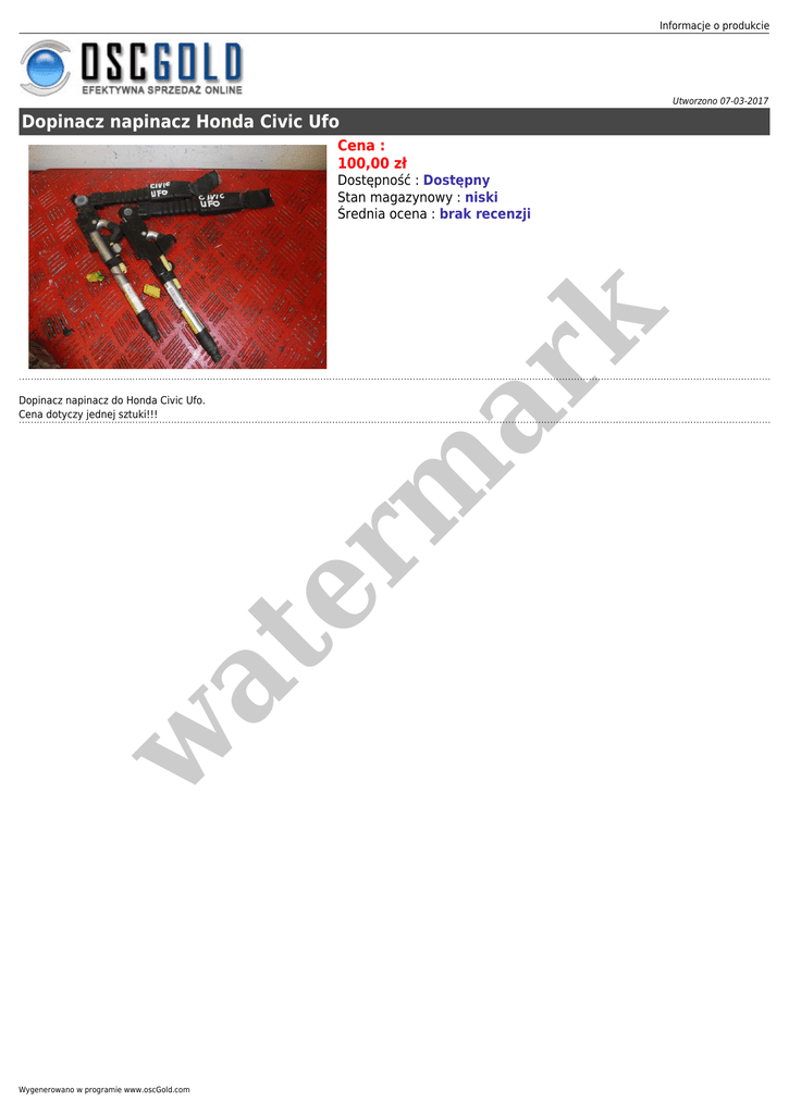 Informacje o produkcie Utworzono 07-03-2017 Dopinacz napinacz Honda Civic Ufo Cena : 100,00 zł w at Dopinacz napinacz do Honda Civic Ufo. Cena dotyczy jednej sztuki!!! er m ar k Dostępność : Dostępny Stan magazynowy : niski Średnia ocena : brak recenzji Wygenerowano w programie www.oscGold.com