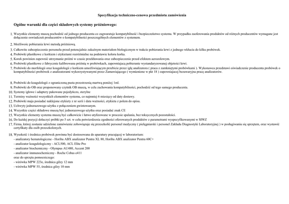 Specyfikacja techniczno-cenowa przedmiotu zamówienia Ogólne warunki dla części składowych systemy próżniowego: 1. Wszystkie elementy muszą pochodzić od jednego producenta co zagwaratuje kompatybilność i bezpieczeństwo systemu. W przypadku zaoferowania produktów od różnych producentów wymagane jest dołączenie oswiadczeń producentów o kompatybilności poszczególnych elementów z systemem. 2. Możliwośc pobierania krwi metodą próżniową. 3. Całkowite zabezpieczenie personelu przed potencjalnie zakaźnym materiałem biologicznym w trakcie pobierania krwi z jednego wkłucia do kilku probówek. 4. Probówki plastikowe z korkiem i etykietami rozróżnialne na podstawie koloru korka. 5. Korek powinien zapewnić utrzymanie próżni w czasie przekłuwania oraz zabezpieczenie przed efektem aerozolowym. 6. Probówki plastikowe z fabrycznie kalibrowana próżnią w probówkach, zapewniajacą pobieranie wystandaryzowanej objetości krwi. 7. Probówki do morfologii oraz koagulologii z korkiem umożliwiającym przebicie przez igłę analizatora ( praca z zamkniętymi probówkami ). Wykonawca przedstawi oświadczenie producenta probówek o kompatybilności probówek z analizatorami wykorzystywanymi przez Zamawiającego ( wymienione w pkt 18 ) zapewniajacej bezawaryjna pracę analizatorów. 8. Probówki do koagulologii z ograniczoną pusta przestrzenią martwą poniżej 1ml. 9. Probówki do OB oraz proponowany czytnik OB muszą, w celu zachowania kompatybilności, pochodzić od tego samego producenta. 10. Systemy igłowe i adaptery pakowane pojedyńczo, sterylne 11. Terminy ważności wszystkich elementów systemu, co najmniej 6 miesięcy od daty dostawy. 12. Probówki maja posiadać naklejone etykiety z nr serii i data ważności, etykieta z polem do opisu. 13. Uchwyty jednorazowego użytku z połączeniem gwintowanym. 14. Wszystkie części składowe muszą być jednorazowego użytku oraz posiadać znak CE 15. Wszystkie elementy systemu muszą być całkowicie i łatwo utylizowane w procesie spalania, bez toksycznych pozostałości. 16. Do każdej pozycji dołaczyć próbki po 5 szt. w celu potwierdzenia zgodności oferowanych produktów z parametrami wyspecyfikowanymi w SIWZ 17. Firma, której zostanie udzielone zamówienie zobowiązuje się przeszkolić personel medyczny ( pielęgniarski i personel Zakładu Diagnostyki Laboratoryjnej ) w posługiwaniu się sprzętem, oraz wystawić certyfikaty dla osób przeszkolonych. 18. Wysokość i średnica probówek powinna być dostosowana do aparatury pracującej w laboratorium: - analizatory hematologiczne - Horiba ABX analizator Pentra XL 80, Horiba ABX analizator Pentra 60C+ - analizator koagulologiczny - ACL500, ACL Elite Pro - analizator biochemiczny - Olympus AU480, Accent 200 - analizator immunochemiczny - Roche Cobas e411 oraz do sprzętu pomocniczego: - wirówka MPW 223e, średnica gilzy 12 mm - wirówka MPW 55, średnica gilzy 10 mm Grupa: 1 L p. 1 System próżniowy Nazwa materiału Igła bezpieczna, do pobierania krwi 0,7 mm a 100 szt. ( wbudowana osłonka zabezpieczająca igłę aktywowana jedna ręką, chroniąca przed przypadkowym zakłuciem) j. m. Szacunkowe potrzeby na 12 miesięcy Cena jednostkowa netto za j. m. % VAT Wartość netto Wartość brutto op. 24 0,00 0,00 op. 265 0,00 0,00 op. 2 0,00 0,00 Igła motylkowa 0,8 mm z zintegrowanym zabezpieczeniem przed zakłuciem a 50 szt. ( z mechanizmem zabezpieczjącym igłę aktywowanym jedna ręką bezpośrednio w żyle ) op. 120 0,00 0,00 5 Probówka do morfologii o objętości 2,0-3,0 ml z K2 EDTA ( objetość pobierania zaznaczona na etykiecie ) szt. 34 500 0,00 0,00 6 Probówka do koagulologii o objętości 2,0-3,0 ml z antykoagulantem cytrynian sodu ( objetość pobierania zaznaczona na etykiecie ) szt. 20 000 0,00 0,00 Probówka do biochemii na pozyskanie surowicy o objętości 4,0-6,0 ml z aktywatorem krzepnięcia ( objetość pobierania zaznaczona na etykiecie ) szt. 45 500 0,00 0,00 Probówka do biochemii na pozyskanie surowicy o objętości 7,0-11,0 ml z aktywatorem krzepnięcia ( objętość pobierania zaznaczona na etykiecie ) szt. 900 0,00 0,00 2 3 4 7 8 Igła bezpieczna, do pobierania krwi 0,8 mm a 100 szt. ( wbudowana osłonka zabezpieczająca igłę aktywowana jedna ręką, chroniąca przed przypadkowym zakłuciem ) Igła motylkowa 0,6 mm z zintegrowanym zabezpieczeniem przed zakłuciem a 50 szt. ( z mechanizmem zabezpieczającym igłę aktywowanym jedna ręką bezpośrednio w żyle ) Producent i nazwa handlowa ( nr katalogowy – jeśli posiada ) Ilość w opakowaniu handlowym/ oferowana ilość opakowań 9 10 11 12 13 Probówka do jonogramów na pozyskanie osocza z antykoagulantem heparyna litowa, o objętości 2,5-4,0 ml ( objętość pobierania zaznaczona na etykiecie ) szt. 5 000 0,00 0,00 Probówka do OB z antykoagulantem cytrynian sodu o objętości i rozmiarach kompatybilnych z oferowanym czytnikiem OB ( objętość pobierania zaznaczona na etykiecie ) szt. 2 000 0,00 0,00 Probówka do oznaczeń glukozy z antykoagulantem fluorek sodu / EDTA o objętości 2,0-3,0 ml ( objętośc pobierania zaznaczona na etykiecie ) szt. 1 300 0,00 0,00 szt. 43 500 0,00 0,00 szt. 11 000 0,00 0,00 miesiąc 12 Uchwyty jednorazowe Adapter typu LUER 14 Usługa dzierżawy aparatury do OB Kryteria oceny ofert: cena 95%, termin dostawy 5% Uwaga: Zamawiający wymaga przekazania w użytkowanie ( wliczone w cenę oferty ) na czas trwania umowy, czytnika do OB o wskazanych poniżej parametrach. Czytnik należy dostarczyć oraz uruchomić i przeszkolić personel w ciągu 7 dni od daty zawarcia umowy. Ogólne wymagania dotyczące parametrów technicznych czytnika do OB: L p. Parametry i warunki graniczne 1. 2. 3. 4. 5. 6. 7. 8. 9. 10. 11. Nazwa własna Model Typ Nowy / używany ( nie starszy niż z roku 2012 ) Rok produkcji Aparat wyposażony w drukarkę wewnętrzną. Aparat automatyczny wyposażony w wewnętrzne mieszadło ,wykonujące czynności przewidziane procedurą oznacze