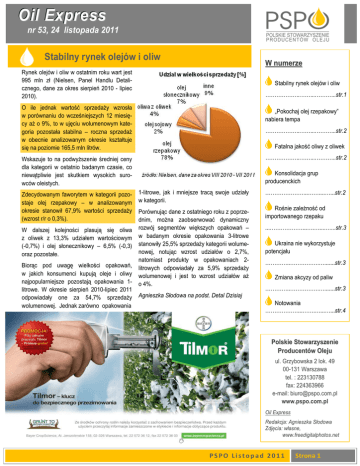 Oil Express nr 53, 24 listopada 2011 Stabilny rynek olejów i oliw W numerze Rynek olejów i oliw w ostatnim roku wart jest 995 mln zł (Nielsen, Panel Handlu Detalicznego, dane za okres sierpień 2010 - lipiec 2010). Stabilny rynek olejów i oliw ………………..……...………..str.1 O ile jednak wartość sprzedaŜy wzrosła w porównaniu do wcześniejszych 12 miesięcy aŜ o 9%, to w ujęciu wolumenowym kategoria pozostała stabilna – roczna sprzedaŜ w obecnie analizowanym okresie kształtuje się na poziomie 165,5 mln litrów. „Pokochaj olej rzepakowy” nabiera tempa ………………..……...………..str.2 Fatalna jakość oliwy z oliwek ………………..……...………..str.2 Wskazuje to na podwyŜszenie średniej ceny dla kategorii w ostatnio badanym czasie, co niewątpliwie jest skutkiem wysokich surowców oleistych. Zdecydowanym faworytem w kategorii pozostaje olej rzepakowy – w analizowanym okresie stanowił 67,9% wartości sprzedaŜy (wzrost r/r o 0,3%). W dalszej kolejności plasują się oliwa z oliwek z 13,3% udziałem wartościowym (-0,7%) i olej słonecznikowy – 6,5% (-0,3) oraz pozostałe. Konsolidacja grup producenckich 1-litrowe, jak i mniejsze tracą swoje udziały w kategorii. Porównując dane z ostatniego roku z poprzednim, moŜna zaobserwować dynamiczny rozwój segmentów większych opakowań – w badanym okresie opakowania 3-litrowe stanowiły 25,5% sprzedaŜy kategorii wolumenowej, notując wzrost udziałów o 2,7%, natomiast produkty w opakowaniach 2litrowych odpowiadały za 5,9% sprzedaŜy wolumenowej i jest to wzrost udziałów aŜ o 4%. Biorąc pod uwagę wielkości opakowań, w jakich konsumenci kupują oleje i oliwy najpopularniejsze pozostają opakowania 1litrowe. W okresie sierpień 2010-lipiec 2011 odpowiadały one za 54,7% sprzedaŜy Agnieszka Słodowa na podst. Detal Dzisiaj wolumenowej. Jednak zarówno opakowania …………………...……....…...str.2 Rośnie zaleŜność od importowanego rzepaku ...………………...….…....…...str.3 Ukraina nie wykorzystuje potencjału …………..…………….….......str.3 Zmiana akcyzy od paliw …………..…………….….......str.3 Notowania ………………...…….…...…...str.4 Polskie Stowarzyszenie Producentów Oleju ul. Grzybowska 2 lok. 49 00-131 Warszawa tel. : 223130788 fax: 224363966 e-mail: [email protected] www.pspo.com.pl Oil Express Redakcja: Agnieszka Słodowa Zdjęcia: własne, www.freedigitalphotos.net PSPO Listopad 2011 Strona 1 Oil Express „Pokochaj olej rzepakowy” nabiera tempa “Pokochaj olej rzepakowy” − kampania edukacyjno-informacyjna mająca na celu podniesienie świadomości walorów zdrowotnych oleju rzepakowego zaczyna nabierać tempa. Na rynku polskim trwa obecnie emisja advertoriali w prasie, został juŜ uruchomiony fanpage na Facebook’u pt. „Miej więcej oleju w głowie”, a dziś wystartowała strona www.pokochajolejrzepakowy.pl oraz odbędzie się uroczysta konferencja inauguracja program. Jednocześnie trwają przygotowania adekwatnych działań na rynku łotewskim. Od piątku rusza emisja advertoriali w tamtejszej prasie, natomiast konferencja zaplanowana jest na 8 grudnia br. Agnieszka Słodowa Fatalna jakość oliwy z oliwek Trzy rolnicze stowarzyszenia we Wło- tać etykietę z zapewnieniem, Ŝe pochodzi szech przeprowadziły badania oliwy ona z pierwszego tłoczenia. Okazuje się z oliwek sprzedawanej w sklepach. bowiem, Ŝe ponad 1/2 oliwy, dostępnej w wielkich sieciach sprzedaŜy powinna Wyniki pokazały, Ŝe 40% oliwy, sprzedazostać zdeklasowana, poniewaŜ napis wanej w supermarketach we Włoszech, "extra virgine" nie odpowiada prawdzie. zawiera pleśń, 16% wyprodukowano z zepsutych oliwek, a 8% jest przestarzała Oliwę trzeba umieć kupować, a przede wszystkim naleŜy unikać zbyt niskich cen, Jak podkreślono w analizie rezultatów, nie gdyŜ nie są one nawet równe wartości wystarczy, szukając dobrej oliwy przeczy- surowców - argumentują stowarzyszenia, wśród których jest związek rolników indywidualnych "Coldiretti". Litr dobrej oliwy pochodzącej naprawdę z pierwszego tłoczenia i wyprodukowanej w 100% z włoskich oliwek nie powinien kosztować mniej niŜ 6 € - radzą eksperci. PSPO na podst.: portal spoŜywczy.pl za PAP Konsolidacja grup producenckich Na Opolszczyźnie rozpoczął się proces konsolidacji grup producentów rzepaku, której inicjatorem jest Mariusz Olejnik, prezes Krajowego Zrzeszenia Producentów Rzepaku. Łączenie się grup producenckich to większa szansa dla rolników na pewny zbyt i większe moŜliwości negocjacyjne. Dzisiaj dla zakładu przetwórczego 3 czy 5 tys. ton rzepaku w zorganizowanej grupie nie robi Ŝadnego wraŜenia. Dlatego chcemy rozpocząć proces, w którym za 3- 5 lat będziemy mieć 50-100 tys. ton Prezes podkreślił, Ŝe organizowanie się rzepaku w jednym ręku – zapowiedział rolników to trudna sprawa. Mariusz Olejnik w rozmowie z PAP. Wiadomo, Ŝe w Polsce gdzie trzech Dodał, Ŝe na Opolszczyźnie jest dziś 36 rolników, tam cztery albo pięć zdań. grup producentów zbóŜ i rzepaku. WaŜny jest lider, który potrafi przekonać Produkują one ponad 33 proc. rzepaku do tego słusznego celu. Rolnicy muszą w województwie. Nie wiadomo na razie, się zorganizować w grupy, a potem (…) ile z nich podejmie decyzję o włączeniu zapraszamy do nas – powiedział. Dodał, się w proces konsolidacji. Wydaje mi się, Ŝe docelowo organizacja producentów Ŝe będzie ich między 6 a 10 jeszcze rzepaku ma być ponadregionalna. w tym roku, co da nam ponad 30 tys. ton PSPO na podst.: PAP rzepaku – ocenił Olejnik. PSPO Listopad 2011 Strona 2 Oil Express Rośnie zaleŜność od importowanego rzepaku W sezonie 2011/12 wzrośnie globalna zaleŜność od eksportu rzepaku z Australii oraz Kanady. W bieŜącym sezonie spadek produkcji spowodował bowiem, Ŝe wzrosło zapotrzebowanie na rzepak zwłaszcza w Unii oraz w Chinach. DuŜ