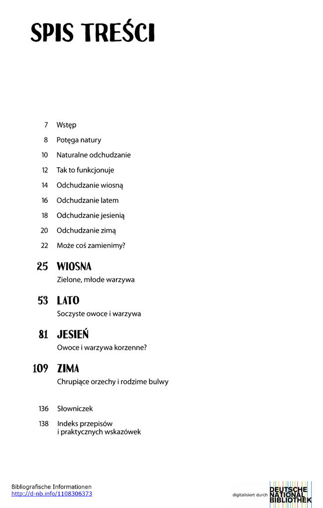 SPIS TREŚCI רWstęp 8 Potęga natury סו Naturalne odchudzanie 12 Tak to funkcjonuje 14 Odchudzanie wiosną 16 Odchudzane latem 18 Odchudzanie jesienią 20 Odchudzanie zimą 22 MoZecoS zamienimy? ñ WIOSNA Zielone, młode warzywa 53 LATO Soczyste owoce i warzywa 81 JESIEŃ Owoce i warzywa korzenne? 109 ΖΙΜΛ Chrupiące orzechy i rodzime bulwy 136 Słowniczek 138 Indeks przepisów i praktycznych wskazówek