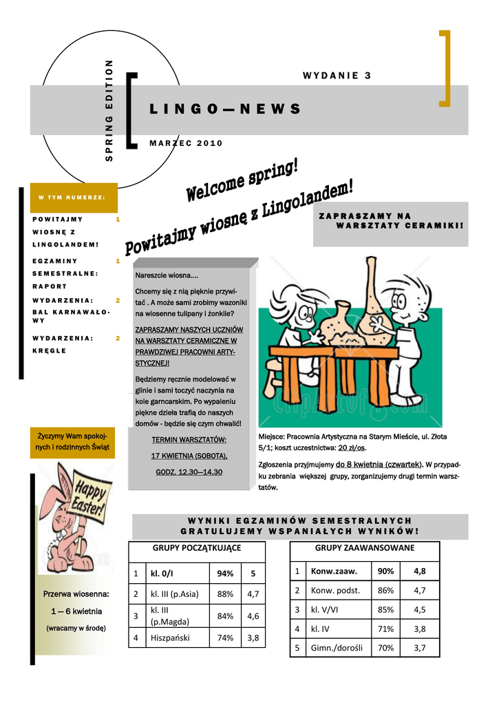 SPRING EDITION WYDANIE 3 L IN G O — N EW S MARZEC 2010 W TYM NUMERZE: POWITAJMY ZAPRASZAMY NA WARSZTATY CERAMIKI! 1 WIOSNĘ Z LINGOLANDEM! EGZAMINY 1 SEMESTRALNE: Nareszcie wiosna…. RAPORT WYDARZENIA: 2 BAL KARNAWAŁOWY WYDARZENIA: KRĘGLE 2 Chcemy się z nią pięknie przywitać . A może sami zrobimy wazoniki na wiosenne tulipany i żonkile? ZAPRASZAMY NASZYCH UCZNIÓW NA WARSZTATY CERAMICZNE W PRAWDZIWEJ PRACOWNI ARTYSTYCZNEJ! Będziemy ręcznie modelować w glinie i sami toczyć naczynia na kole garncarskim. Po wypaleniu piękne dzieła trafią do naszych domów - będzie się czym chwalić! Życzymy Wam spokojnych i rodzinnych Świąt Miejsce: Pracownia Artystyczna na Starym Mieście, ul. Złota 5/1; koszt uczestnictwa: 20 zł/os. TERMIN WARSZTATÓW: 17 KWIETNIA (SOBOTA), Zgłoszenia przyjmujemy do 8 kwietnia (czwartek). W przypad- GODZ. 12.30—14.30 ku zebrania większej grupy, zorganizujemy drugi termin warsztatów. WYNIKI EGZAMINÓW SEMESTRALNYCH GRATULUJEMY WSPANIAŁYCH WYNIKÓW! GRUPY POCZĄTKUJĄCE Przerwa wiosenna: 1 — 6 kwietnia GRUPY ZAAWANSOWANE 1 kl. 0/I 94% 5 1 Konw.zaaw. 90% 4,8 2 kl. III (p.Asia) 88% 4,7 2 Konw. podst. 86% 4,7 3 kl. III (p.Magda) 84% 4,6 3 kl. V/VI 85% 4,5 4 Hiszpaoski 74% 3,8 4 kl. IV 71% 3,8 5 Gimn./dorośli 70% 3,7 (wracamy w środę) LINGO—NEWS Str. 2 PARTY TIME! WSPOMINAMY OSTATKI... W lutym dzieci z Lingolandu kolejny raz świętowały ostatki na balu karnawałowym w siedzibie szkoły. Na początku zaproszeni rodzice mieli okazję podziwiać występy swoich pociech, które dzielnie recytowały i śpiewały po angielsku . Po występach pod kierunkiem pani Igi Malik dzieci nadawały wiadomości w zaczarowanym radiu, chwytały smoka za ogon, bawiły się z rekina- mi :) i tańczyły w takt muzyki z całego świata. W przerwie mogły chwilę odpocząć i posilić się słodkościami. Chcemy gorąco podziękować Rodzicom, którzy poświęcili swój czas i pomagali nam podczas balu. Relację z balu mogą Państwo obejrzeć w naszej galerii na stronie: www.lingoland.pl ZWYCIĘZCY IDĄ NA KRĘGLE! W marcu zwycięzcy konkursu na najlepiej napisany egzamin semestralny odebrali zasłużoną nagrodę - wspólne wyjście na kręgle. Dzieci z klas 0/I oraz dorośli z grupy zaawansowanej próbowali zmierzyć się z tajemniczymi mocami, które kierowały ich kule we wszystkie strony świata, z wyjątkiem celu—czyli kręgli :) Zabawa była wspaniała, obejrzyjcie zdjęcia w galerii! On Easter morn at early dawn Before the cocks were crowing I met a bob-tail bunnykin And asked where he was going. "Tis in the house and out the house a tipsy, tipsy-toeing, Tis round the house and 'bout the house a-lighlty I am going." "But what is that of every hue You carry in your basket?" "Tis eggs of gold and eggs of blue; I wonder that you ask it. "Tis chocolate eggs and bonbon eggs And eggs of red and gray, For every child in every house On bonny Easter day."