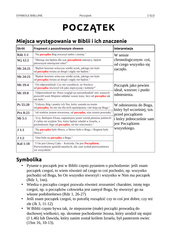 SYMBOLE BIBLIJNE Początek 2 SLO POCZĄTEK Miejsca występowania w Biblii i ich znaczenie Skrót Fragment z poszukiwanym słowem Interpretacja Rdz 1:1 "Na początku Bóg stworzył niebo i ziemię." Wj 12:2 "Miesiąc ten będzie dla was początkiem miesięcy, będzie pierwszym miesiącem roku!" Mt 24:21 "Będzie bowiem wówczas wielki ucisk, jakiego nie było od początku świata aż dotąd i nigdy nie będzie." W sensie chronologicznym: coś, od czego wszystko się zaczęło. Mt 24:21 "Będzie bowiem wówczas wielki ucisk, jakiego nie było od początku świata aż dotąd i nigdy nie będzie." Mt 19:4 "On odpowiedział: Czy nie czytaliście, że Stwórca od początku stworzył ich jako mężczyznę i kobietę?" Mt 19:8 "Odpowiedział im: Przez wzgląd na zatwardziałość serc waszych pozwolił wam Mojżesz oddalać wasze żony; lecz od początku tak nie było." Ps 55:20 "Usłyszy Bóg i poniży ich Ten, który zasiada na tronie od początku, bo nie ma dla nich opamiętania i nie boją się Boga." Prz 8:23 "od wieków jestem stworzona, od początku, nim ziemia powstała." Mi 5:1 "A ty, Betlejem Efrata, najmniejsze jesteś wśród plemion judzkich! Z ciebie mi wyjdzie Ten, który będzie władał w Izraelu, a pochodzenie Jego od początku, od dni wieczności." J 1:1 "Na początku było Słowo, a Słowo było u Boga, i Bogiem było Słowo." J 1:2 "Ono było na początku u Boga." Kol 1:18 "I On jest Głową Ciała - Kościoła. On jest Początkiem, Pierworodnym spośród umarłych, aby sam zyskał pierwszeństwo we wszystkim." Początek jako pewien ideał, wzorzec i punkt odniesienia. W odniesieniu do Boga, który był wcześniej, tzn. przed początkiem i który jednocześnie sam jest Początkiem wszystkiego. Symbolika • Pytanie o początek jest w Biblii często pytaniem o pochodzenie: jeśli znam początek czegoś, to wiem również od czego to coś pochodzi, np. wszystko pochodzi od Boga, bo On wszystko stworzył i wszystko w Nim ma początek (Rdz 1, 1nn). • Wiedza o początku czegoś pozwala również zrozumieć charakter, istotę tego czegoś, np. u początków człowieka jest zamysł Boga, by stworzyć go na własne podobieństwo (Rdz 1, 26-27) • Jeśli znam początek czegoś, to potrafię rozsądzić czy to coś jest dobre, czy też złe (Jk 3, 11-12) • W Biblii często bywa tak, że niepozorne (małe) początki prowadzą do duchowej wielkości, np. skromne pochodzenie Jezusa, który urodził się stajni (J 1,46) lub Dawida, który zanim został królem Izraela, był pasterzem owiec (1Sm 16, 10-13). SYMBOLE BIBLIJNE Drzewo (drzewo życia) 2 SLO DRZEWO (DRZEWO ŻYCIA) Miejsca występowania w Biblii i ich znaczenie Skrót Fragment z poszukiwanym słowem Ps 1:3 Na rozkaz Pana Boga wyrosły z gleby wszelkie drzewa miłe z wyglądu i smaczny owoc rodzące oraz drzewo życia w środku tego ogrodu i drzewo poznania dobra i zła. A przy tym Pan Bóg dał człowiekowi taki rozkaz: «Z wszelkiego drzewa tego ogrodu możesz spożywać według upodobania; ale z drzewa poznania dobra i zła nie wolno ci jeść, bo gdy z niego spożyjesz, niechybnie umrzesz. Pomiędzy rynkiem Miasta a rzeką, po obu brzegach, drzewo życia, rodzące dwanaście owoców - wydające swój owoc każdego miesiąca - a liście drzewa [służą] do leczenia narodów. Przyniosę trochę wody, wy zaś raczcie obmyć sobie nogi, a potem odpocznijcie pod drzewami. W owym dniu - wyrocznia Pana Zastępów - będziecie się wzajemnie zapraszać, [by odpoczywać] w cieniu winorośli i drzew figowych". Dałem wam ziemię, około której nie trudziliście się, i miasta, których wyście nie budowali, a w nich zamieszkaliście. Winnice i drzewa oliwne, których nie sadziliście, dają wam dziś pożywienie. Jest on jak drzewo zasadzone nad płynącą wodą, które wydaje owoc w swoim czasie, a liście jego nie więdną:, co uczyni, pomyślnie wypada. Mt 7:17 "Tak każde dobre drzewo wydaje dobre owoce, a złe drzewo wydaje złe owoce." Łk 6:44 "Po owocu, bowiem poznaje się każde drzewo; nie zrywa się fig z ciernia ani z krzaka jeżyny nie zbiera się winogron." 1P 2:24 On sam, w swoim ciele poniósł nasze grzechy na drzewo, abyśmy przestali być uczestnikami grzechów, a żyli dla sprawiedliwości - Krwią Jego ran zostaliście uzdrowieni. Rdz 2: 9 Rdz 2: 16-17 Ap 22:2 Rdz 18: 4 Za 3:10 Joz 24:13 Interpretacja Drzewo – tu źródło życia, symbol obfitości. Drzewo, jako znak dóbr, jakie otrzymali ludzie od Boga oraz miejsce schronienia, odpoczynku. Drzewo jest tu symbolem człowieka sprawiedliwego, który wydaje dobre owoce. Drzewo z grzechami symbolizuje tu krzyż, na którym został ukrzyżowany Jezus. Symbolika DRZEWO • Drzewo to obraz natury, obfitości, potwierdzenie sił życiowych, obraz opatrzności • Drzewa rosnące w ogrodzie Eden niosły ze sobą błogosławieństwo ( nieśmiertelność ) i przekleństwo ( zjedzenie owocu powodowało śmierć ) drzewa to również obrazy piękna ( Ez 31.3 ) zależności ( Ez 31.4 ) i ochrony ( Ez 31,6 ) pychy ( Ez 31,10 ) i sądu ( 34,12.18) • Bóg także został opisany jako drzewo ( Oz 14,9 ) • Drzewa odgrywają również rolę w eschatologicznych błogosławieństwach, symbolizują odnowiony prządek stworzenia. DRZEWO ŻYCIA • Drzewo życia jest obrazem nieśmiertelności, a jednocześnie nieodwracalnej straty. Pojawia się po raz pierwszy w Księdze Rodzaju, gdzie napisano, że drzewo życia znajdowało się „w środku ogrodu”. Pojawiło się ponownie po wygnaniu pierwszych ludzi z raju (Rdz 3,22-24) • Łączy stworzenie świata z ponownym stworzeniem, swoistym odtworzeniem świata w przyszłości • Jest obrazem wiecznego i nieskończonego życia • W Księdze Apokalipsy drzewo życia jest najwyższym obrazem przyszłej chwały i odzyskanego raju • W Księdze Przysłów jest obrazem błogosławieństwa i spełnienia, miarą tego, co godne pożądania SYMBOLE BIBLIJNE Duch Pański 2 SLO DUCH PAŃSKI Miejsca występowania w Biblii i ich znaczenie