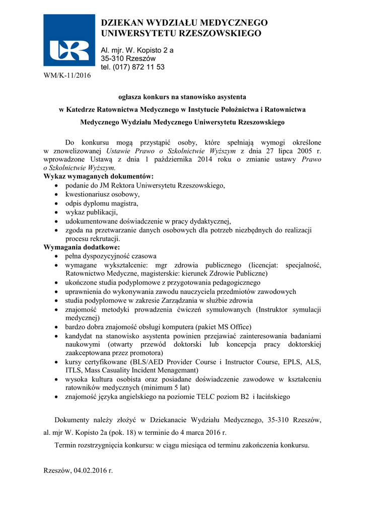 DZIEKAN WYDZIAŁU MEDYCZNEGO UNIWERSYTETU RZESZOWSKIEGO Al. mjr. W. Kopisto 2 a 35-310 Rzeszów tel. (017) 872 11 53 WM/K-11/2016 ogłasza konkurs na stanowisko asystenta w Katedrze Ratownictwa Medycznego w Instytucie Położnictwa i Ratownictwa Medycznego Wydziału Medycznego Uniwersytetu Rzeszowskiego Do konkursu mogą przystąpić osoby, które spełniają wymogi określone w znowelizowanej Ustawie Prawo o Szkolnictwie Wyższym z dnia 27 lipca 2005 r. wprowadzone Ustawą z dnia 1 października 2014 roku o zmianie ustawy Prawo o Szkolnictwie Wyższym. Wykaz wymaganych dokumentów:  podanie do JM Rektora Uniwersytetu Rzeszowskiego,  kwestionariusz osobowy,  odpis dyplomu magistra,  wykaz publikacji,  udokumentowane doświadczenie w pracy dydaktycznej,  zgoda na przetwarzanie danych osobowych dla potrzeb niezbędnych do realizacji procesu rekrutacji. Wymagania dodatkowe:  pełna dyspozycyjność czasowa  wymagane wyksztalcenie: mgr zdrowia publicznego (licencjat: specjalność, Ratownictwo Medyczne, magisterskie: kierunek Zdrowie Publiczne)  ukończone studia podyplomowe z przygotowania pedagogicznego  uprawnienia do wykonywania zawodu nauczyciela przedmiotów zawodowych  studia podyplomowe w zakresie Zarządzania w służbie zdrowia  znajomość metodyki prowadzenia ćwiczeń symulowanych (Instruktor symulacji medycznej)  bardzo dobra znajomość obsługi komputera (pakiet MS Office)  kandydat na stanowisko asystenta powinien przejawiać zainteresowania badaniami naukowymi (otwarty przewód doktorski lub koncepcja pracy doktorskiej zaakceptowana przez promotora)  kursy certyfikowane (BLS/AED Provider Course i Instructor Course, EPLS, ALS, ITLS, Mass Casuality Incident Menagemant)  wysoka kultura osobista oraz posiadane doświadczenie zawodowe w kształceniu ratowników medycznych (minimum 5 lat)  znajomość języka angielskiego na poziomie TELC poziom B2 i łacińskiego Dokumenty należy złożyć w Dziekanacie Wydziału Medycznego, 35-310 Rzeszów, al. mjr W. Kopisto 2a (pok. 18) w terminie do 4 marca 2016 r. Termin rozstrzygnięcia konkursu: w ciągu miesiąca od terminu zakończenia konkursu. Rzeszów, 04.02.2016 r.