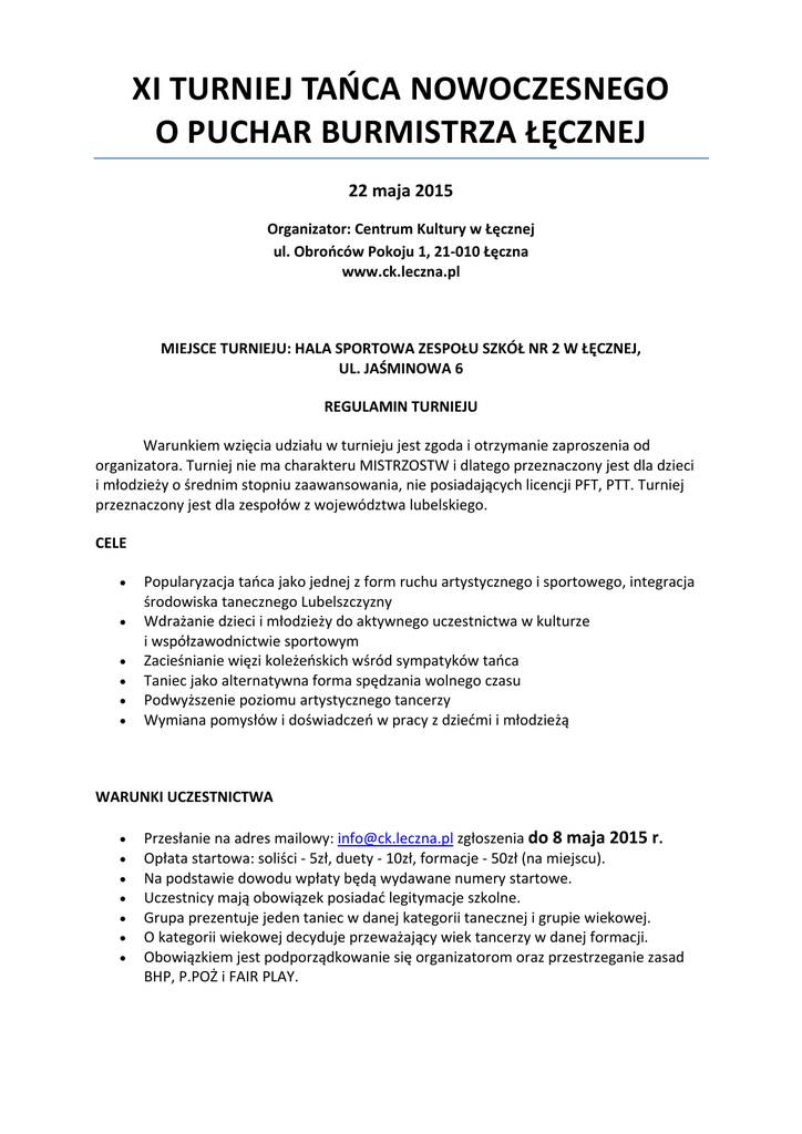 XI TURNIEJ TAŃCA NOWOCZESNEGO O PUCHAR BURMISTRZA ŁĘCZNEJ 22 maja 2015 Organizator: Centrum Kultury w Łęcznej ul. Obrońców Pokoju 1, 21‐010 Łęczna www.ck.leczna.pl MIEJSCE TURNIEJU: HALA SPORTOWA ZESPOŁU SZKÓŁ NR 2 W ŁĘCZNEJ, UL. JAŚMINOWA 6 REGULAMIN TURNIEJU Warunkiem wzięcia udziału w turnieju jest zgoda i otrzymanie zaproszenia od organizatora. Turniej nie ma charakteru MISTRZOSTW i dlatego przeznaczony jest dla dzieci i młodzieży o średnim stopniu zaawansowania, nie posiadających licencji PFT, PTT. Turniej przeznaczony jest dla zespołów z województwa lubelskiego. CELE Popularyzacja tańca jako jednej z form ruchu artystycznego i sportowego, integracja środowiska tanecznego Lubelszczyzny Wdrażanie dzieci i młodzieży do aktywnego uczestnictwa w kulturze i współzawodnictwie sportowym Zacieśnianie więzi koleżeńskich wśród sympatyków tańca Taniec jako alternatywna forma spędzania wolnego czasu Podwyższenie poziomu artystycznego tancerzy Wymiana pomysłów i doświadczeń w pracy z dziećmi i młodzieżą WARUNKI UCZESTNICTWA Przesłanie na adres mailowy: [email protected] zgłoszenia do 8 maja 2015 r. Opłata startowa: soliści ‐ 5zł, duety ‐ 10zł, formacje ‐ 50zł (na miejscu). Na podstawie dowodu wpłaty będą wydawane numery startowe. Uczestnicy mają obowiązek posiadać legitymacje szkolne. Grupa prezentuje jeden taniec w danej kategorii tanecznej i grupie wiekowej. O kategorii wiekowej decyduje przeważający wiek tancerzy w danej formacji. Obowiązkiem jest podporządkowanie się organizatorom oraz przestrzeganie zasad BHP, P.POŻ i FAIR PLAY. ZASADY Każdy zawodnik może brać udział w różnych kategoriach tanecznych z przestrzeganiem poniższych punktów: 1. O przynależności do danej kategorii decyduje rok urodzenia (w duetach wiek starszego partnera) 2. Czas prezentacji w poszczególnych kategoriach wynosi: Solo ‐ 1 min., Duety ‐ 1 min. 15 sek., Formacje ‐ od 2 min. ‐ bez tolerancji czasowej 3. Tempo utworów muzycznych wynosi: Hip‐hop: solo, duety i formacje: od 104 do 120b/m 4. W kategorii hip‐hop, solo, duety obowiązuje zakaz wykonywania figur akrobatycznych (gwiazda, salto, przewroty, itp.). Nie dotyczy formacji. 5. We wszystkich konkurencjach tancerze tańczą do muzyki organizatora (solo, duety) natomiast formacje do muzyki własnej 6. W przypadku małej liczby formacji startujących w turnieju, organizator zastrzega sobie prawo do połączenia kategorii wiekowych i tanecznych w Formacjach. ORGANIZATOR ZAPEWNIA 1. Dyplomy wszystkim uczestnikom oraz trofea pierwszej trójce finałowej w każdej kategorii 2. Scenę o wymiarach 8m x 8m 3. Osobom zainteresowanym rachunki za dokonanie akredytacji 4. Sprzęt nagłaśniający ZASADY SĘDZIOWANIA 1. W przypadku gdy nie ma możliwości zaproszenia sędziów z zewnątrz, w skład komisji sędziowskiej powoływani będą instruktorzy poszczególnych ekip, wybrani przez organizatora 2. Komisja sędziowska oceniać będzie, rytm, technikę tańca, choreografię, wyraz artystyczny oraz atrakcyjność 3. Kat. formacje podzielone zostały na 2 style: * hip hop: możliwość łączenia różnych form w jego obrębie tj. new style, dance hall, cramp, poping, locking i inne.... * freestyle: styl wolny ‐ dowolny, możliwość łączenia różnych stylów: hip hop , disco dance, jazz, show dance z wykorzystaniem rekwizytów w połączeniu z inscenizacją itp. pełna dowolność programu jak nazwa stylu wskazuje * w turnieju wyklucza się udział zespołów ludowych, tańca współczesnego, towarzyskiego oraz baletu KATEGORIE WIEKOWE I TANECZNE *maluchy od 3 do 6 lat włącznie ‐ kat. maluchy hip ‐ hop solo oraz formacje freestyle zostaną rozegrane w pierwszej części turnieju z uwagi na dobro i zdrowie najmłodszych. Dopuszcza się wykorzystanie elementów wyżej wskazanych technik w układach tańca nowoczesnego – w kategorii formacje freestyle. MALUCHY 3‐6 lat HIP‐HOP ‐ solo FREESTYLE Formacje DZIECI DZIECI 7‐9 lat 10‐11 lat HIP‐HOP ‐ solo HIP‐HOP ‐ solo HIP‐HOP ‐ duety HIP‐HOP ‐ duety HIP‐HOP Formacje – 7‐11 lat FREESTYLE Formacje – 7‐11 lat JUNIORZY 12‐14 lat HIP‐HOP ‐ solo HIP‐HOP ‐ duety HIP‐HOP Formacje FREESTYLE Formacje SENIORZY od lat 15 HIP‐HOP ‐ solo HIP‐HOP ‐ duety HIP‐HOP Formacje FREESTYLE Formacje INNE POSTANOWIENIA 1. Uczestniczy przyjeżdżają na koszt własny lub instytucji delegującej 2. Organizator nie ubezpiecza uczestników Turnieju 3. Za rzeczy pozostawione w szatni i miejscach ogólnie dostępnych organizatorzy nie odpowiadają 4. Zgodnie z ustawą o ochronie danych osobowych organizator zastrzega sobie, że: 1) Uczestnictwo w Turnieju jest jednoznaczne z wyrażeniem zgody na przetwarzanie danych osobowych. 2) Dane osobowe dotyczące Turnieju będą przetwarzane wyłącznie na potrzeby imprezy (przeprowadzenie konkursu, wyłonienie zwycięzców, przyznanie i odbiór nagród, podanie do publicznej wiadomości listy uczestników i laureatów, promocja ‐ umieszczenie danych osobowych, w tym wizerunku, na stronach www i w lokalnej prasie. 3) Odmowa ich podania jest równoznaczna z brakiem możliwości uczestnictwa w turnieju. PRZEWIDYWANY PROGRAM TURNIEJU : (dokładny program będzie znany ok. 15 maja 2015.) 8.00‐9.30 – Rejestracja 8.00‐10.30 – Próby parkietu 9.30‐9.45 – Odprawa sędziów i trenerów 10.30 – Rozpoczęcie turnieju, eliminacje i finały Ok. 14.00 – Przerwa Ok. 15.00 – Formacje Ok. 17.00 – Zakończenie turnieju, wręczenie nagród i dyplomów GODZINY TURNIEJU MOGĄ ULEC ZMIANIE W ZALEŻNOŚCI OD LICZBY ZGŁOSZEŃ. ZESPOŁY NIE TAŃCZĄCE W KAT. SOLO I DUETY MOGĄ PRZYBYĆ NA TURNIEJ OK. godz. 13.30, PO WCZEŚNIEJSZYM UISZCZENIU OPŁATY STARTOWEJ np. przelewem na konto Centrum Kultury w Łęcznej ul. Obrońców Pokoju 1, 81 1020 3206 0000 8802 0084 1064, tel. 81‐752‐15‐47 Zapraszamy serdecznie, szczegółowych informacji udziela: Aleksandra Mura