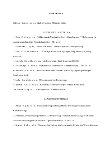 SPIS TREŚCI Edward K r a s i ń s k i, Kult i wiedza o Modrzejewskiej I. ROZPRAWY I ARTYKUŁY 1. Beth H o l m g r e n, Od Bootha do Modrzejewskiej. „Wyrafinowany” Shakespeare na scenie amerykańskiej. Przekład Jarosław M i k o s 2. Kazimierz G a j d a, Feliks Koneczny – aktorski portret Modrzejewskiej 3. Emil O r z e c h o w s k i, W dobrych zawodach wystąpiła, bieg ukończyła, wiary ustrzegła 4. Mariola S z y d ł o w s k a, Modrzejewska i Teatr Lwowski 1862/63 5. Maria Olga B i e ń k a, Warszawskie siedmiolecie Modrzejewskiej (1869–1876) 6. Barbara M a r e s z, „Drukowane oklaski”? Polska prasa o występach gościnnych Modrzejewskiej 7. Lidia K u c h t ó w n a, O kostiumach Modrzejewskiej 8. Bianka K u r y l c z y k, Kostiumy Modrzejewskiej w świetle mody epoki 10. Janusz D e g l e r, Modrzejewska i Witkiewiczowie II. Z KORESPONDENCJI 1. Alicja K ę d z i o r a, Nieznana korespondencja Heleny Modrzejewskiej i Karola Chłapowskiego 2. Nieznana korespondencja Heleny Modrzejewskiej i Karola Chłapowskiego w zbiorach Muzeum Teatralnego w Warszawie. Opracował Patryk K e n c k i 3. Roman T a b o r s k i, Nieznany list Heleny Modrzejewskiej do Macieja Wierzbińskiego III. ZBIORY I KOLEKCJE TEATRALNE MODRZEJEWSKIEJ 1. Alicja K ę d z i o r a, Kolekcje Modrzejewskiej w Ameryce 2. Helena M o d r z e j e w s k a, Sukces na scenie. Opracowała Alicja K ę d z i o r a 3. Monika C h u d z i k o w s k a, Patryk K e n c k i, „Na dwóch półkulach świata Wielbionej Artystce.” Kolekcja pamiątek i dokumentów po Modrzejewskiej w zbiorach Muzeum Teatralnego w Warszawie 4. Anna L i t a k, Fotografie Modrzejewskiej 5. Anna J ę d r z e j c z y k, Modrzejewska w Instytucie Sztuki PAN 6. Pracownia Dokumentacji Życia i Twórczości Heleny Modrzejewskiej