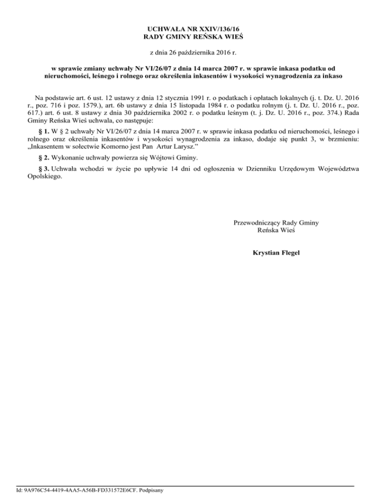 UCHWAŁA NR XXIV/136/16 RADY GMINY REŃSKA WIEŚ z dnia 26 października 2016 r. w sprawie zmiany uchwały Nr VI/26/07 z dnia 14 marca 2007 r. w sprawie inkasa podatku od nieruchomości, leśnego i rolnego oraz określenia inkasentów i wysokości wynagrodzenia za inkaso Na podstawie art. 6 ust. 12 ustawy z dnia 12 stycznia 1991 r. o podatkach i opłatach lokalnych (j. t. Dz. U. 2016 r., poz. 716 i poz. 1579.), art. 6b ustawy z dnia 15 listopada 1984 r. o podatku rolnym (j. t. Dz. U. 2016 r., poz. 617.) art. 6 ust. 8 ustawy z dnia 30 października 2002 r. o podatku leśnym (t. j. Dz. U. 2016 r., poz. 374.) Rada Gminy Reńska Wieś uchwala, co następuje: § 1. W § 2 uchwały Nr VI/26/07 z dnia 14 marca 2007 r. w sprawie inkasa podatku od nieruchomości, leśnego i rolnego oraz określenia inkasentów i wysokości wynagrodzenia za inkaso, dodaje się punkt 3, w brzmieniu: „Inkasentem w sołectwie Komorno jest Pan Artur Larysz.” § 2. Wykonanie uchwały powierza się Wójtowi Gminy. § 3. Uchwała wchodzi w życie po upływie 14 dni od ogłoszenia w Dzienniku Urzędowym Województwa Opolskiego. Przewodniczący Rady Gminy Reńska Wieś Krystian Flegel Id: 9A976C54-4419-4AA5-A56B-FD331572E6CF. Podpisany
