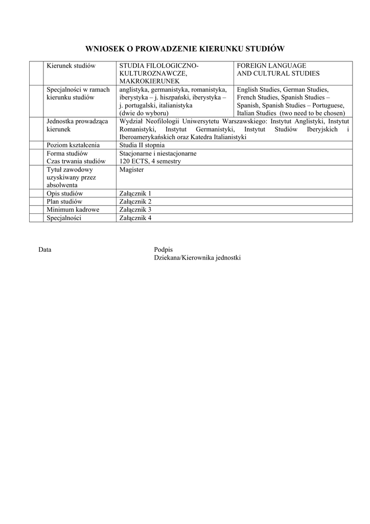 WNIOSEK O PROWADZENIE KIERUNKU STUDIÓW Kierunek studiów Specjalności w ramach kierunku studiów Jednostka prowadząca kierunek Poziom kształcenia Forma studiów Czas trwania studiów Tytuł zawodowy uzyskiwany przez absolwenta Opis studiów Plan studiów Minimum kadrowe Specjalności Data STUDIA FILOLOGICZNOFOREIGN LANGUAGE KULTUROZNAWCZE, AND CULTURAL STUDIES MAKROKIERUNEK anglistyka, germanistyka, romanistyka, English Studies, German Studies, iberystyka – j. hiszpański, iberystyka – French Studies, Spanish Studies – j. portugalski, italianistyka Spanish, Spanish Studies – Portuguese, (dwie do wyboru) Italian Studies (two need to be chosen) Wydział Neofilologii Uniwersytetu Warszawskiego: Instytut Anglistyki, Instytut Romanistyki, Instytut Germanistyki, Instytut Studiów Iberyjskich i Iberoamerykańskich oraz Katedra Italianistyki Studia II stopnia Stacjonarne i niestacjonarne 120 ECTS, 4 semestry Magister Załącznik 1 Załącznik 2 Załącznik 3 Załącznik 4 Podpis Dziekana/Kierownika jednostki Załącznik 2 program kształcenia Studia przeznaczone są dla osób z tytułem licencjata lub magistra dowolnego kierunku. Studia trwają 4 semestry. Aby ukończyć studia, student musi uzyskać minimum 120 ECTS. Ideą przewodnią jest maksymalne zindywidualizowanie kształcenia. Student wybiera seminarium magisterskie najbardziej odpowiadające jego predyspozycjom, zainteresowaniom, dalszym planom edukacyjnym i/lub zawodowym. Wybór seminarium determinuje wybór realizowanych modułów, w tym poszczególnych kursów i zajęć specjalizacyjnych. Elastyczne wymagania programowe promują konstrukcję indywidualnego, własnego programu studiów budowanego przez studenta, w konsultacji z opiekunem naukowym, wokół seminarium magisterskiego. Program kształcenia stwarza nie tylko doskonałe warunki do pogłębionych studiów w zakresie językoznawstwa, kultury i literatury amerykańskiej, czy kultury i literatury brytyjskiej, ale przede wszystkim inspiruje studia interdyscyplinarne. Program realizowany w Instytucie Anglistyki, zgodnie z ideami Procesu Bolońskiego i w trosce o harmonijne kształcenie oraz wypracowywanie pożądanych umiejętności i kompetencji zawiera również treści spoza profilu seminarium i zajęcia kształtujące umiejętności ogólne. Pozostałe jednostki współtworzące makrokierunek to Instytut Romanistyki, Instytut Germanistyki, Instytut Studiów Iberyjskich i Iberoamerykańskich oraz Katedra Italianistyki. Program studiów nie przygotowuje do wykonywania konkretnego zawodu, a absolwenci znajdują zatrudnienie w rozmaitych dziedzinach życia gospodarczego i publicznego. Program kształci fundamentalne kompetencje pożądane rynku pracy, takie jak samokształcenie, pracę zespołową, promuje dokonywanie samodzielnych wyborów, daje możliwość kształcenia interdyscyplinarnego, wzmacnia postawy odpowiedzialności i decyzyjności. Stosowane są metody heurystyczne, ukierunkowane na pracę własną studenta; nacisk kładzie się na wykształcenie u studentów umiejętności rozumowania, samodzielnego dostrzegania i rozwiązywania problemów. Absolwent zna wybrane przez siebie języki na poziomie C2 (wg ESOKJ), zbliżonym do wykształconego rodowitego użytkownika języka, co umożliwia mu efektywne funkcjonowanie w dowolnych dziedzinach działalności zawodowej i akademickiej; posiada pogłębioną wiedzę w zakresie językoznawstwa, kulturoznawstwa i literaturoznawstwa, literatury, kultury, sztuki i realiów krajów obszaru anglojęzycznego, oraz ogólną wiedzę w obszarze nauk humanistycznych; jest bardzo dobrze przygotowany zarówno do dalszego kształcenia o profilu akademickim, jaki i praktycznym; jest też przygotowany do podjęcia pracy wymagającej wysokich umiejętności. Absolwent jest świadomy znaczenia swojej wiedzy, własnych umiejętności, potrafi zaprojektować ścieżkę osobistego rozwoju. Po uzyskaniu uprawnień nauczycielskich, absolwent ma wiedzę, umiejętności i kompetencje konieczne i uprawniające do nauczania języka angielskiego na wszystkich poziomach. Student wybiera seminarium w obrębie specjalizacji A i realizuje program specjalizacji A i B. Kursy i zajęcia specjalizacyjne są fakultatywnymi zajęciami autorskimi tworzonymi przez specjalizujących się w danej dziedzinie pracowników, co gwarantuje bardzo wysoki poziom merytoryczny zajęć. System zajęć fakultatywnych możliwy jest dzięki bardzo dobrej strukturze kadry: znakomita większość nauczycieli akademickich jest zatrudniona na stanowiskach naukowo-dydaktycznych; liczba samodzielnych pracowników stanowi ponad 30% nauczycieli akademickich; pracownikami Instytutu Anglistyki są uznani specjaliści, których zainteresowania i kompetencje reprezentowanych przez nich dziedzinach. obejmują wszystkie kierunki badań w Stopień zindywidualizowania kształcenia jest zatem niezwykle wysoki i trudny do osiągnięcia przez jednostki, które nie wypracowały systemu kursowego i nie dysponują kadrą o odpowiednio wysokich kompetencjach. Pozostałe jednostki współtworzą ofertę makrokierunku na bazie swoich programów studiów. Program jest realizowany w oparciu o zasoby kadrowe poszczególnych jednostek. Plan studiów makrokierunku 2011-2012, II stopień I ROK NAZWA PRZEDMIOTU Filozofia kultury Seminarium magisterskie Przygotowanie pracy magisterskiej Zajęcia specjalizacyjne specjalizacji A Zajęcia specjalizacyjne specjalizacji B Kursy w ramach specjalizacji A I SEMESTR LICZBA ZAJĘĆ FORMA ćwiczenia wykłady ZALICZENIA 30 30 zal. PUNKTY 6 II SEMESTR LICZBA ZAJĘĆ FORMA ćwiczenia wykłady ZALICZENIA 30 EGZAMIN 30 zal. 2 60 literatura i język 60 literatura i język Zal. 4 6 W SKALI ROKU 4 12 2 4 PUNKTY 8 60 kultura Zal. 8 16 8 30 kultura Zal. 4 12 - 30 Zal. 4 4 Zal. 30 Zal. 2 30 Zal. 2 4 30 Zal. 2 30 Zal. 2 4 32 60 PNJ specjalizacji A PNJ specjalizacji B Wychowanie fizyczne RAZEM 30 240 30 30 28 240 30 II ROK NAZWA PRZEDMIOTU Seminarium magisterskie Przygotowa