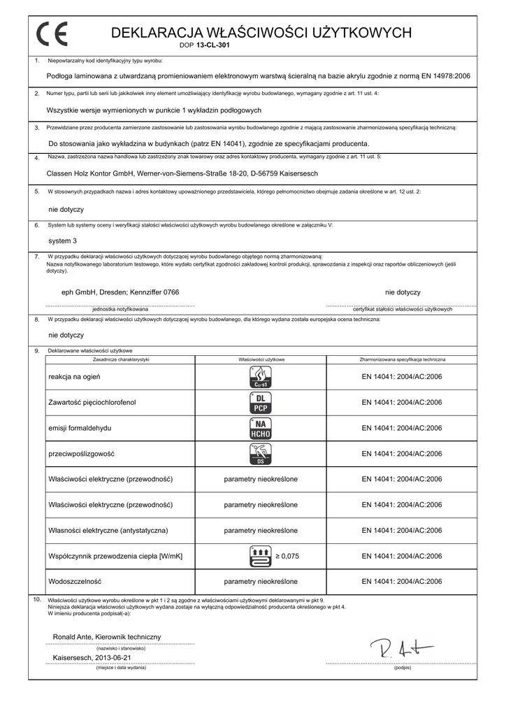 DEKLARACJA WŁAŚCIWOŚCI UŻYTKOWYCH DOP 13-CL-301 1. Niepowtarzalny kod identyfikacyjny typu wyrobu: Podłoga laminowana z utwardzaną promieniowaniem elektronowym warstwą ścieralną na bazie akrylu zgodnie z normą EN 14978:2006 2. Numer typu, partii lub serii lub jakikolwiek inny element umożliwiający identyfikację wyrobu budowlanego, wymagany zgodnie z art. 11 ust. 4: Wszystkie wersje wymienionych w punkcie 1 wykładzin podłogowych 3. Przewidziane przez producenta zamierzone zastosowanie lub zastosowania wyrobu budowlanego zgodnie z mającą zastosowanie zharmonizowaną specyfikacją techniczną: Do stosowania jako wykładzina w budynkach (patrz EN 14041), zgodnie ze specyfikacjami producenta. 4. Nazwa, zastrzeżona nazwa handlowa lub zastrzeżony znak towarowy oraz adres kontaktowy producenta, wymagany zgodnie z art. 11 ust. 5: Classen Holz Kontor GmbH, Werner-von-Siemens-Straße 18-20, D-56759 Kaisersesch 5. W stosownych przypadkach nazwa i adres kontaktowy upoważnionego przedstawiciela, którego pełnomocnictwo obejmuje zadania określone w art. 12 ust. 2: nie dotyczy 6. System lub systemy oceny i weryfikacji stałości właściwości użytkowych wyrobu budowlanego określone w załączniku V: system 3 7. 8. W przypadku deklaracji właściwości użytkowych dotyczącej wyrobu budowlanego objętego normą zharmonizowaną: Nazwa notyfikowanego laboratorium testowego, które wydało certyfikat zgodności zakładowej kontroli produkcji, sprawozdania z inspekcji oraz raportów obliczeniowych (jeśli dotyczy). eph GmbH, Dresden; Kennziffer 0766 nie dotyczy jednostka notyfikowana certyfikat stałości właściwości użytkowych W przypadku deklaracji właściwości użytkowych dotyczącej wyrobu budowlanego, dla którego wydana została europejska ocena techniczna: nie dotyczy 9. Deklarowane właściwości użytkowe Zasadnicze charakterystyki Zharmonizowana specyfikacja techniczna reakcja na ogień EN 14041: 2004/AC:2006 Zawartość pięciochlorofenol EN 14041: 2004/AC:2006 emisji formaldehydu EN 14041: 2004/AC:2006 przeciwpoślizgowość EN 14041: 2004/AC:2006 Właściwości elektryczne (przewodność) parametry nieokreślone EN 14041: 2004/AC:2006 Właściwości elektryczne (przewodność) parametry nieokreślone EN 14041: 2004/AC:2006 Własności elektryczne (antystatyczna) parametry nieokreślone EN 14041: 2004/AC:2006 ≥ 0,075 EN 14041: 2004/AC:2006 parametry nieokreślone EN 14041: 2004/AC:2006 Współczynnik przewodzenia ciepła [W/mK] Wodoszczelność 10. Właściwości użytkowe Właściwości użytkowe wyrobu określone w pkt 1 i 2 są zgodne z właściwościami użytkowymi deklarowanymi w pkt 9. Niniejsza deklaracja właściwości użytkowych wydana zostaje na wyłączną odpowiedzialność producenta określonego w pkt 4. W imieniu producenta podpisał(-a): Ronald Ante, Kierownik techniczny (nazwisko i stanowisko) Kaisersesch, 2013-06-21 (miejsce i data wydania) (podpis)