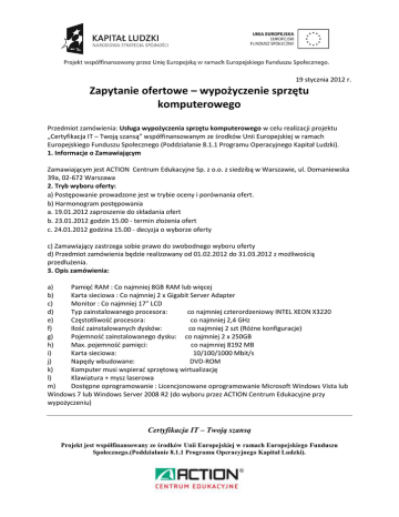 19 stycznia 2012 r. Zapytanie ofertowe – wypożyczenie sprzętu komputerowego Przedmiot zamówienia: Usługa wypożyczenia sprzętu komputerowego w celu realizacji projektu „Certyfikacja IT – Twoją szansą” współfinansowanym ze środków Unii Europejskiej w ramach Europejskiego Funduszu Społecznego (Poddziałanie 8.1.1 Programu Operacyjnego Kapitał Ludzki). 1. Informacje o Zamawiającym Zamawiającym jest ACTION Centrum Edukacyjne Sp. z o.o. z siedzibą w Warszawie, ul. Domaniewska 39a, 02-672 Warszawa 2. Tryb wyboru oferty: a) Postępowanie prowadzone jest w trybie oceny i porównania ofert. b) Harmonogram postępowania a. 19.01.2012 zaproszenie do składania ofert b. 23.01.2012 godzin 15.00 - termin złożenia ofert c. 24.01.2012 godzina 15.00 - decyzja o wyborze oferty c) Zamawiający zastrzega sobie prawo do swobodnego wyboru oferty d) Przedmiot zamówienia będzie realizowany od 01.02.2012 do 31.03.2012 z możliwością przedłużenia. 3. Opis zamówienia: a) Pamięć RAM : Co najmniej 8GB RAM lub więcej b) Karta sieciowa : Co najmniej 2 x Gigabit Server Adapter c) Monitor : Co najmniej 17” LCD d) Typ zainstalowanego procesora: co najmniej czterordzeniowy INTEL XEON X3220 e) Częstotliwość procesora: co najmniej 2,4 GHz f) Ilość zainstalowanych dysków: co najmniej 2 szt (Różne konfiguracje) g) Pojemność zainstalowanego dysku: co najmniej 2 x 250GB h) Max. pojemność pamięci: co najmniej 8192 MB i) Karta sieciowa: 10/100/1000 Mbit/s j) Napędy wbudowane: DVD-ROM k) Komputer musi wspierać sprzętową wirtualizację l) Klawiatura + mysz laserowa m) Dostępne oprogramowanie : Licencjonowane oprogramowanie Microsoft Windows Vista lub Windows 7 lub Windows Server 2008 R2 (do wyboru przez ACTION Centrum Edukacyjne przy wypożyczeniu) Certyfikacja IT – Twoją szansą Projekt jest współfinansowany ze środków Unii Europejskiej w ramach Europejskiego Funduszu Społecznego.(Poddziałanie 8.1.1 Programu Operacyjnego Kapitał Ludzki). Dodatkowo w ramach ceny na każdym z komputerów instalowane będzie oprogramowanie zgodne z zakresem tematycznym następujących ścieżek certyfikowanych Microsoft: 1) Microsoft Certified Technology Specialist(dalej MCTS)SQL Server 2008. Database Development 2)MCTS SQL Server 2008 Business Intelligence Development and Maintenance 3)MCTS Windows Server 2008 Applications Infrastructure–Configuration 4)MCTS Enterprise Project Managment with Microsoft Office Project Server 2007 5)MCTS Net Framework 3.5 windows Presentation Foundation 6) MCITP enterprise Messaging Administrator 7)MCITP Windows Server 2008 Server Administrator 8)MCITP Windows 7 Desktop Administrator Informacje dodatkowe: • Koszty ewentualnego uszkodzenia ponosi podmiot Wynajmujący a nie Zamawiający. • W przypadku uszkodzenia sprzętu podczas okresu wypożyczenia nowy sprzęt zostanie dostarczony w przeciągu max. 4 godzin. • Sprzęt dostarczony i odebrany musi być na wskazane miejsce na koszt Wynajmującego w terminie wskazanym przez Zamawiającego (min. 2 godziny przed rozpoczęciem szkolenia, max. 2 godziny po zakończeniu szkolenia). 4. Wymagania dotyczące oferty: a) Koszty związane z przygotowaniem oferty, ponosi Wykonawca b) Oferta będzie zawierała a. wykaz potencjału Wykonawcy wraz z oświadczeniami zgodnie z pkt. 5 b. wskazanie osoby kontaktowej po stronie Wykonawcy c. cenę brutto za 1 dobę wypożyczenia sprzętu komputerowego, w tym zawierać się będzie koszt dostarczenia i odbioru sprzętu do jednej z lokalizacji wskazanej w pkt. 6 b: - w tygodniu (od poniedziałku do piątku w godzinach 17.00-21.00) - w weekendy (soboty i niedziele) w 2 opcjach (obie wymagane) 5. Wymagania dotyczące Wykonawcy: a) Wykonawca oświadcza, iż dysponować będzie do realizacji usługi min. 22 kompletnymi stacjami komputerowymi zgodnymi ze specyfikacją wymieniona w pkt 3 a-h. b) Wykonawca oświadcza, iż zrealizował w ciągu ostatnich 6 miesięcy przed terminem złożenia oferty min. 2 usługi (z których każda była realizowana na podstawie oddzielnej umowy), których przedmiotem było wypożyczenie sprzętu komputerowego o parametrach zbliżonych do wymaganych przez Zamawiającego w pkt 3, każdej z nich o wartości nie mniejszej niż 40 000 zł brutto. Zamawiający ma prawo poprosić Wykonawcę o przedstawienie referencji potwierdzających należyte wykonanie usługi o której mowa w pkt. 5 b 6. Termin i miejsce wykonania zamówienia: a) Termin: od 01.02.2012 do 31.03.2012 z możliwością przedłużenia Certyfikacja IT – Twoją szansą Projekt jest współfinansowany ze środków Unii Europejskiej w ramach Europejskiego Funduszu Społecznego.(Poddziałanie 8.1.1 Programu Operacyjnego Kapitał Ludzki). b) Miejsce: Bydgoszcz, Toruń. 7. Warunki unieważnienia postępowania: ACTION Centrum Edukacyjne Sp. z o.o. zastrzega sobie prawo do unieważnienia postępowania w każdym czasie bez podania przyczyny. 8. Sposób komunikacji: a) Wykonawcy mają możliwość zadawania pytań do 20.01.2012 włącznie, elektronicznie na adres: [email protected] Udzielona odpowiedź będzie wysyłana do wszystkich wykonawców, do których zostały skierowane zapytania b) Osobą kontaktową ze strony ACTION Centrum Edukacyjne Sp. z o.o. jest Marcin Dworzański , mail: [email protected] 9. Sposób i termin złożenia oferty: Oferty należy przesłać do dnia 23.01.2012 do godziny 15.00 w formie pisemnej (oryginał lub podpisany skan) osobiście lub pocztą na adres [email protected] (decyduje data otrzymania oferty) na adres: ACTION Centrum Edukacyjne Sp. z o.o. ul. Domaniewska 39a, 02-672 Warszawa z dopiskiem na kopercie: Oferta na usługę wypożyczenia sprzętu komputerowego w ramach projektu „Certyfikacja IT – Twoją szansą”. 10. Wymagania dodatkowe dotyczące oferty: Zamawiający dodatkowo oczekuje pisemnego zapewnienia dotyczącego: a) Należytej staranności i terminowości przy realizacji przedmiotu zamówienia b) Gotowości do zmiany terminów w przypadku zaistn
