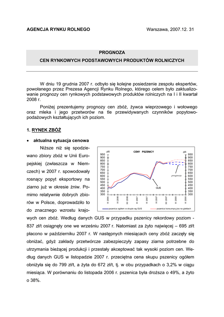 AGENCJA RYNKU ROLNEGO Warszawa, 2007.12. 31 PROGNOZA CEN RYNKOWYCH PODSTAWOWYCH PRODUKTÓW ROLNICZYCH W dniu 19 grudnia 2007 r. odbyło się kolejne posiedzenie zespołu ekspertów, powołanego przez Prezesa Agencji Rynku Rolnego, którego celem było zaktualizowanie prognozy cen rynkowych podstawowych produktów rolniczych na I i II kwartał 2008 r. Poniżej prezentujemy prognozy cen zbóż, żywca wieprzowego i wołowego oraz mleka i jego przetworów na tle przewidywanych czynników popytowopodażowych kształtujących ich poziom. 1. RYNEK ZBÓŻ aktualna sytuacja cenowa do znacznego wzrostu krajo- pszenica ogółem w skupie wg GUS 950 900 850 800 750 700 650 600 550 500 450 400 350 300 VI 2008 rów w Polsce, doprowadziło to GUS III 2008 mimo relatywnie dobrych zbio- prognoza XII 2007 ziarno już w okresie żniw. Po- zł/t IX 2007 rosnący popyt eksportowy na CENY PSZENICY VI 2007 czech) w 2007 r. spowodowały zł/t III 2007 pejskiej (zwłaszcza w Niem- 950 900 850 800 750 700 650 600 550 500 450 400 350 300 XII 2006 wano zbiory zbóż w Unii Euro- IX 2006 Niższe niż się spodzie- VI 2006 • pszenica konsumpcy jna na giełdach wych cen zbóż. Według danych GUS w przypadku pszenicy rekordowy poziom 837 zł/t osiągnęły one we wrześniu 2007 r. Natomiast za żyto najwięcej – 695 zł/t płacono w październiku 2007 r. W następnych miesiącach ceny zbóż zaczęły się obniżać, gdyż zakłady przetwórcze zabezpieczyły zapasy ziarna potrzebne do utrzymania bieżącej produkcji i przestały akceptować tak wysoki poziom cen. Według danych GUS w listopadzie 2007 r. przeciętna cena skupu pszenicy ogółem obniżyła się do 799 zł/t, a żyta do 672 zł/t, tj. w obu przypadkach o 3,2% w ciągu miesiąca. W porównaniu do listopada 2006 r. pszenica była droższa o 49%, a żyto o 38%. Według danych Ministerstwa Rolnictwa i Rozwoju Wsi w I połowie grudnia 2007 r. ceny pszenicy i żyta ulegały wahaniom. W dniach 10-16.12.2007 r. cena skupu pszenicy konsumpcyjnej wynosiła 760 zł/t i była o 6% niższa niż miesiąc wcześniej. Za żyto konsumpcyjne w tym okresie płacono 697 zł/t, tj. o 1% mniej niż przed miesiącem. VI 2008 III 2008 niewielkie ilości pszenicy kon- XII 2007 dzie ROL-PETROL sprzedano IX 2007 tygodniu grudnia 2007 r. na gieł- prognoza VI 2007 cję wzrostową. W przedostatnim XII 2006 daży wykazywały lekką tenden- 780 730 680 630 580 530 480 430 380 330 280 230 GUS IX 2006 wielki, a ceny w ofertach sprze- zł/t CENY SKUPU ŻYTA VI 2006 wym rynku zbóż popyt był nie- zł/t 780 730 680 630 580 530 480 430 380 330 280 230 III 2007 W końcu roku na giełdo- sumpcyjnej po 820 zł/t i jęczmienia paszowego po 729 zł/t. Na obszarze UE-27 ceny skupu zbóż są zróżnicowane. W krajach Europy Północno-Wschodniej (również w Polsce), w których zbiory zbóż były zadawalające, ceny ziarna utrzymują się na poziomie niższym od przeciętnej w UE. Według danych Komisji Europejskiej po okresie 2-miesięcznej względnej stabilizacji unijnych cen zbóż, na przełomie listopada i grudnia 2007 r. ponownie odnotowano ich wzrost. W tym czasie na rynku wspólnoty przeciętna cena pszenicy konsumpcyjnej wynosiła 250 €/t (901 zł/t), jęczmienia 235 €/t (845 zł/t), a kukurydzy 223 €/t (803 zł/t). W Polsce ceny zbóż były o 10-13% niższe od średniej unijnej. • czynniki wpływające na poziom cen: - zapasy początkowe Stan krajowych zapasów zbóż na początku sezonu 2007/2008 wynosił 0,7 mln t wobec 3,7 mln t w poprzednim sezonie. W kraju nie było już ziarna na zapasach interwencyjnych, natomiast w całej UE wynosiły one 2,5 mln t wobec 14 mln t na początku sezonu poprzedniego. - poziom produkcji W grudniu 2007 r. o 0,3 mln t w dół skorygowano wrześniowy szacunek zbiorów zbóż. Według ostatniej oceny GUS zbiory w 2007 r. wyniosły 27,1 mln t. Były one o 5,4 mln t wyższe od niskich zbiorów uzyskanych w 2006 r. i o 0,4 mln t wyższe od średniej z lat 2001-2005. 2 Taki wzrost produkcji wynikał z dobrych plonów, na które wpływ miały przede wszystkim korzystne warunki atmosferyczne. Plony zbóż ogółem oszacowano na 32,5 dt/ha, tj. o 25% więcej od uzyskanych w roku 2006. Powierzchnia uprawy była tylko nieznacznie niższa (o 0,3%) niż w roku poprzednim i wyniosła ok. 8,4 mln ha. Zbiory zbóż podstawowych z mieszankami zbożowymi ukształtowały się na poziomie 25,3 mln t (w tym ok. 8,3 mln t pszenicy, 3,1 mln t żyta i 4,0 mln t jęczmienia), tj. o 23,8% wyższym niż w 2006 r. Natomiast zbiory kukurydzy uprawianej na ziarno wyniosły ponad 1,7 mln t, tj. o 36,6% więcej niż przed rokiem. - zużycie krajowe W bieżącym sezonie przewidywany jest dalszy spadek pogłowia trzody chlewnej, a wysokie ceny zbóż i pasz mogą wpłynąć na jego pogłębienie. Natomiast, pomimo przypadków ptasiej grypy wykrytych w Polsce, przewiduje się utrzymanie wzrostowej tendencji w produkcji drobiarskiej. W tej sytuacji ocenia się, że paszowe zużycie zbóż w całym sezonie 2007/2008 może zmniejszyć się o ok. 5% w porównaniu do poprzedniego sezonu i wynieść 16,7 mln t. Prawdopodobnie nastąpi też dalsze zmniejszenie zużycia zbóż na cele konsumpcyjne. Przewiduje się jednak wzrost wykorzystania zbóż w przemyśle do 1,4 mln t. W całym sezonie 2007/2008 krajowe zapotrzebowanie na zboże będzie niższe niż w poprzednim sezonie (o 3%) i może ukształtować się na poziomie 26,3 mln t. Mimo, że krajowe zasoby ziarna są wyższe od przewidywanego zużycia, to jednak w bilansie zbóż wystąpi strukturalny niedobór wysokojakościowego ziarna, które wpływa na polepszenie jakości przetworów zbożowych. - handel zagraniczny Największa wymiana handlowa jest prowadzona z krajami Wspólnoty, zwłaszcza z Niemcami. Według dostępnych danych w okresie czterech miesięcy bieżącego sezonu (VII-X 2007 r.) do kraju przywieziono 208 tys. t ziarna zbóż (w tym 105,5 tys. t pszenicy, blisko 53 tys. t kukurydzy oraz 39 tys. t jęczmieni