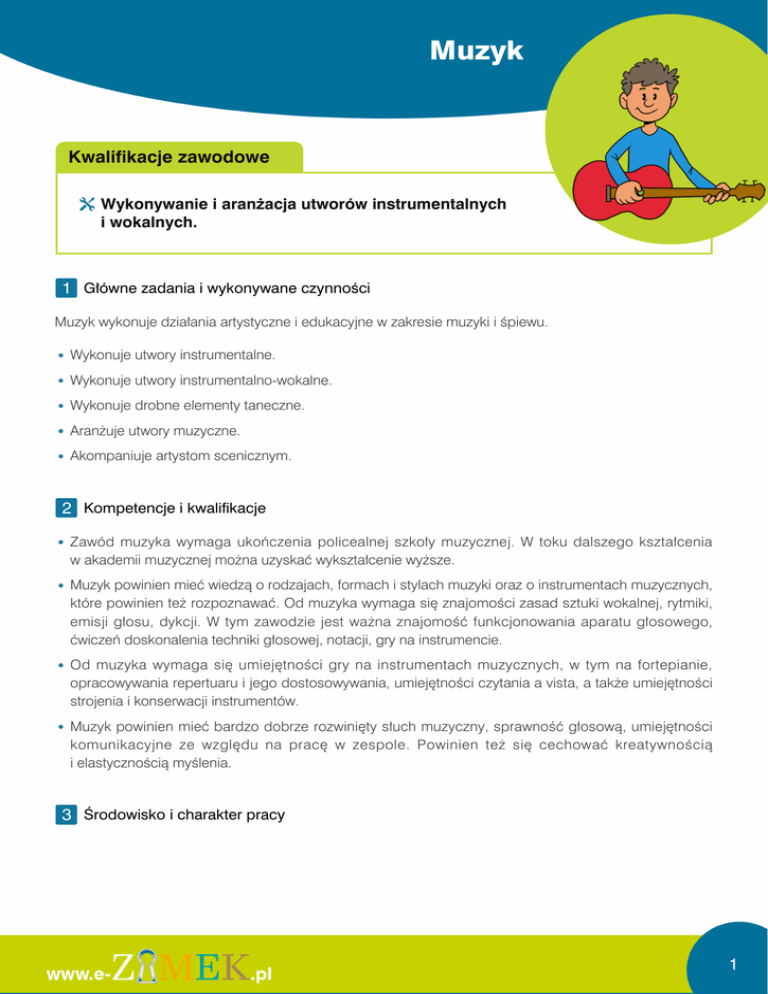 Muzyk Kwalifikacje zawodowe Wykonywanie i aranżacja utworów instrumentalnych i wokalnych. 1 Główne zadania i wykonywane czynności Muzyk wykonuje działania artystyczne i edukacyjne w zakresie muzyki i śpiewu. Wykonuje utwory instrumentalne. Wykonuje utwory instrumentalno-wokalne. Wykonuje drobne elementy taneczne. Aranżuje utwory muzyczne. Akompaniuje artystom scenicznym. 2 Kompetencje i kwalifikacje Zawód muzyka wymaga ukończenia policealnej szkoły muzycznej. W toku dalszego kształcenia w akademii muzycznej można uzyskać wykształcenie wyższe. Muzyk powinien mieć wiedzą o rodzajach, formach i stylach muzyki oraz o instrumentach muzycznych, które powinien też rozpoznawać. Od muzyka wymaga się znajomości zasad sztuki wokalnej, rytmiki, emisji głosu, dykcji. W tym zawodzie jest ważna znajomość funkcjonowania aparatu głosowego, ćwiczeń doskonalenia techniki głosowej, notacji, gry na instrumencie. Od muzyka wymaga się umiejętności gry na instrumentach muzycznych, w tym na fortepianie, opracowywania repertuaru i jego dostosowywania, umiejętności czytania a vista, a także umiejętności strojenia i konserwacji instrumentów. Muzyk powinien mieć bardzo dobrze rozwinięty słuch muzyczny, sprawność głosową, umiejętności komunikacyjne ze względu na pracę w zespole. Powinien też się cechować kreatywnością i elastycznością myślenia. 3 Środowisko i charakter pracy 1 Muzyk wykonuje czynności zawodowe w pomieszczeniach zamkniętych, a także na wolnym powietrzu. Czas pracy jest nienormowany, odbywa się przy świetle dziennym lub sztucznym, w stałych warunkach atmosferycznych. W pracy muzyk jest narażony na podwyższony poziom hałasu. Praca odbywa się przy użyciu instrumentów muzycznych. Muzyk wykonuje czynności zawodowe indywidualnie lub w zespole. Zawód wymaga doskonalenia umiejętności i poszerzania wiedzy. 2