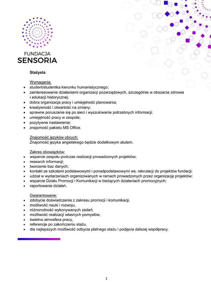 Stażysta Wymagania: student/studentka kierunku humanistycznego; zainteresowanie działaniami organizacji pozarządowych, szczególnie w obszarze zdrowia i edukacji historycznej; dobra organizacja pracy i umiejętność planowania; kreatywność i otwartość na zmiany; sprawne poruszanie się po sieci i wyszukiwanie potrzebnych informacji; umiejętność pracy w zespole; pozytywne nastawienie; znajomość pakietu MS Office. Znajomość języków obcych: Znajomość języka angielskiego będzie dodatkowym atutem. Zakres obowiązków: wsparcie zespołu podczas realizacji prowadzonych projektów; research informacji; tworzenie baz danych; kontakt ze szkołami podstawowymi i ponadpodstawowymi ws. rekrutacji do projektów fundacji; udział w wydarzeniach organizowanych w ramach prowadzonych przez organizację projektów; wsparcie Działu Promocji i Komunikacji w bieżących działaniach promocyjnych; raportowanie działań. Gwarantowane: zdobycie doświadczenia z zakresu promocji i komunikacji, możliwość nauki i rozwoju, różnorodność wykonywanych zadań; możliwość realizacji własnych pomysłów, świetna atmosfera pracy, referencje po zakończeniu stażu, dla najlepszych możliwość odbycia płatnego stażu i podjęcia dalszej współpracy. 1 Prosimy o nadsyłanie dokumentów aplikacyjnych (CV ze zdjęciem) na adres e-mail: [email protected] Informujemy, że skontaktujemy się z wybranymi kandydatami. W dokumentach należy zawrzeć klauzulę: Wyrażam zgodę na przetwarzanie moich danych osobowych dla potrzeb niezbędnych do realizacji procesu rekrutacji (zgodnie z Ustawą z dnia 29.08.1997 roku o Ochronie Danych Osobowych; tekst jednolity: Dz.U. z 2014r., poz.1182 ze zm.). 2