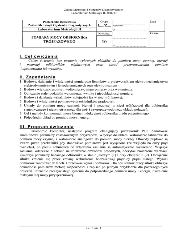 Zakład Metrologii i Systemów Diagnostycznych Laboratorium Metrologii II. 2016/17 Politechnika Rzeszowska Zakład Metrologii i Systemów Diagnostycznych Laboratorium Metrologii II POMIARY MOCY ODBIORNIKA TRÓJFAZOWEGO Grupa L..../Z.... Nr ćwicz. 10 1……………..................... kierownik 2......................................... 3......................................... Data Ocena 4......................................... I . Cel ćw iczeni a Celem ćwiczenia jest poznanie wybranych układów do pomiaru mocy czynnej, biernej i pozornej odbiorników trójfazowych oraz zasad przeprowadzenia pomiaru i opracowania ich wyników. I I. Zagad nieni a 1. Budowa, działanie i właściwości pomiarowe liczników z przetwornikiem elektromechanicznym elektrodynamicznym i ferrodynamicznych oraz elektronicznym 2. Budowa wielozakresowych woltomierzy, amperomierzy oraz watomierzy, 3. Obliczanie stałej podziałki watomierza, wyniku i niedokładności pomiaru, 4. Budowa i działanie wskaźników kolejności faz w sieci trójfazowej, 5. Budowa i właściwości pomiarowe przekładników prądowych, 6. Układy do pomiaru mocy czynnej, biernej i pozornej w sieci trójfazowej dla odbiornika symetrycznego i niesymetrycznego dla trój- i czteroprzewodowego układu połączeń, 7. Cel i metody kompensacji mocy biernej indukcyjnej odbiornika prądu przemiennego. 8. Półpośredni układ do pomiaru mocy i energii. I II . Pr ogr am ćw i cz enia Uruchomić komputer, następnie program obsługujący przetwornik P10. Zanotować znamionowe parametry zastosowanych przyrządów. Włączyć do układu watomierze tablicowe do pomiaru mocy czynnej i watomierze analogowe do pomiaru mocy biernej. Obwody prądowe są zwarte przez przekaźniki gdy stanowisko pomiarowe jest wyłączone (ze względu na duży prąd rozruchu), po pięciu sekundach od włączenia zasilania są automatycznie rozwierane. Włączyć zasilanie, odczekać 5 sekund na rozwarcie obwodów prądowych, odczytać zmierzone wartości. Zmierzyć parametry badanego odbiornika w stanie jałowym (1) i przy obciążeniu (2). Obciążenie silnika zmienia się przez zmianę wzbudzenia bocznikowej prądnicy prądu stałego. Wyniki pomiarów zanotować w tabeli. Opracować wyniki pomiarów. Dla obu stanów pracy silnika obliczyć dokładność pomiarów metodą niepewności i zapisać po jednym przykładzie dla poszczególnych obliczeń. Poznanie rzeczywistego systemu do półpośredniego pomiaru mocy i energii, określenie maksymalnej mocy przyłączeniowej. ćw.10 /str. 1 Zakład Metrologii i Systemów Diagnostycznych Laboratorium Metrologii II. 2016/17 I V. Pr zeb ieg ćw i cz eni a 1. Protokół pomiarów mocy czynnej, biernej i pozornej odbiornika trójfazowego 1.1. Układ pomiarowy i spis przyrządów Tablica 1. PDM przetwornica dwumaszynowa z trójfazowym silnikiem asynchronicznym o parametrach nazwa: napięcie prąd znamionowe: moc znamionowa: 1,6[A] (jednofazowe), 0,37[kW] znamionowe: Sg71-4B 220[V] (jednofazowe), 1,05[A] (trójfazowe) 380[V] (trójfazowe) prędkość znam.: Producent: znam. wsp. mocy: częstotliwość znam.: 0,77 50[Hz] 1360[obr/min] W1, W2 watomierz DP 5 znamionowa błąd podstawowy: zakresy nap.: zakres prądowy: I=(0-120)%In liczba ziaren: Pn=±3kW U=(0-120)%Un P=(0-140%)Pn: 3000 ±(0,5% wz+1c) Un=400V In=5A W3, W4 watomierz laboratoryjny symbol przetwornika: nazwa: LW-1 znamionowa liczba działek: n = 100dz zakres częstotliwości: 15…50…200 Hz znamionowy wsp. mocy: cos n = 1 zakresy napięciowe przeciążalność obw. zakresy prądowe In: 5, 10 A Un: nap.: 100, 200, 400 V (0,8…1…1,5) Un Pomiary mocy czynnej przetwornikiem P10: znamionowa błąd podstawowy zakresy nap. Pn=1999,9[W] liczba ziaren: U=(0-120)%Un P=(0-140%)Pn: 20000[z] ±(0,5% wm+0,2%zak) Un= 400,0[V] ćw.10 /str. 2 klasa dokładności: 0,5 rezyst. jednostk. obwodu nap.: RWUi = 150 /V przeciążalność obw. prąd.: (0…1…1,3) In zakres prądowy: I=(0-120)%In In=5[A] Zakład Metrologii i Systemów Diagnostycznych Laboratorium Metrologii II. 2016/17 Pomiary mocy biernej przetwornikiem P10: znamionowa błąd podstawowy Qn=1999,9[Var] liczba ziaren: Q=(0-140%)Qn 20000[z] ±(0,5% wm+0,2%zak) Pomiary mocy pozornej przetwornikiem P10: znamionowa błąd podstawowy Sn=1999,9[VA] liczba ziaren: S=(0-140%)Sn 20000[z] ±(0,5% wm+0,2%zak) zakresy nap. U=(0-120)%Un zakresy prądowe I=(0-120)%In Un= 400,0[V] In=5[A] zakresy nap. U=(0-120)%Un zakresy prądowe I=(0-120)%In Un=400[V] In=5[A] Pomiary THD U, THD I przetwornikiem P10 dla I=(0-130%)In , U=(0-130%)Un: znamionowa zakres pomiaru: błąd podstawowy: pasmo liczba ziaren: częstotliwości: 100[z] 0,2-100[%] ±5%wm+2c 47-52[Hz] Pomiary napięcia przetwornikiem P10: znamionowa zakres pomiaru liczba ziaren: napięcia: 4000[z] Un=400,0[V] U=(0-130%)Un Pomiary prądu przetwornikiem P10: znamionowa zakres pomiaru liczba ziaren: prądu: 5000[z] In=5,000[A] błąd podstawowy: ±(0,2% wm+0,1%zak) błąd podstawowy: ±(0,2% wm+0,1%zak) I=(0-130%)In A1, A2, A3 - amperomierze tablicowe: producent, zakres pomiaru błąd podstawowy: nazwa: prądu: Lumel, N24 In=5[A] ±(0,5% wm+1c) Nn: pasmo częstotliwości: 20-500[Hz] 6000[z] I=(0-120%)In Częstościomierz tablicowy: producent, nazwa: zakres pomiaru: Nn: Lumel, CA39 45-55[Hz] 10[dz] Tp1, Tp2 laboratoryjne przekładniki prądowe nazwa: prądy pierwotne: znam. prąd wtórny: Typ-JL3 I1n = 2[A] I2n =5[A] klasa dokładności: kl=0,5[%] klasa dokładności: kl = 2/5 1.2. Wyniki pomiarów i obliczeń Tab. 2. Dopuszczalne przeciążenie obwodów watomierzy obwód napięciowy obwód prądowy P10 cewka napięciowa P10 Un [V] 400 Udop [V] In [A] 5 Idop [A] Un [V] 200 ćw.10 /str. 3 Udop [V] cewka prądowa In [A] 5 Idop [A] Zakład Metrologii i Systemów Diagnostycznych Laboratorium Metrologii II. 2016/17 Stałe podziałki mierników i przekładnia znamionowa przekładnika prądowego: CP U n I n cos n n CQ 3 U n I n cos n n Tab. 3. Odczyty wskazań cyfrowych mierników tablicowych i ana