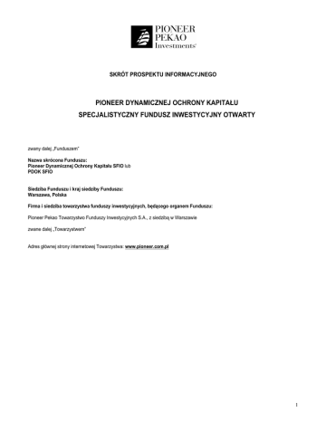SKRÓT PROSPEKTU INFORMACYJNEGO PIONEER DYNAMICZNEJ OCHRONY KAPITAŁU SPECJALISTYCZNY FUNDUSZ INWESTYCYJNY OTWARTY zwany dalej „Funduszem” Nazwa skrócona Funduszu: Pioneer Dynamicznej Ochrony Kapitału SFIO lub PDOK SFIO Siedziba Funduszu i kraj siedziby Funduszu: Warszawa, Polska Firma i siedziba towarzystwa funduszy inwestycyjnych, będącego organem Funduszu: Pioneer Pekao Towarzystwo Funduszy Inwestycyjnych S.A., z siedzibą w Warszawie zwane dalej „Towarzystwem” Adres głównej strony internetowej Towarzystwa: www.pioneer.com.pl 1 Rozdział I Dane o Funduszu 1. Data i numer wpisu Funduszu do rejestru funduszy inwestycyjnych Fundusz został wpisany do rejestru funduszy inwestycyjnych w dniu 26 kwietnia 2005 roku pod numerem RFi 187. 2. Czas trwania Funduszu Czas trwania Funduszu jest nieograniczony. 3. Cel inwestycyjny Funduszu Celem inwestycyjnym Funduszu jest osiąganie przychodu z lokowania Aktywów Funduszu oraz wzrost wartości Aktywów Funduszu w wyniku wzrostu wartości lokat. Fundusz poprzez odpowiedni dobór lokat wchodzących w skład portfela inwestycyjnego Funduszu dąży do tego, aby w dowolnym Dniu Wyceny Wartość Aktywów Netto Funduszu na Jednostkę Uczestnictwa, nie była niższa niż 90% maksymalnej Wartości Aktywów Netto na Jednostkę Uczestnictwa ogłoszonej przez Fundusz od dnia rozpoczęcia przez Fundusz działalności do Dnia Wyceny poprzedzającego dany Dzień Wyceny („Poziom minimalny”). Fundusz nie gwarantuje osiągnięcia celu inwestycyjnego. 4. Charakterystyka uznanego indeksu akcji lub dłużnych papierów wartościowych oraz stopień odzwierciedlenia indeksu przez Fundusz Nie dotyczy. 5. Zasady polityki inwestycyjnej Funduszu 5.1. Główne kategorie lokat Funduszu Aktywa Funduszu są lokowane głównie w dłużne papiery wartościowe oraz instrumenty rynku pieniężnego, a także w tytuły uczestnictwa emitowane przez fundusze zagraniczne oraz tytuły uczestnictwa emitowane przez instytucje wspólnego inwestowania mające siedzibę za granicą, w tym fundusze zagraniczne lub instytucje wspólnego inwestowania z grupy kapitałowej Towarzystwa, których celem inwestycyjnym jest średnio- i długoterminowy wzrost aktywów poprzez dokonywanie inwestycji na globalnym rynku akcji. W szczególności Fundusz będzie inwestował w tytuły uczestnictwa emitowane przez Pioneer Funds Luxemburg Investement Fund (Fonds Commun de Placement), działający jako instytucja zbiorowego inwestowania w zbywalne papiery wartościowe w rozumieniu Dyrektywy UCITS zwany dalej „Pioneer Funds”. Fundusz będzie dokonywać lokat w tytuły uczestnictwa subfunduszy Pioneer Funds, inwestujących swoje aktywa głównie w instrumenty udziałowe na różnych rynkach geograficznych na całym świecie. Proporcja między lokatami Funduszu w poszczególne rodzaje instrumentów finansowych jest uzależniona od decyzji Funduszu podejmowanej z uwzględnieniem strategii zabezpieczenia portfela, a także z uwzględnieniem warunków ekonomicznych i sytuacji na rynku papierów wartościowych, jak również celu inwestycyjnego określonego w art. 6 oraz limitów określonych w paragrafie poniższym. Zgodnie z prospektem informacyjnym Pioneer Funds, Pioneer Funds jest zarządzany przez Pioneer Asset Management S.A. z siedzibą w Luksemburgu będącą podmiotem z grupy kapitałowej Towarzystwa. Maksymalny poziom wynagrodzenia za zarządzanie aktywami Pioneer Funds pobieranego przez Pioneer Asset Management S.A. z siedzibą w Luksemburgu wynosi 1,6% od aktywów Pioneer Funds w skali roku. Fundusz nie będzie inwestować w tytuły uczestnictwa Pioneer Funds, od których pobierana jest dodatkowo opłata za efektywność od zarządzania. Fundusz jest zobowiązany podawać w rocznym sprawozdaniu finansowym stawkę wynagrodzenia za zarządzanie Funduszem pobieranego przez Towarzystwo oraz stawkę wynagrodzenia za zarządzanie Pioneer Funds pobieranego przez Pioneer Asset Management S.A. z siedzibą w Luksemburgu. Stawki wynagrodzenia za zarządzanie Pioneer Funds będą podawane na podstawie ostatnich dostępnych publicznie danych z prospektu informacyjnego lub sprawozdania finansowego Pioneer Funds. Aktywa Funduszu będą inwestowane w denominowane w walucie polskiej instrumenty finansowe o charakterze dłużnym, w tym papiery wartościowe dopuszczone do obrotu zorganizowanego lub będące w ofercie publicznej na terytorium Rzeczypospolitej Polskiej, oraz w instrumenty rynku pieniężnego emitowane lub wystawiane przez podmioty mające siedzibę na terytorium Rzeczypospolitej Polskiej, a także depozyty bankowe. Całkowita wartość lokat w inne niż określone wyżej składniki lokat, w szczególności instrumenty finansowe o charakterze udziałowym, w tym tytuły uczestnictwa funduszy zagranicznych lub instytucji wspólnego inwestowania, akcje, ekspozycja na indeksy giełdowe poprzez kontrakty terminowe, nie będzie większa niż 50% wartości Aktywów Funduszu. 5.2. Podstawowe kryteria doboru lokat do portfela inwestycyjnego Funduszu Polityka inwestycyjna Funduszu, w szczególności kryteria doboru lokat, będzie prowadzona przy zachowaniu zasady ograniczonego ryzyka dokonywanych lokat. Proces inwestycyjny będzie oparty na prognozach wskaźników makroekonomicznych i prognozach kierunku zmian rynkowych stóp procentowych. Dobór dłużnych papierów wartościowych dokonywany będzie przez pryzmat następujących ryzyk inwestycyjnych: stopy procentowej, płynności danego instrumentu finansowego oraz ryzyka związanego z wypłacalnością emitentów tych papierów. 2 Dobór pozostałych lokat Funduszu będzie uzależniony od oceny bezpieczeństwa tych lokat i kształtowania się ich rentowności w kontekście realizacji celu inwestycyjnego Funduszu. Część portfela Funduszu o charakterze udziałowym, będzie budowana głównie z jednostek uczestnictwa bądź tytułów uczestnictwa emitowanych przez instytucje wspólnego inwestowania i ze względu na ryzyko oraz oczekiwaną stopę zwr