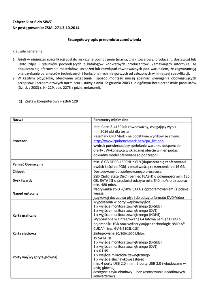 Załącznik nr 6 do SIWZ Nr postępowania: ZSMI.271.3.10.2014 Szczegółowy opis przedmiotu zamówienia Klauzule generalne 1. Jeżeli w niniejszej specyfikacji zostało wskazane pochodzenie (marka, znak towarowy, producent, dostawca) lub użyto zdjęć i rysunków pochodzących z katalogów konkretnych producentów, Zamawiający informuje, że dopuszcza się oferowanie materiałów, urządzeń lub rozwiązań równoważnych pod warunkiem, że zagwarantują one uzyskanie parametrów technicznych i funkcjonalnych nie gorszych od założonych w niniejszej specyfikacji. 2. W każdym przypadku, oferowane urządzenia i sposób montażu muszą spełniać wymagania obowiązujących przepisów i przedmiotowych norm oraz ustawy z dnia 12 grudnia 2003 r. o ogólnym bezpieczeństwie produktów (Dz. U. z 2003 r. Nr 229, poz. 2275 z późn. zmianami). 1) Zestaw komputerowy – sztuk 129 Nazwa Parametry minimalne Procesor Intel Core i3-4150 lub równoważny, osiągający wynik min.5056 pkt dla testu Passmark CPU Mark - na podstawie wyników ze strony: http://www.cpubenchmark.net/cpu_list.php wydruk potwierdzający spełnianie warunku dołączyć do oferty . Wykonawca w składanej ofercie winien podać dokładny model oferowanego podzespołu. Pamięć Operacyjna Chipset Dysk twardy Napęd optyczny Karta graficzna Karta sieciowa Porty we/wy (płyta główna) min. 8 GB DDR3 1600MHz CL9 (dopuszcza się zaoferowanie dwóch kości po 4GB) z możliwością rozszerzenia do 16 GB. Dostosowany do zaoferowanego procesora. SSD (Solid State Disc) (pamięć FLASH) o pojemności min. 120 GB, SATA III o prędkości odczytu min. 540 mb/s oraz zapisu min. 480 mb/s. Nagrywarka DVD +/-RW SATA z oprogramowaniem (z polską wersją językową) do: zapisu płyt i do odczytu formatu DVD-Video Wyposażona w porty wejścia/wyjścia 1 x wyjście monitora zewnętrznego (D-SUB) 1 x wyjście monitora zewnętrznego (DVI) 1 x wyjście monitora zewnętrznego (HDMI) Wyposażona w zintegrowaną 64 bitową pamięć DDR3 o pojemności 1GB oraz wykorzystująca technologię NVIDIA® CUDA™ (np. GV-N210SL-1GI) Zintegrowana 10/100/1000 Mbit/s 1x SATA III 1 x wyjście monitora zewnętrznego (D-SUB) 1 x wyjście monitora zewnętrznego (DVI) 1 x RJ-45 1 x wejście mikrofonu zewnętrznego 1 x wyjście słuchawkowe (stereo) min. 4 porty USB 2.0 i min. 2 porty USB 3.0 (wbudowane w płytę główną, dostępne z tyłu obudowy – bez zastosowania dodatkowych konwerterów) Wyposażenie dodatkowe System operacyjny Ekran (monitor) Mysz optyczna USB, z min. 3 przyciskami i rolką Klawiatura USB z niskim skokiem klawisza min. Licencja Microsoft Windows 8.1 Pro 64 bit OEM lub równoważny, tj. umożliwiający podłączenie komputera do domeny AD, zapewniający w 100% poprawne działanie aplikacji firmy Microsoft np. Microsoft Office 2000, 2003, 2007 wraz z obsługą wszystkich programów dedykowanych – stworzonych pod system Windows Vista, XP z zachowaniem wszystkich funkcjonalności, stabilności, poprawności działania programów, systemu. Ww. oprogramowanie systemowe (rozwiązanie równoważne) powinno zapewnić poprawną obsługę powszechnie używanych urządzeń peryferyjnych (drukarek, skanerów, kser). Zamawiający nie dopuszcza w systemie możliwości instalacji dodatkowych narzędzi emulujących działanie systemów Monitor LCD Rozmiar: Min. 21,5” Rozdzielczość nominalna: min. 1920x1080 Jasność: min. 250 cd/m2 Kontrast: min. 1000:1 Kąt widzenia pionowy: min. 160º Kąt widzenia poziomy: min. 170º Czas reakcji matrycy: maks. 5 ms Podstawowe złącza: DVI, D-SUB, HDMI Panel z podświetleniem LED (np. 22MP55HQ-P) Obudowa W kolorze ciemnym; Wyposażona w dodatkowy wentylator wolnoobrotowy wyciągający ciepłe powietrze z obudowy; Możliwość beznarzędziowej obsługi; 2 x USB, wejścia na mikrofon i słuchawki dostępne z przodu obudowy; Wyposażona w standardowy zasilacz ATX zapewniający wysoką stabilność działania zaoferowanego komputera Gwarancja Min. 2 lata w miejscu użytkowania sprzętu (na cały zestaw) Sterowniki Inne wymogi Nośniki ze wszystkimi aktualnymi sterownikami i oprogramowaniem do obsługi wszystkich urządzeń w zestawie, umożliwiającymi poprawne zainstalowanie systemu. Dysk twardy podzielony na dwie równe partycje; System operacyjny wraz ze sterownikami zainstalowany na komputerze; Komputer, monitor, klawiatura i mysz w jednolitej kolorystyce; Możliwość zabezpieczenia komputera hasłem na poziomie biosu (hasło administratora i użytkownika) ; Wszystkie zestawy mają mieć identyczną konfigurację ; Przewody zasilające + hdmi Dołączone nośniki oprogramowania systemowego i sterowników, umożliwiające ponowną instalację systemu. 2) Laptop – sztuk 41 Nazwa Parametry min. Intel Core i3-3110M Procesor Pamięć Operacyjna Chipset Dysk twardy Napęd optyczny Karta graficzna Karta muzyczna Karta sieciowa Porty we/wy (płyta główna) Bateria (akumulator) Waga System operacyjny lub równoważny, osiągający wynik min.3064 pkt dla testu Passmark CPU Mark - na podstawie wyników ze strony: http://www.cpubenchmark.net/cpu_list.php wydruk potwierdzający spełnianie warunku dołączyć do oferty . Wykonawca w składanej ofercie winien podać dokładny model oferowanego podzespołu. min. 4GB DDR3, możliwość rozszerzenia pamięci RAM do min. 8GB Dostosowany do zaoferowanego procesora. 1000 GB SATA, 5400 obr. Nagrywarka DVD +/-RW z oprogramowaniem (z polską wersją językową) do: zapisu płyt i do odczytu formatu DVDVideo Układ graficzny osiągający w 3DMark06 min. 7993 pkt. na podstawie wyników ze strony: http://www.notebookcheck.pl/Mobilne-karty-graficznerozpiska-osiagow.1174.0.html 1024 MB DDR3 (pamięć własna) (np. NVIDIA GeForce 710M) zintegrowana, obsługa audio w formacie HD – możliwość podłączenia zewnętrznego mikrofonu i słuchawek. LAN: wbudowana karta sieciowa 10/100/1000 – złącze RJ 45, - WiFi: wbudowana karta sieciowa, pracująca w standardzie b/g/n, 1x wejście zasilania DC
