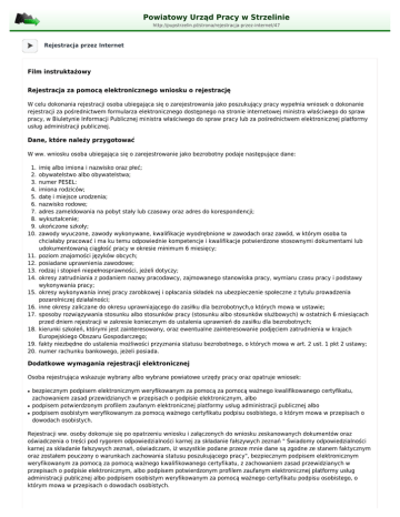 Powiatowy Urząd Pracy w Strzelinie http://pupstrzelin.pl/strona/rejestracja-przez-internet/47 Rejestracja przez Internet Film instruktażowy Rejestracja za pomocą elektronicznego wniosku o rejestrację W celu dokonania rejestracji osoba ubiegająca się o zarejestrowania jako poszukujący pracy wypełnia wniosek o dokonanie rejestracji za pośrednictwem formularza elektronicznego dostępnego na stronie internetowej ministra właściwego do spraw pracy, w Biuletynie Informacji Publicznej ministra właściwego do spraw pracy lub za pośrednictwem elektronicznej platformy usług administracji publicznej. Dane, które należy przygotować W ww. wniosku osoba ubiegająca się o zarejestrowanie jako bezrobotny podaje następujące dane: 1. 2. 3. 4. 5. 6. 7. 8. 9. 10. 11. 12. 13. 14. 15. 16. 17. 18. 19. 20. imię albo imiona i nazwisko oraz płeć; obywatelstwo albo obywatelstwa; numer PESEL: imiona rodziców; datę i miejsce urodzenia; nazwisko rodowe; adres zameldowania na pobyt stały lub czasowy oraz adres do korespondencji; wykształcenie; ukończone szkoły; zawody wyuczone, zawody wykonywane, kwalifikacje wyodrębnione w zawodach oraz zawód, w którym osoba ta chciałaby pracować i ma ku temu odpowiednie kompetencje i kwalifikacje potwierdzone stosownymi dokumentami lub udokumentowaną ciągłość pracy w okresie minimum 6 miesięcy; poziom znajomości języków obcych; posiadane uprawnienia zawodowe; rodzaj i stopień niepełnosprawności, jeżeli dotyczy; okresy zatrudniania z podaniem nazwy pracodawcy, zajmowanego stanowiska pracy, wymiaru czasu pracy i podstawy wykonywania pracy; okresy wykonywania innej pracy zarobkowej i opłacania składek na ubezpieczenie społeczne z tytułu prowadzenia pozarolniczej działalności; inne okresy zaliczane do okresu uprawniającego do zasiłku dla bezrobotnych,o których mowa w ustawie; sposoby rozwiązywania stosunku albo stosunków pracy (stosunku albo stosunków służbowych) w ostatnich 6 miesiącach przed dniem rejestracji w zakresie koniecznym do ustalenia uprawnień do zasiłku dla bezrobotnych; kierunki szkoleń, którymi jest zainteresowany, oraz ewentualne zainteresowanie podjęciem zatrudnienia w krajach Europejskiego Obszaru Gospodarczego; fakty niezbędne do ustalenia możliwości przyznania statusu bezrobotnego, o których mowa w art. 2 ust. 1 pkt 2 ustawy; numer rachunku bankowego, jeżeli posiada. Dodatkowe wymagania rejestracji elektronicznej Osoba rejestrująca wskazuje wybrany albo wybrane powiatowe urzędy pracy oraz opatruje wniosek: ● ● ● bezpiecznym podpisem elektronicznym weryfikowanym za pomocą za pomocą ważnego kwalifikowanego certyfikatu, zachowaniem zasad przewidzianych w przepisach o podpisie elektronicznym, albo podpisem potwierdzonym profilem zaufanym elektronicznej platformy usług administracji publicznej albo podpisem osobistym weryfikowanym za pomocą ważnego certyfikatu podpisu osobistego, o którym mowa w przepisach o dowodach osobistych. Rejestracji ww. osoby dokonuje się po opatrzeniu wniosku i załączonych do wniosku zeskanowanych dokumentów oraz oświadczenia o treści pod rygorem odpowiedzialności karnej za składanie fałszywych zeznań " Świadomy odpowiedzialności karnej za składanie fałszywych zeznań, oświadczam, iż wszystkie podane przeze mnie dane są zgodne ze stanem faktycznym oraz zostałem pouczony o warunkach zachowania statusu poszukującego pracy", bezpiecznym podpisem elektronicznym weryfikowanym za pomocą za pomocą ważnego kwalifikowanego certyfikatu, z zachowaniem zasad przewidzianych w przepisach o podpisie elektronicznym, albo podpisem potwierdzonym profilem zaufanym elektronicznej platformy usług administracji publicznej albo podpisem osobistym weryfikowanym za pomocą ważnego certyfikatu podpisu osobistego, o którym mowa w przepisach o dowodach osobistych. Kiedy rejestracja jest nieskuteczna? Rejestracji osoby ubiegającej się o zarejestrowanie jako bezrobotny albo poszukujący pracy nie dokonuje się w przypadku: ● ● niestawiennictwa w powiatowym urzędzie pracy w wyznaczonym terminie do rejestracji, nieopatrzenia wniosku o rejestrację jednym z ww. podpisów