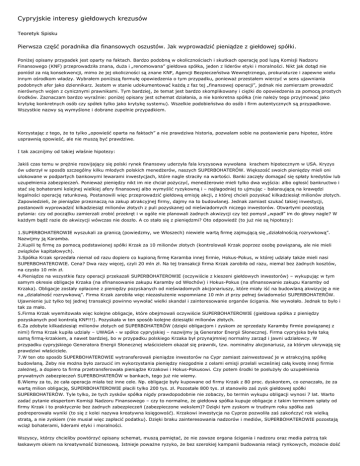 Cypryjskie interesy giełdowych krezusów Teoretyk Spisku Pierwsza część poradnika dla finansowych oszustów. Jak wyprowadzić pieniądze z giełdowej spółki. Poniżej opisany przypadek jest oparty na faktach. Bardzo podobną w okolicznościach i skutkach operację pod lupą Komisji Nadzoru Finansowego (KNF) przeprowadziła znana, duża i „renomowana” giełdowa spółka, jeden z liderów etyki i moralności. Nikt jak dotąd nie poniósł za nią konsekwencji, mimo że jej okoliczności są znane KNF, Agencji Bezpieczeństwa Wewnętrznego, prokuraturze i zapewne wielu innym ośrodkom władzy. Wybrałem poniższą formułę opowiedzenia o tym przypadku, ponieważ przestałem wierzyć w sens ujawniania podobnych afer jako dziennikarz. Jestem w stanie udokumentować każdą z faz tej „finansowej operacji”, jednak nie zamierzam prowadzić nierównych wojen z cynicznymi prawnikami. Tym bardziej, że temat jest bardzo skomplikowany i ciężki do opowiedzenia za pomocą prostych środków. Zaznaczam bardzo wyraźnie: poniżej opisany jest schemat działania, a nie konkretna spółka (nie należy tego przyjmować jako krytykę konkretnych osób czy spółek tylko jako krytykę systemu). Wszelkie podobieństwa do osób i firm autentycznych są przypadkowe. Wszystkie nazwy są wymyślone i dobrane zupełnie przypadkiem. Korzystając z tego, że to tylko „opowieść oparta na faktach” a nie prawdziwa historia, pozwalam sobie na postawienie paru hipotez, które usprawnią opowieść, ale nie muszą być prawdziwe. I tak zacznijmy od takiej właśnie hipotezy: Jakiś czas temu w prężnie rozwijający się polski rynek finansowy uderzyła fala kryzysowa wywołana krachem hipotecznym w USA. Kryzys ów uderzył w sposób szczególny kilku młodych polskich menedżerów, naszych SUPERBOHATERÓW. Większość swoich pieniędzy mieli oni ulokowane w podpartych bankowymi lewarami inwestycjach, które nagle straciły na wartości. Banki zaczęły domagać się spłaty kredytów lub uzupełnienia zabezpieczeń. Ponieważ pieniędzy nikt im nie chciał pożyczyć, menedżerowie mieli tylko dwa wyjścia: albo ogłosić bankructwo i stać się bohaterami kolejnej wielkiej afery finansowej albo wymyślić ryzykowną i – najłagodniej to ujmując - balansującą na krawędzi legalności operację ratunkową. Postanowili więc przeprowadzić giełdową emisję akcji, z której chcieli pozyskać kilkadziesiąt milionów złotych. Zapowiedzieli, że pieniądze przeznaczą na zakup atrakcyjnej firmy, dajmy na to budowlanej. Jednak zamiast szukać takiej inwestycji, postanowili wyprowadzić kilkadziesiąt milionów złotych z puli pozyskanej od nieświadomych niczego inwestorów. Otwartymi pozostają pytania: czy od początku zamierzali zrobić przekręt i w ogóle nie planowali żadnych akwizycji czy też pomysł „wpadł” im do głowy nagle? W każdym bądź razie do akwizycji wówczas nie doszło. A co stało się z pieniędzmi? Oto odpowiedź (to już nie są hipotezy): 1.SUPERBOHATEROWIE wyszukali za granicą (powiedzmy, we Włoszech) niewiele wartą firmę zajmującą się „działalnością rozrywkową”. Nazwijmy ją Karamba. 2.Kupili tę firmę za pomocą podstawionej spółki Krzak za 10 milionów złotych (kontrolowali Krzak poprzez osobę powiązaną, ale nie mieli związków kapitałowych). 3.Spółka Krzak sprzedała niemal od razu dopiero co kupioną firmę Karamba innej firmie, Hokus-Pokus, w której udziały także mieli nasi SUPERBOHATEROWIE. Cena? Dwa razy więcej, czyli 20 mln zł. Na tej transakcji firma Krzak zarobiła od razu, niemal bez żadnych kosztów, na czysto 10 mln zł. 4.Pieniądze na wszystkie fazy operacji przekazali SUPERBOHATEROWIE (oczywiście z kieszeni giełdowych inwestorów) – wykupując w tym samym okresie obligacje Krzaka (na sfinansowanie zakupu Karamby od Włochów) i Hokus-Pokus (na sfinansowanie zakupu Karamby od Krzaka). Obligacje zostały opłacone z pieniędzy pozyskanych od nieświadomych akcjonariuszy, które miały iść na budowlaną akwizycję a nie na „działalność rozrywkową”. Firma Krzak zarobiła więc niezasłużenie wspomniane 10 mln zł przy pełnej świadomości SUPERBOHATERÓW. Ujawnienie już tylko tej jednej transakcji powinno wywołać wielki skandal i zainteresowanie organów ścigania. Nie wywołało. Jednak to było i tak za mało. 5.Firma Krzak wyemitowała więc kolejne obligacje, które obejmowali oczywiście SUPERBOHATEROWIE (giełdowa spółka z pieniędzy pozyskanych pod kontrolą KNF!!!). Pozyskała w ten sposób kolejne dziesiątki milionów złotych. 6.Za zdobyte kilkadziesiąt milionów złotych od SUPERBOHATERÓW (dzięki obligacjom i zyskom ze sprzedaży Karamby firmie powiązanej z nimi) firma Krzak kupiła udziały – UWAGA - w spółce cypryjskiej – nazwijmy ją Generator Energii Słonecznej. Firma cypryjska była taką samą firmą-krzakiem, a nawet bardziej, bo w przypadku polskiego Krzaka był przynajmniej normalny zarząd i jawni udziałowcy. W przypadku cypryjskiego Generatora Energii Słonecznej właścicielem okazał się prawnik, tzw. nominalny akcjonariusz, za którym ukrywają się prawdziwi właściciele. 7.W ten oto sposób SUPERBOHATEROWIE wytransferowali pieniądze inwestorów na Cypr zamiast zainwestować je w atrakcyjną spółkę budowlaną. Żeby nie można było zarzucić im wykorzystania pieniędzy niezgodnie z celami emisji przelali wcześniej całą kwotę innej firmie zależnej, a dopiero ta firma przetransferowała pieniądze Krzakowi i Hokus-Pokusowi. Czy potem środki te posłużyły do uzupełnienia prywatnych zabezpieczeń SUPERBOHATERÓW w bankach, tego już nie wiemy. 8.Wiemy za to, że cała operacja miała też inne cele. Np. obligacje były kupowane od firmy Krzak z 80 proc. dyskontem, co oznaczało, że za wartą milion obligację, SUPERBOHATEROWIE płacili tylko 200 tys. zł. Pozostałe 800 tys. zł stanowiło zaś zysk giełdowej spółki SUPERBOHATERÓW. Tyle tylk
