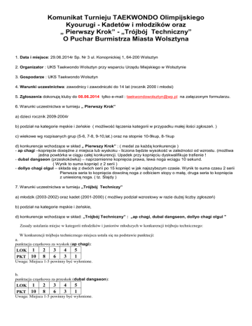 Komunikat Turnieju TAEKWONDO Olimpijskiego Kyourugi - Kadetów i młodzików oraz „ Pierwszy Krok” - „Trójbój Techniczny” O Puchar Burmistrza Miasta Wolsztyna 1. Data i miejsce: 29.06.2014r Sp. Nr 3 ul. Konopnickiej 1, 64-200 Wolsztyn 2. Organizator : UKS Taekwondo Wolsztyn przy wsparciu Urzędu Miejskiego w Wolsztynie 3. Gospodarze : UKS Taekwondo Wolsztyn 4. Warunki uczestnictwa: zawodnicy i zawodniczki do 14 lat (rocznik 2000 i młodsi) 5. Zgłoszenia dokonują kluby do 08.06.2014 tylko e-mail : [email protected] na załączonym formularzu. 6. Warunki uczestnictwa w turnieju „ Pierwszy Krok” a) dzieci rocznik 2009-2004r b) podział na kategorie męskie i żeńskie ( możliwość łączenia kategorii w przypadku małej ilości zgłoszeń. ) c) wiekowe wg rozpisanych grup (5-6, 7-8, 9-10,lat.) oraz na stopnie 10-9kup, 8-1kup d) konkurencje wchodzące w skład „ Pierwszy Krok” : ( medal za każdą konkurencje ) - ap chagi –kopnięcie dosiężne z miejsca lub wyskoku - liczona będzie wysokość w zależności od wzrostu. (możliwa jedna powtórka w ciągu całej konkurencji. Upadek przy kopnięciu dyskwalifikuje trafienie ! - dubal dangseon (przeskokówka) – naprzemienne kopnięcia prawa, lewa noga wciągu 10 sekund. ( Wynik to suma kopnięć z 2 serii ) - dollyo chagi olgul – składa się z dwóch serii po 15 kopnięć w jak najszybszym czasie. Wynik to suma czasu 2 serii Pierwsza seria to kopnięcia dowolną noga z odbiciem stopy o matę, druga seria to kopnięcia z uniesioną noga. ( tz. Slajdy ) 7. Warunki uczestnictwa w turnieju „Trójbój Techniczy” a) młodzik (2003-2002) oraz kadet (2001-2000) ( możliwy podział wzrostowy w razie dużej liczby zgłoszeń) b) podział na kategorie męskie i żeńskie, d) konkurencje wchodzące w skład: „Trójbój Techniczny” : „ap chagi, dubal dangseon, dollyo chagi olgul " Zasady ustalania miejsc w kategorii młodzików i juniorów młodszych w konkurencji trójboju technicznego: W konkurencji trójboju technicznego miejsca ustala się na podstawie punktacji: a. punktacja cząstkowa za wyskok (ap chagi): LOK 1 PKT 10 2 8 3 6 4 3 5 1 Uwaga: Miejsca 1-5 powinny być wyłonione. b. punktacja cząstkowa za przeskok (dubal dangseon): LOK 1 PKT 10 2 8 3 6 4 3 5 1 Uwaga: Miejsca 1-5 powinny być wyłonione. c. punktacja cząstkowa za (dollyo chagi olgul): LOK 1 PKT 10 2 8 3 6 4 3 5 1 Uwaga: Miejsca 1-5 powinny być wyłonione. Do końcowej klasyfikacji medalowej w trójboju brana jest suma punktów ze wszystkich trzech konkurencji 8. Kyorugi- walka sportowa regulamin PZTO wg kat wag. Zawody rozgrywane będą na elektronicznym systemie liczenia punktów Dae-do, w systemie pucharowy z rozgrywaniem 3 miejsca. Młodzik min.8kup wg przepisów PZTO : (czas trwania walki 2 x 1,5 min- 30 sek przerwy) K: -30kg, -34kg,-37kg ,-40kg,-43kg,-46kg,-50kg,+50kg M: -30kg, -34kg,-37kg ,-40kg,-43kg,-46kg,-50kg,+50kg Kadetów min 7 kup wg przepisów PZTO : (czas trwania walki 3 x 1,5 min- 30 sek przerwy) K: -37kg, -41kg, -44kg, -47kg, -51kg, -55kg, -59kg, +59kg M: -37kg, -41kg, -45kg, -49kg, -53kg, -57kg, -61kg, -65kg, +65kg 9. Regulamin i warunki uczestnictwa: a) opłata startowa za zawodnika 20zł konkurencja sprawnościowa oraz konkurencja kyourugi - walka, start w obydwu konkurencjach opłata startowa 30zł b) opłata startowa płatna organizatorowi do 13.06.2014r 23:59 Rezygnacje i zmiany po tym terminie nie będą uwzględniane. c) zawodników biorących udział w zawodach ubezpieczają macierzyste kluby. Organizator nie ponosi odpowiedzialności w przypadku wypadków i ich następstw. d) Organizator zastrzega sobie prawo do zmian podanych kategorii w zależności od liczby zgłoszeń. e) Gospodarze proszą o przyjęcie zasady 1 opiekun na 10 zawodników. Wszyscy uczestnicy poruszający się po sali będą posiadać identyfikatory i muszą mieć obuwie sportowe. 10. Warunki przyznawania miejsc drużynowo: Dzieci w każdej konkurencji zdobywają punktu od 0-6 . ( 1m-6 pkt. 2m-3 pkt. 3m-1.)Suma wszystkich punktów zdobytych przez zawodników z danego klubu decyduje o zdobytym miejscu drużynowym w turnieju. 11. Program Turnieju : 8/30:9/30 przyjazd, rejestracja ekip 10/00 Oficjalne otwarcie turnieju 10/20 rozpoczęcie turnieju „Pierwszy Krok” , „Trójbój Techniczny” ,konkurencja kyorugi dekoracja konkurencji „Pierwszy Krok” zaraz po zakończeniu konkurencji 12. Inne: Dla każdego zawodnika dyplom uczestnictwa. Medale za miejsca 1-3 .